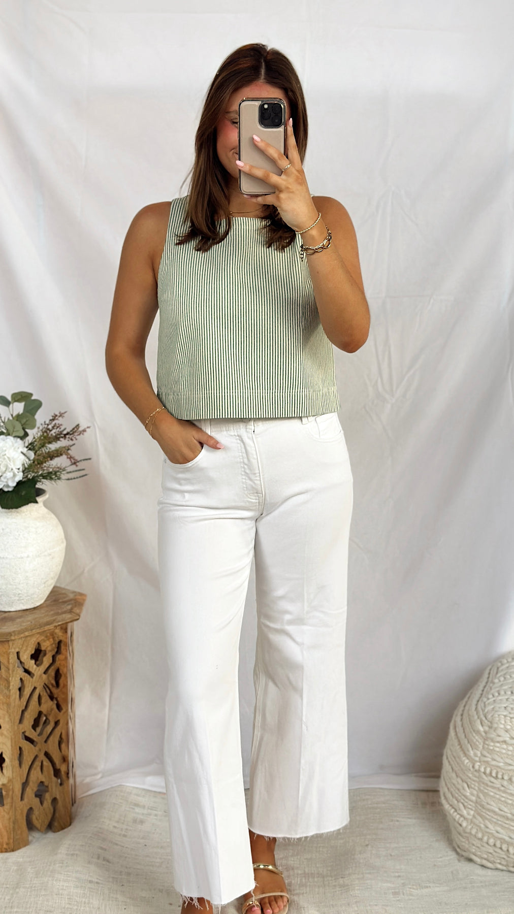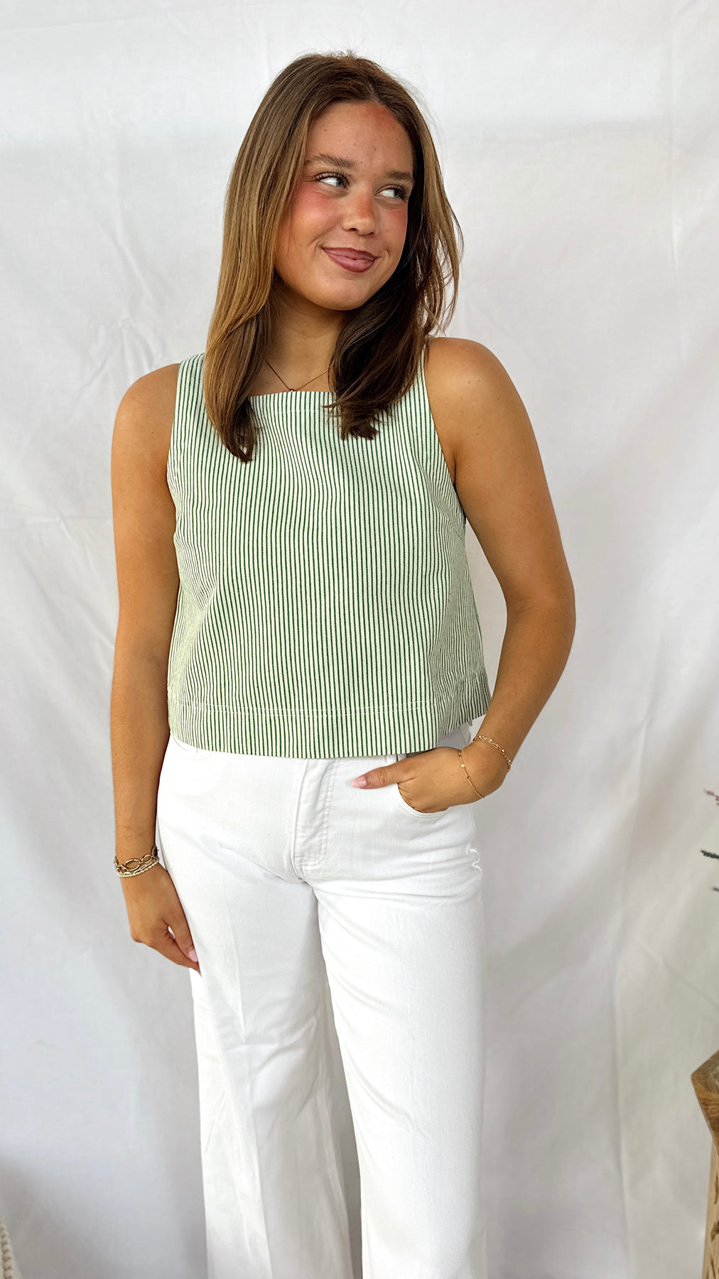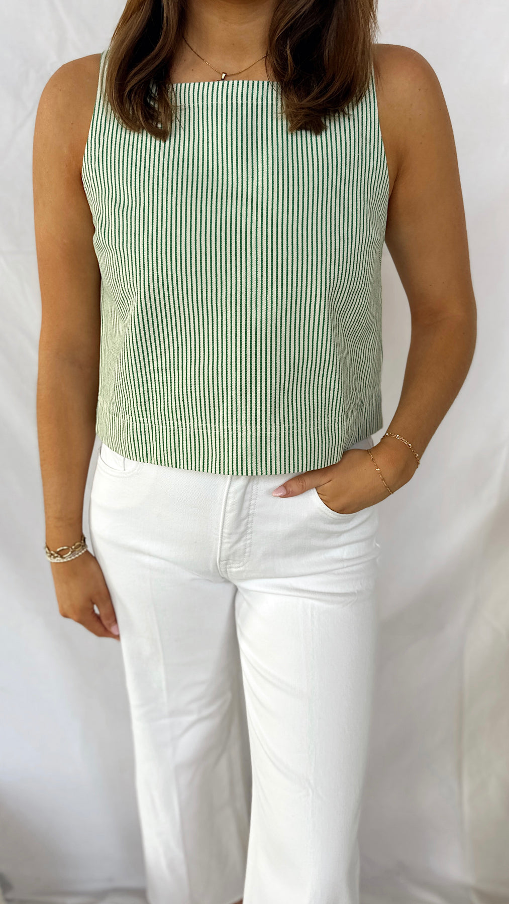 The Spring Fling Top features a breezy sleeveless silhouette with a flattering square neckline, perfect for warm-weather styling. Crafted in a denim-inspired fabric with delicate green thin stripes, this versatile piece offers a fresh, casual aesthetic. Layer it over basics or wear solo for effortless spring appeal. The structured denim feel provides durability while maintaining a lightweight, comfortable fit ideal for everyday wear.
