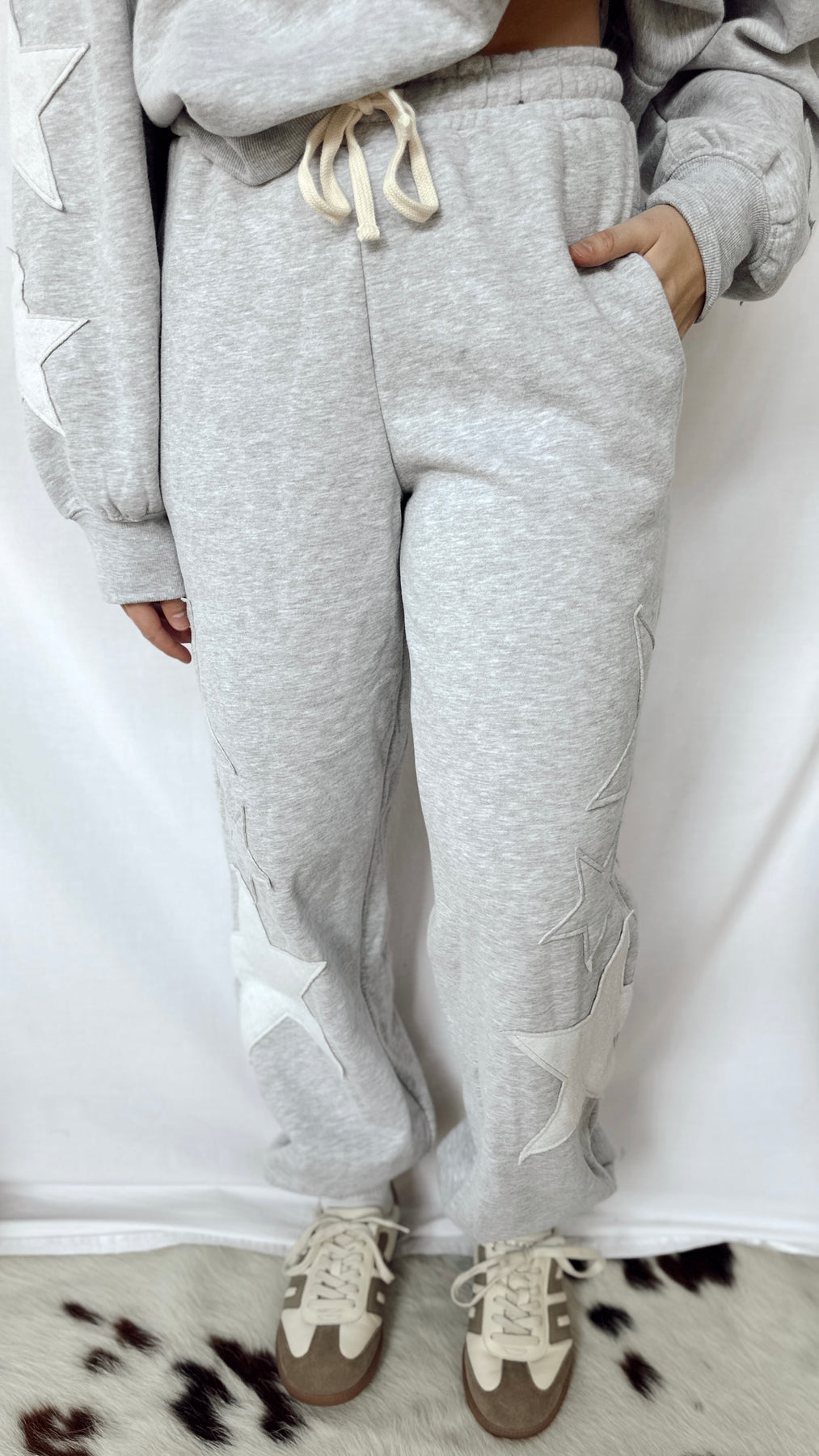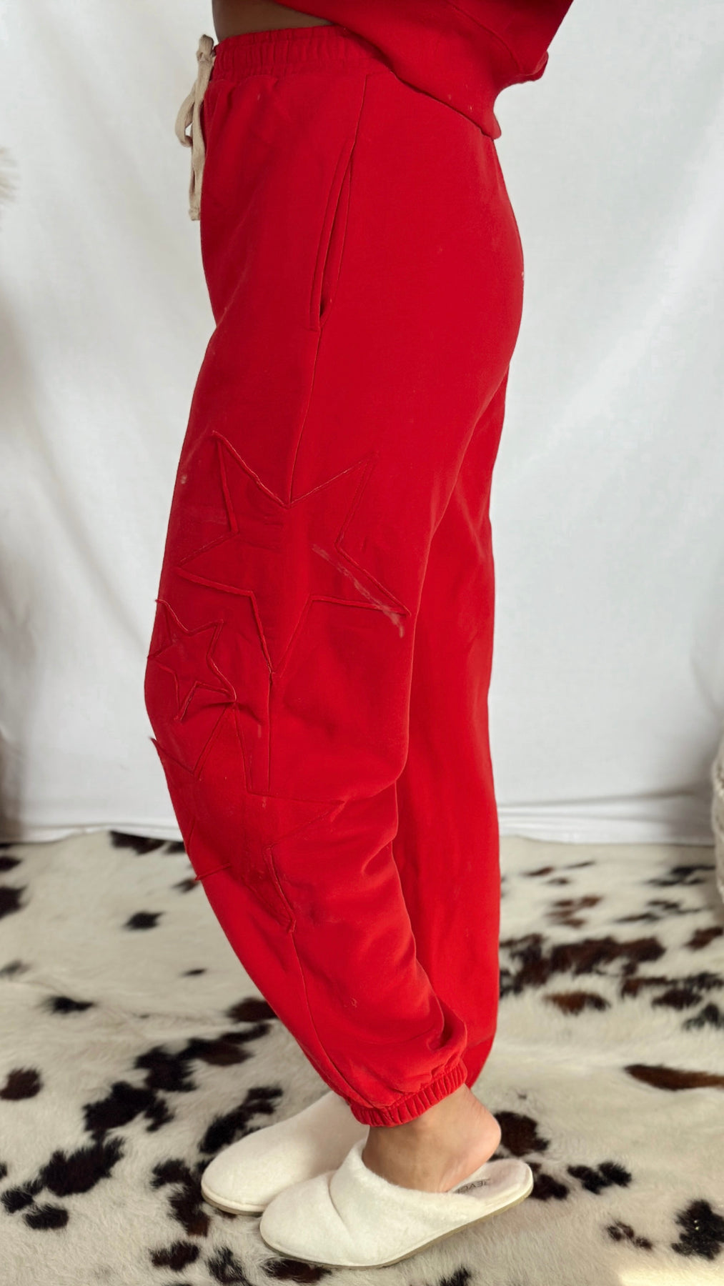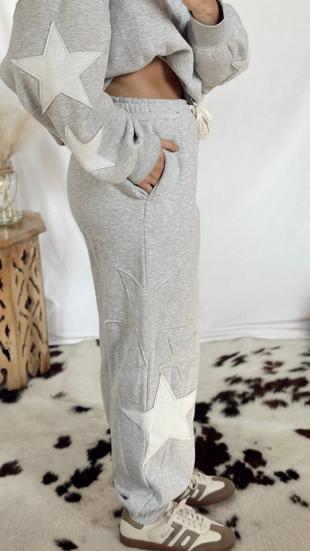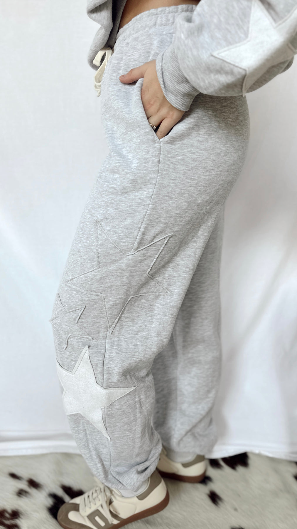 The Staria Sweatpants bring cozy comfort with a playful touch, featuring star patches that brighten up your look. The adjustable drawstring waist ensures a perfect fit, making these sweatpants ideal for relaxing at home or running errands in style.