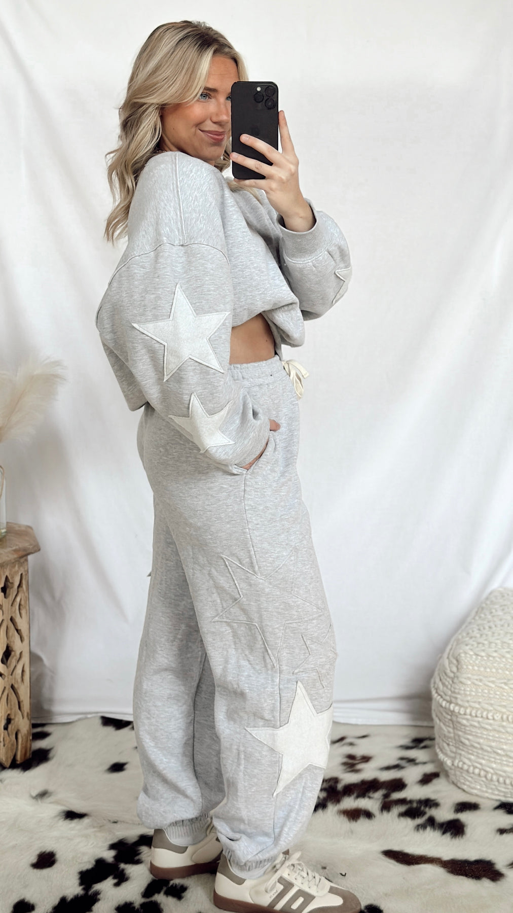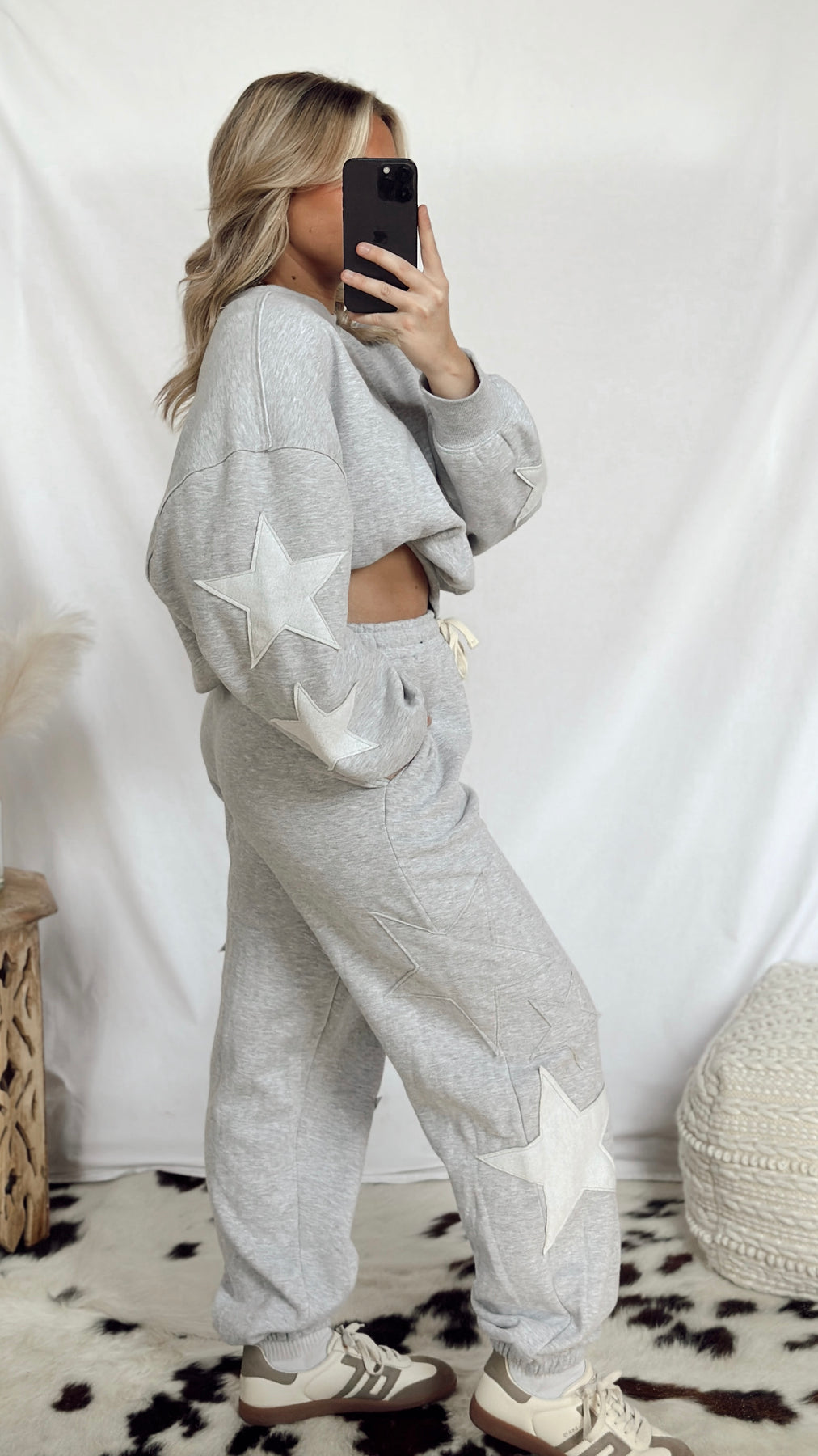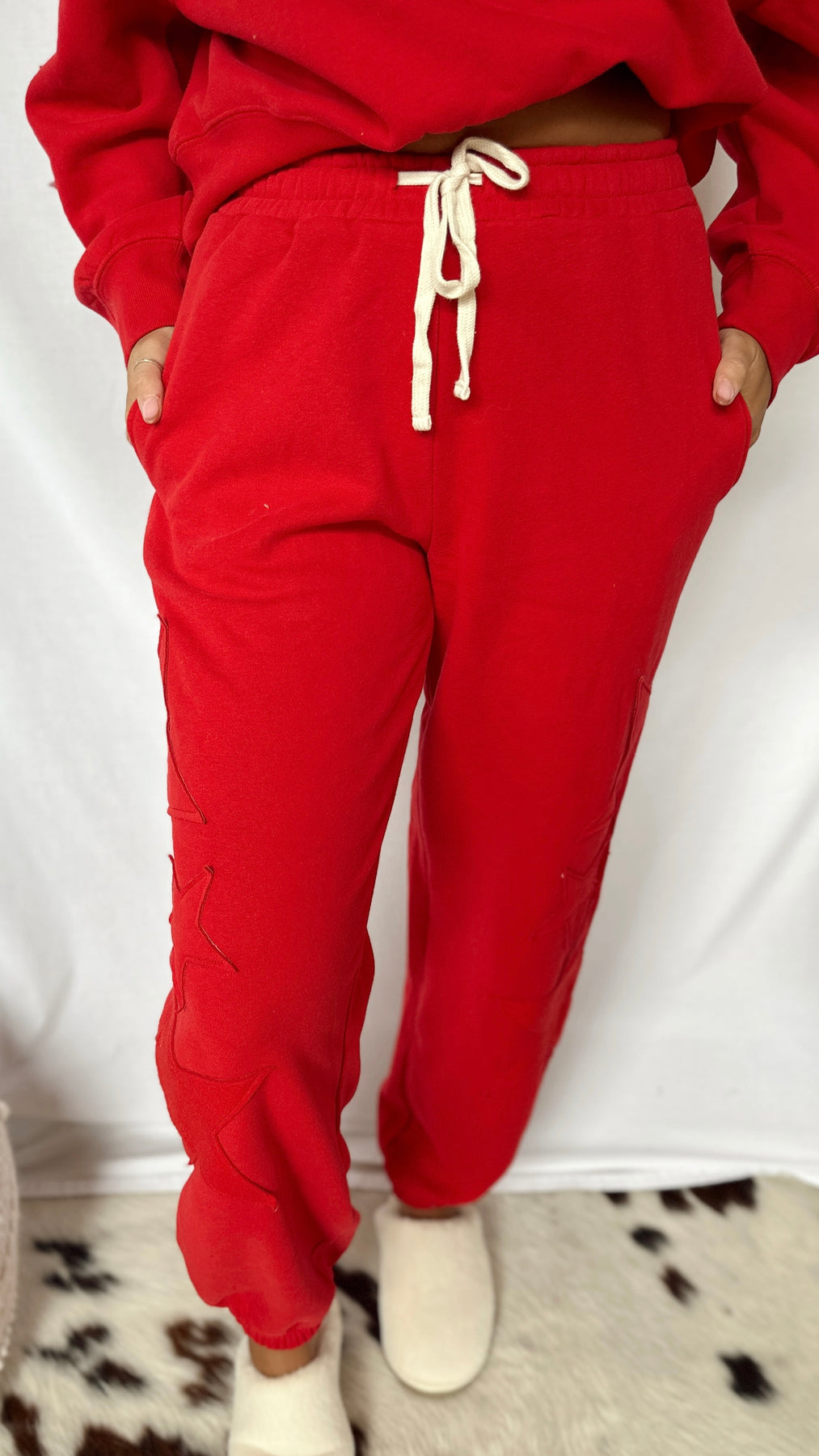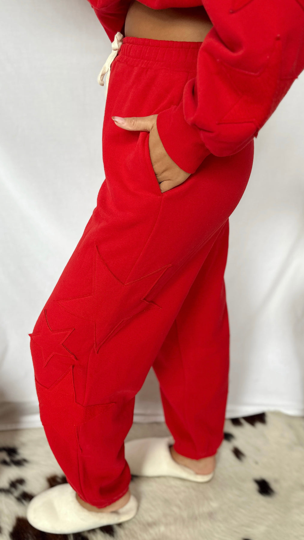 The Staria Sweatpants bring cozy comfort with a playful touch, featuring star patches that brighten up your look. The adjustable drawstring waist ensures a perfect fit, making these sweatpants ideal for relaxing at home or running errands in style.
