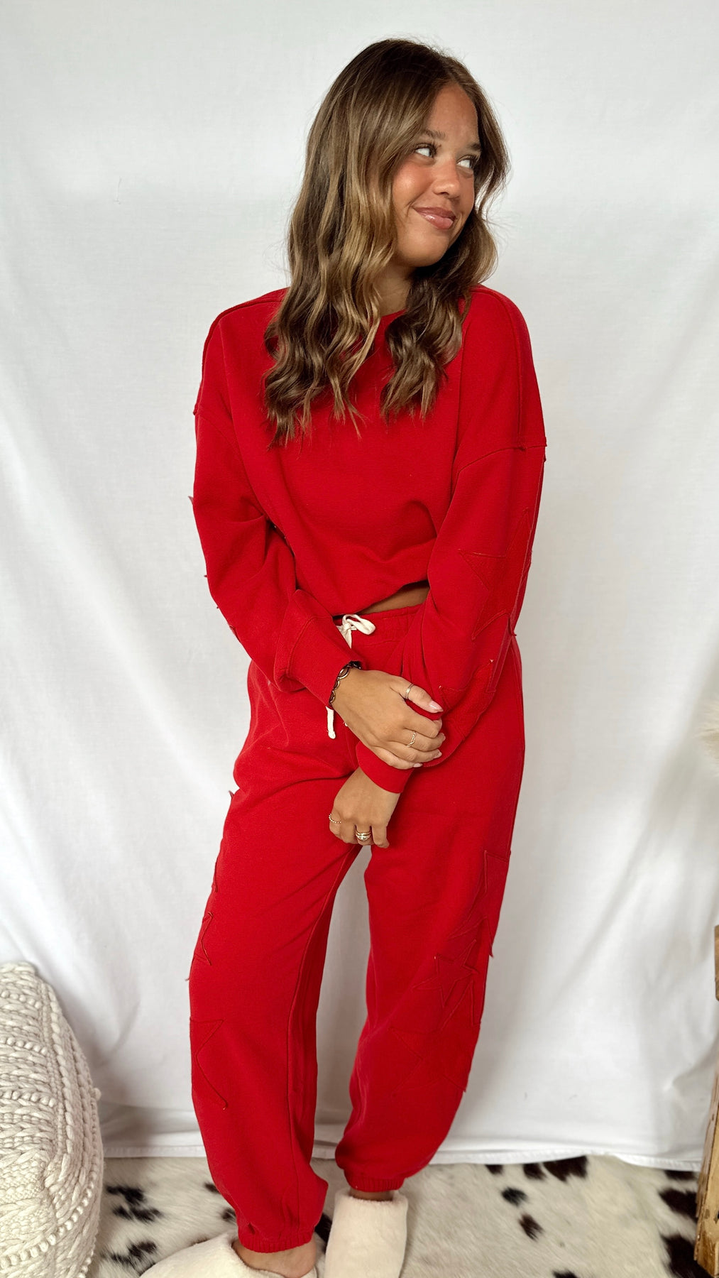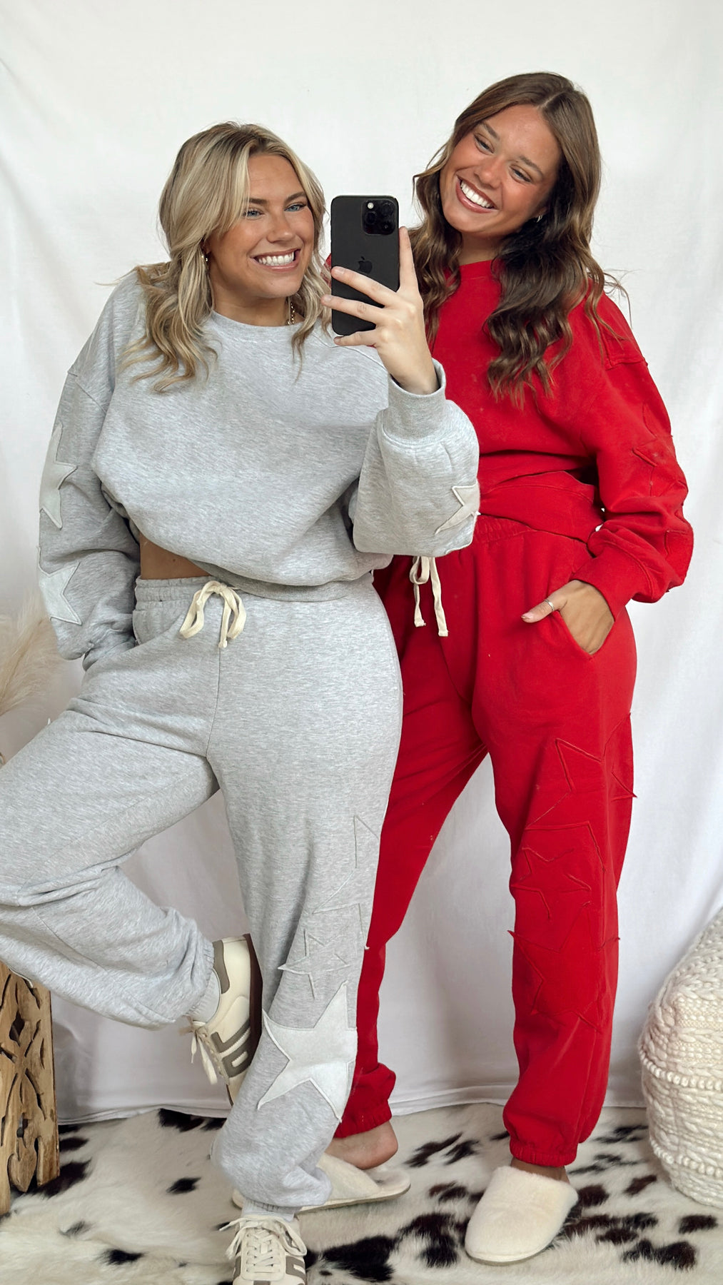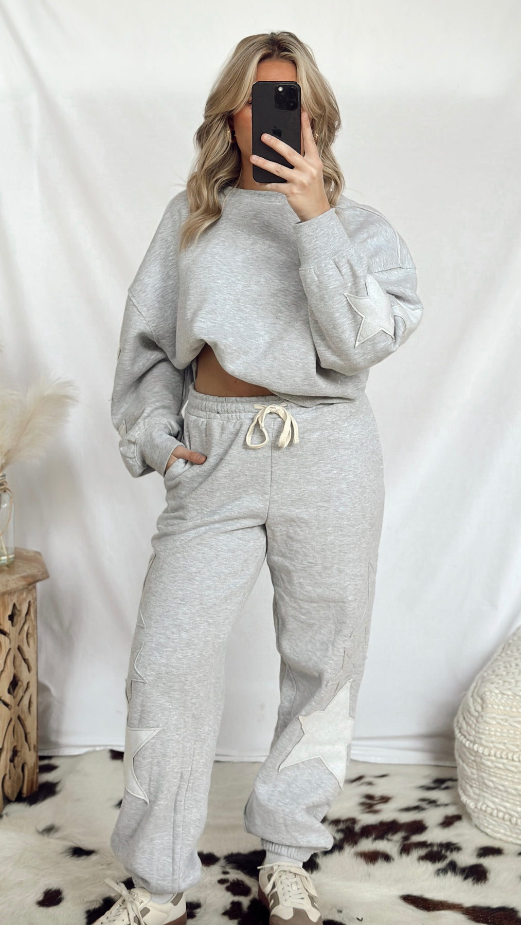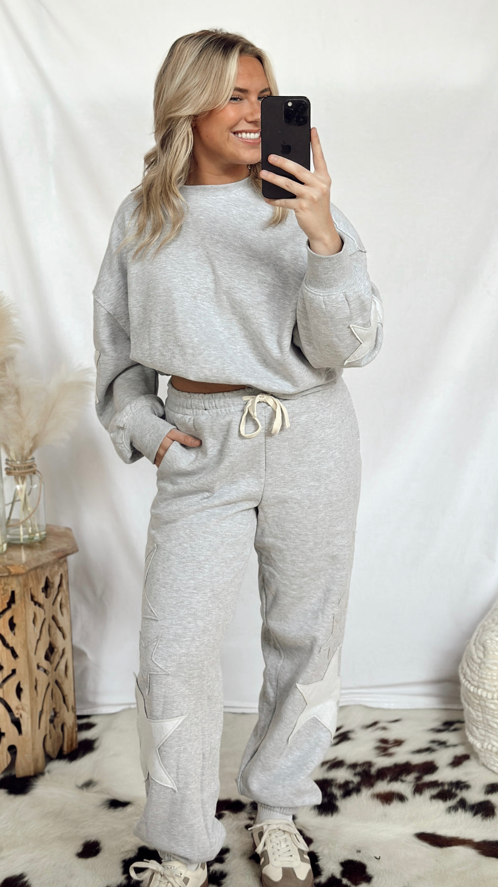 The Staria Sweatpants bring cozy comfort with a playful touch, featuring star patches that brighten up your look. The adjustable drawstring waist ensures a perfect fit, making these sweatpants ideal for relaxing at home or running errands in style.