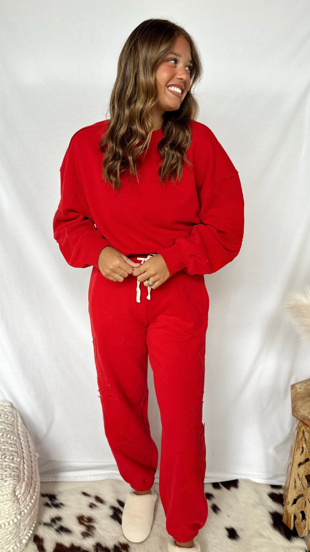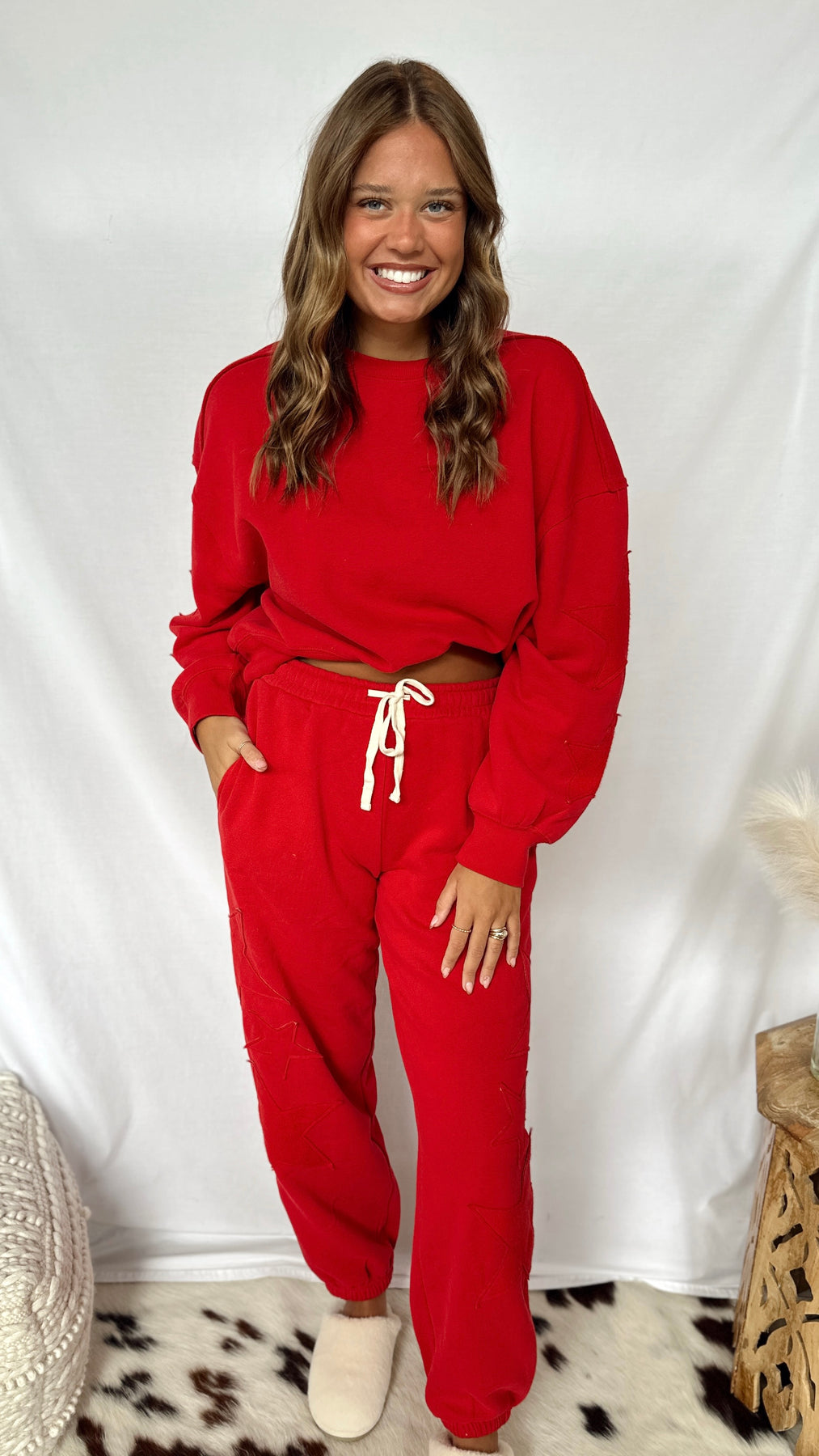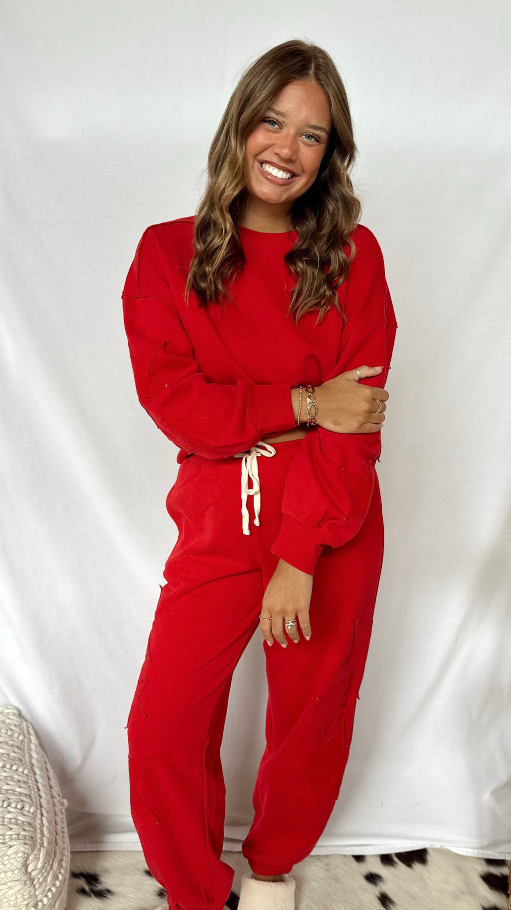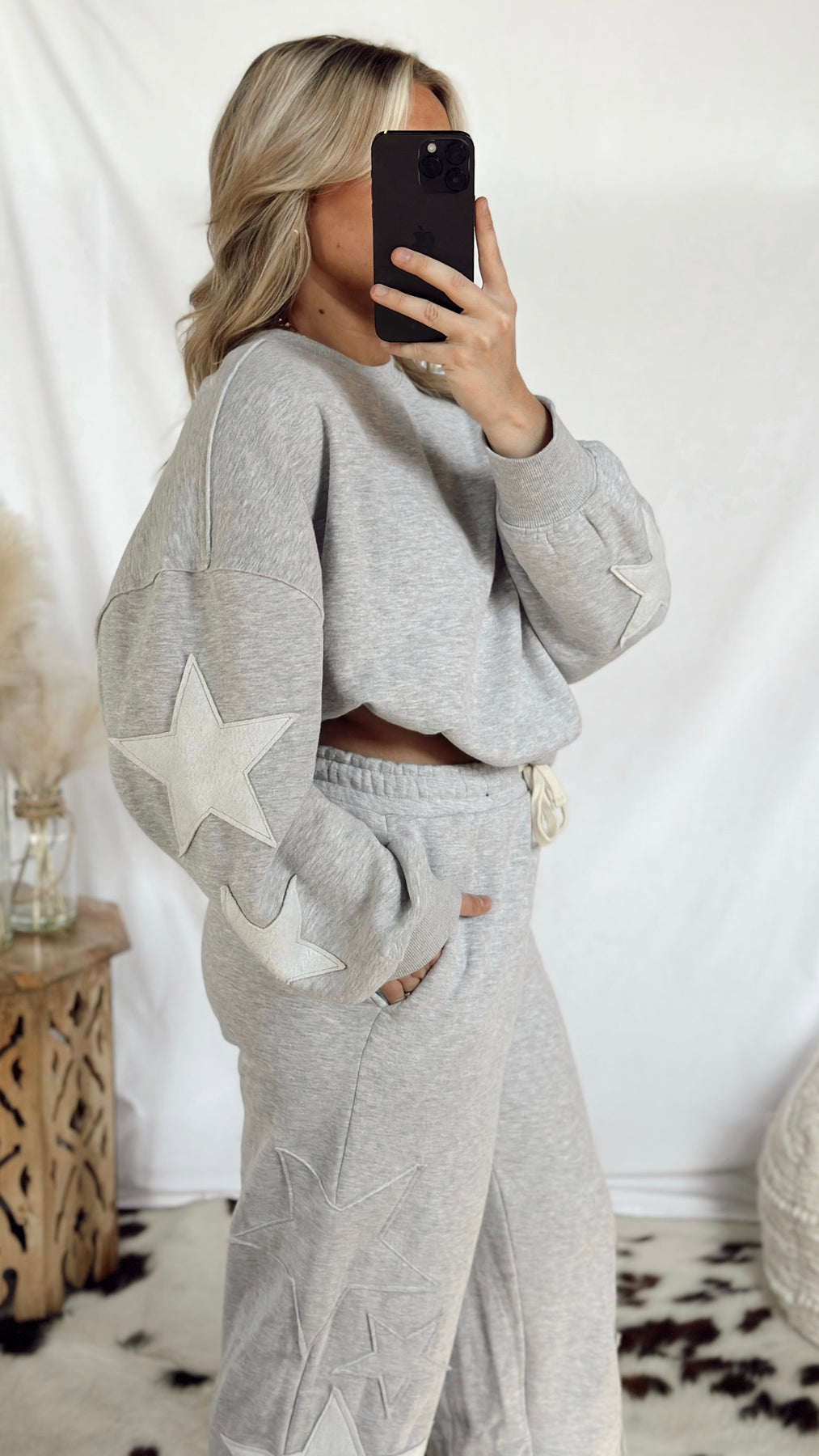 The Staria Sweatpants bring cozy comfort with a playful touch, featuring star patches that brighten up your look. The adjustable drawstring waist ensures a perfect fit, making these sweatpants ideal for relaxing at home or running errands in style.