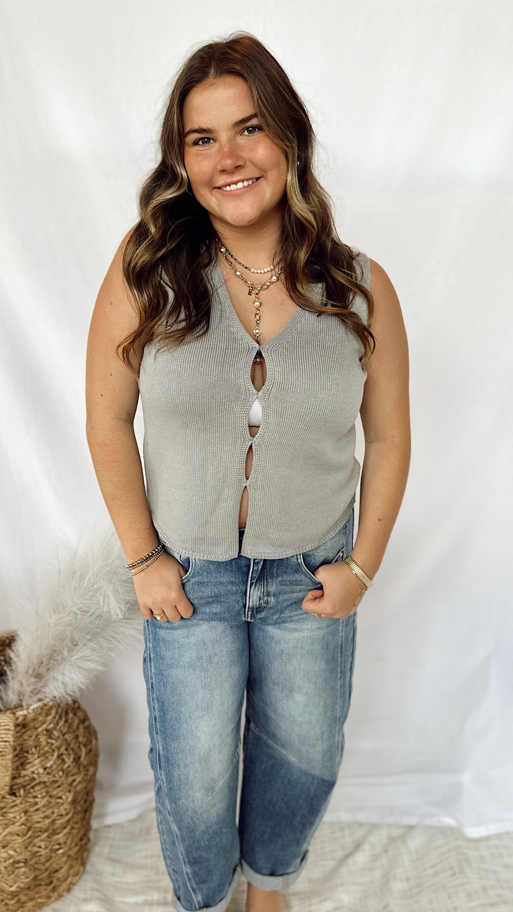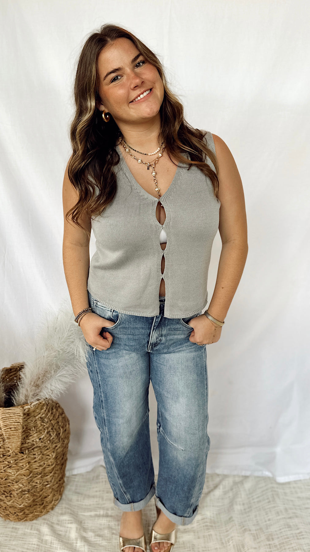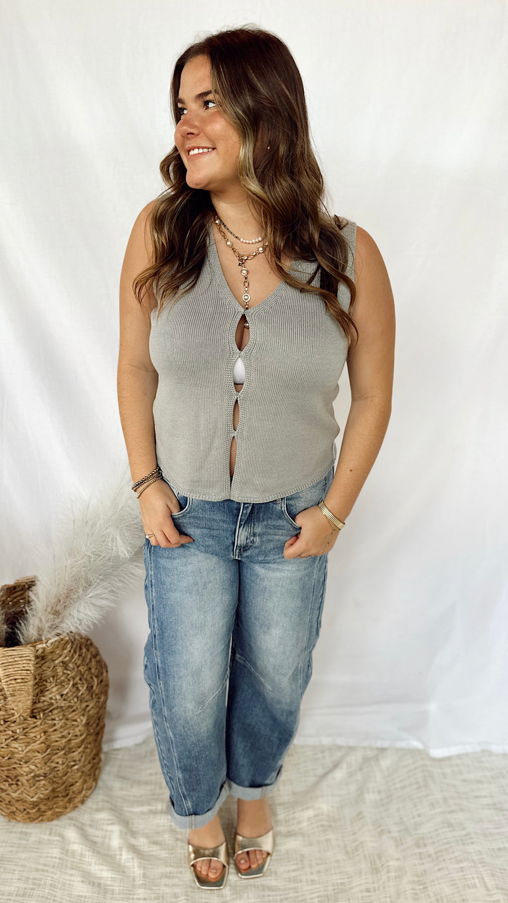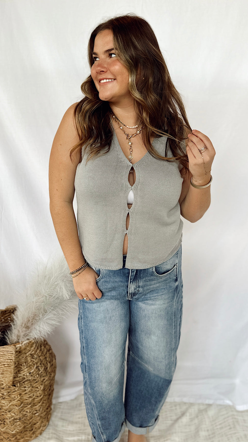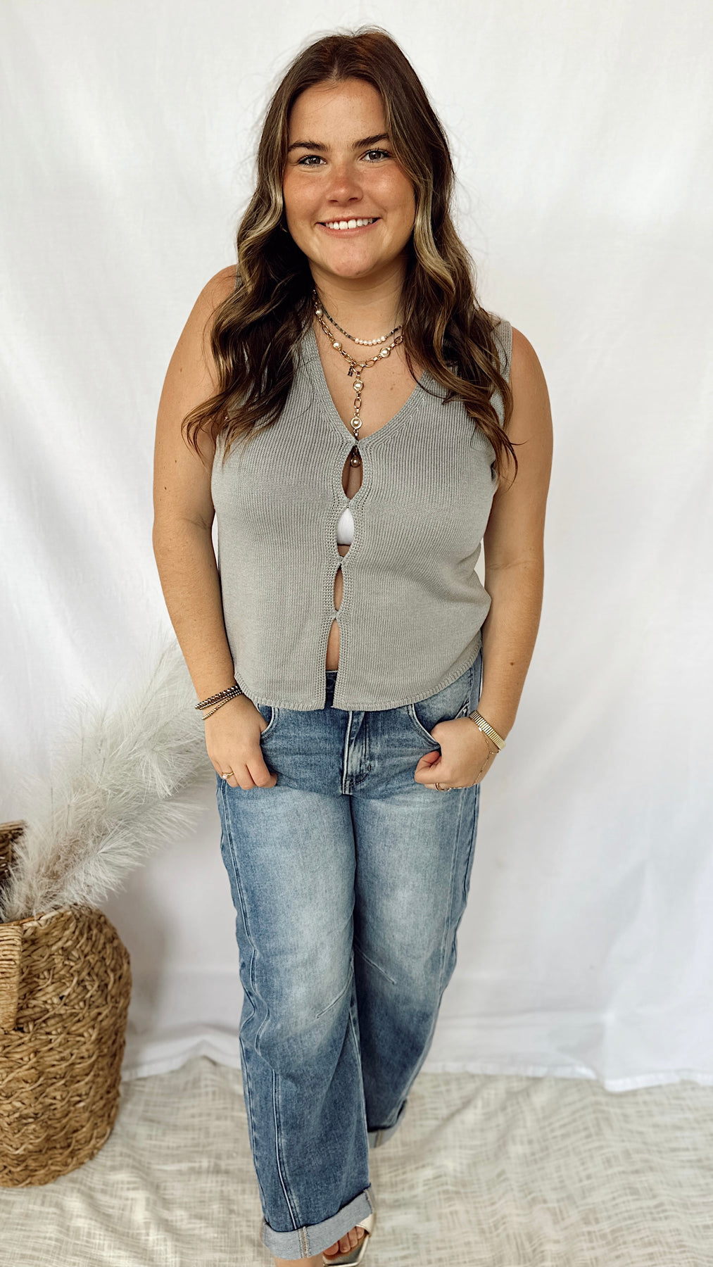 Stay cool and casual in The What I Want Top, a grey button-front vest tank that’s perfect for layering or wearing solo.