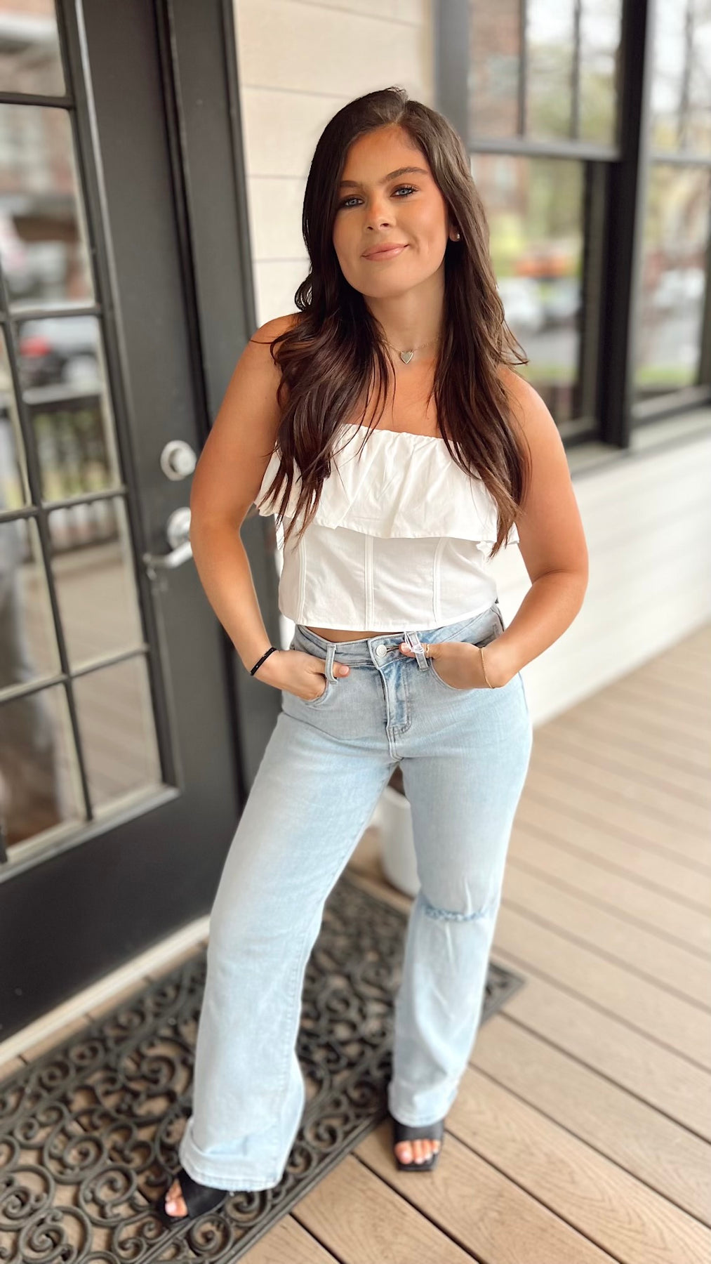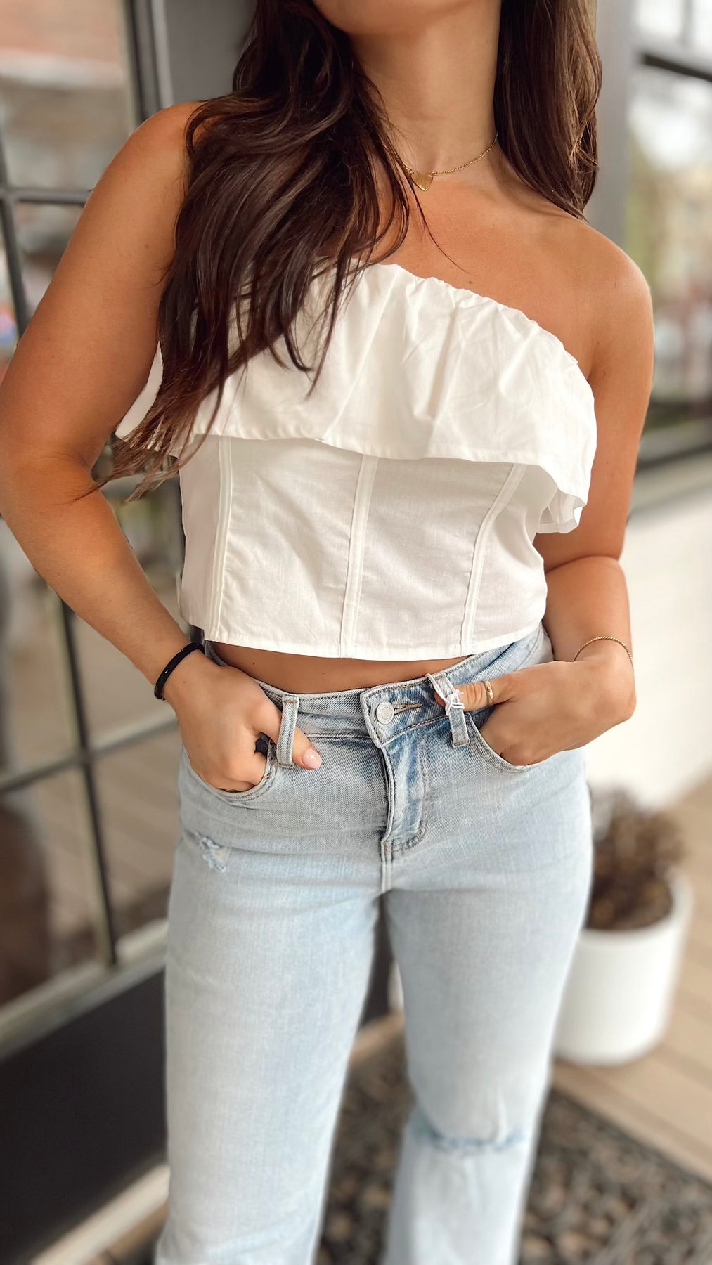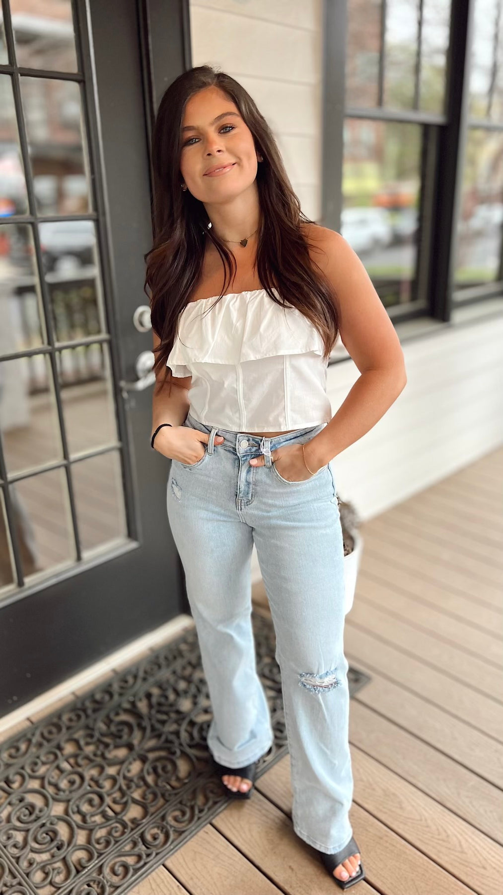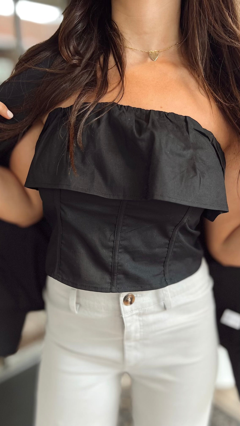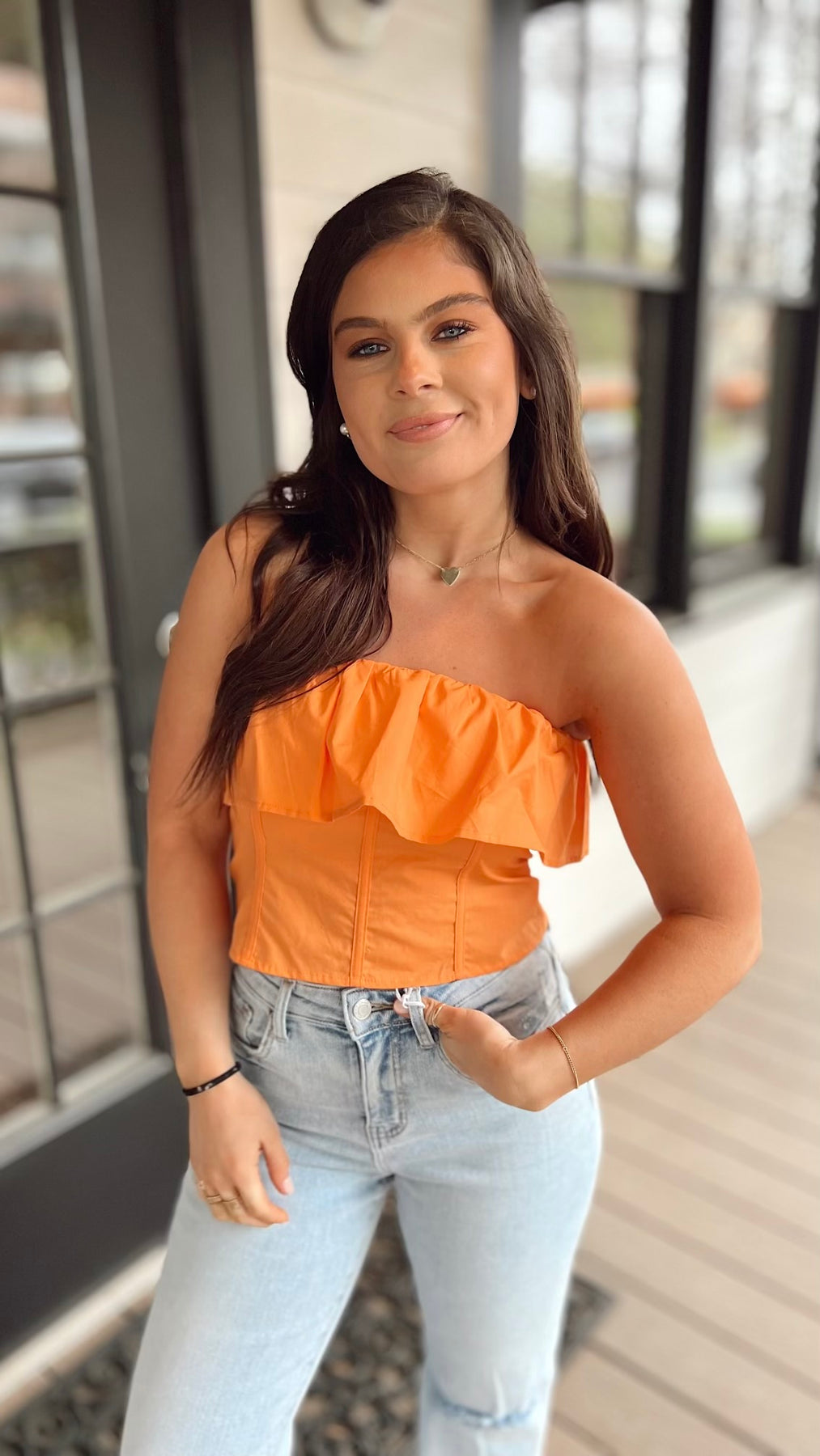 Get ready to turn heads with our fabulous strapless ruffle top! Available in three vibrant colors - orange, white and black - this top will enhance your figure and add a touch of fun to any outfit. Be confident and make a statement with our bold and stylish design! Pair with your favorite pair of jean shorts..