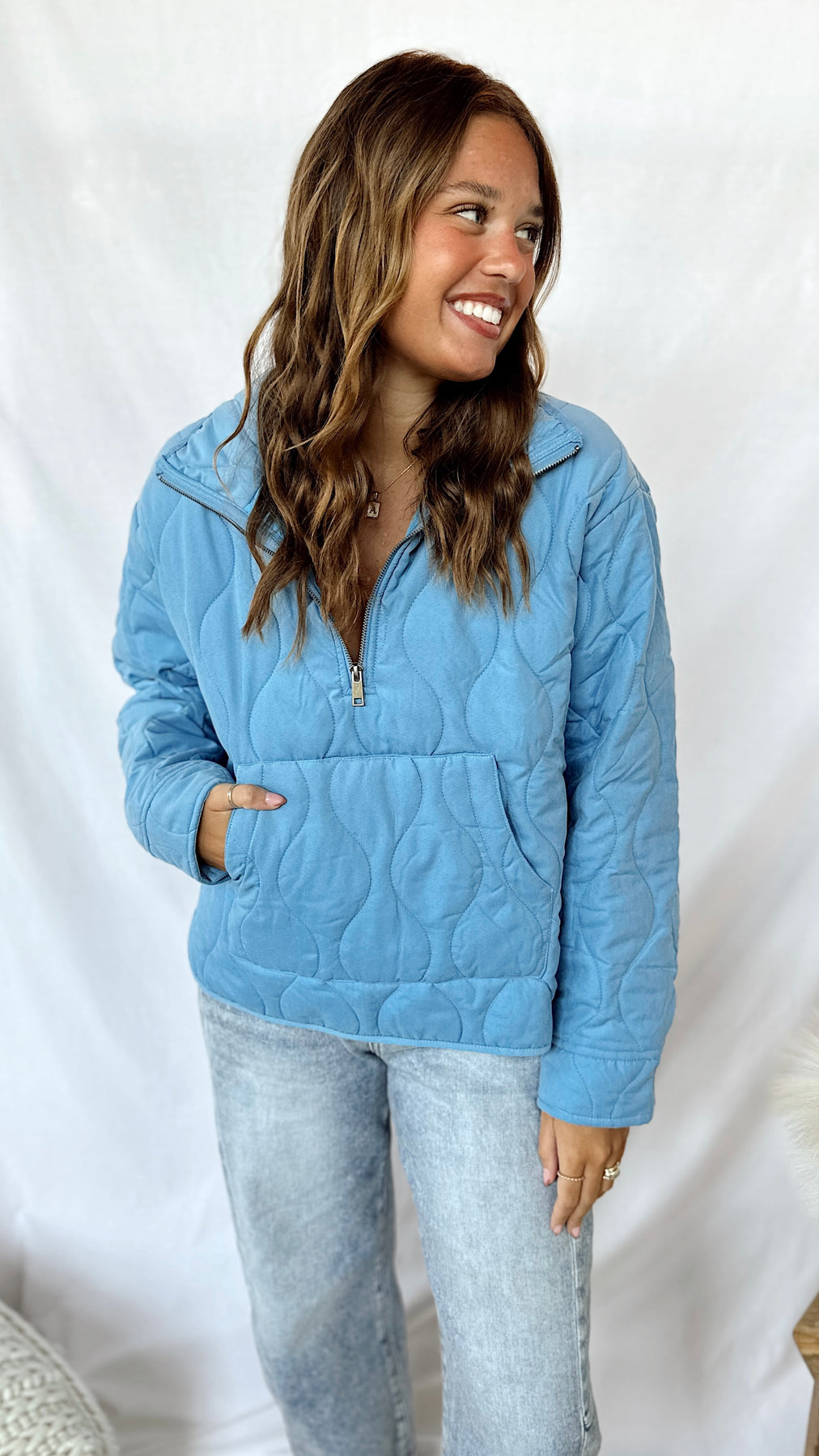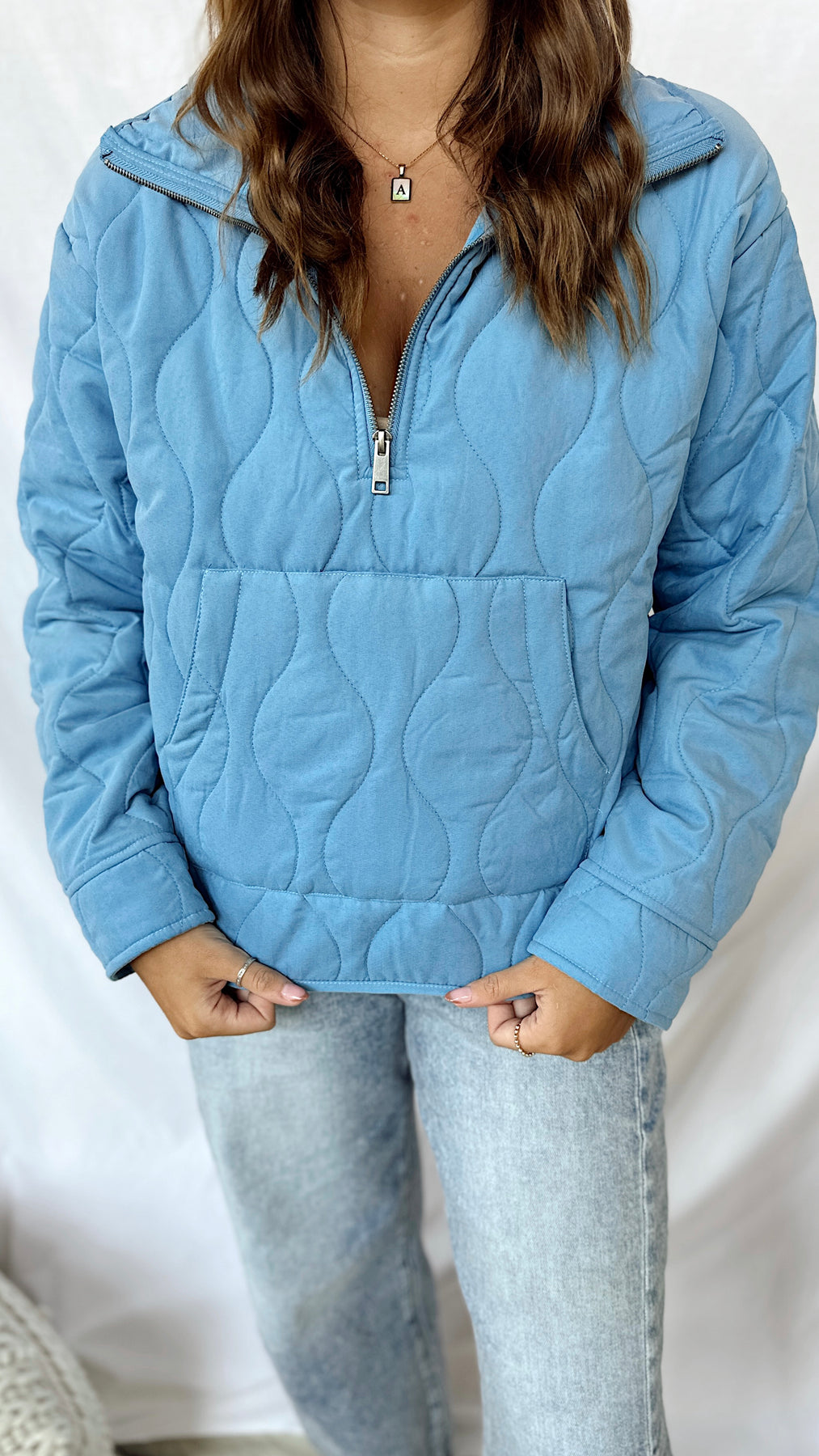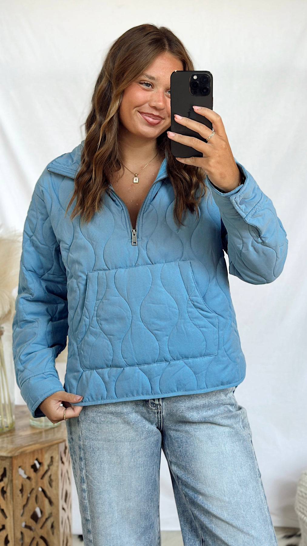 Stay cozy and stylish in The Elevated Jacket, a blue puffer quilted jacket designed with a handy quarter zip for easy wear. Its lightweight warmth makes it perfect for layering on chilly days, while the quilted design adds a playful, comfy vibe to your look.