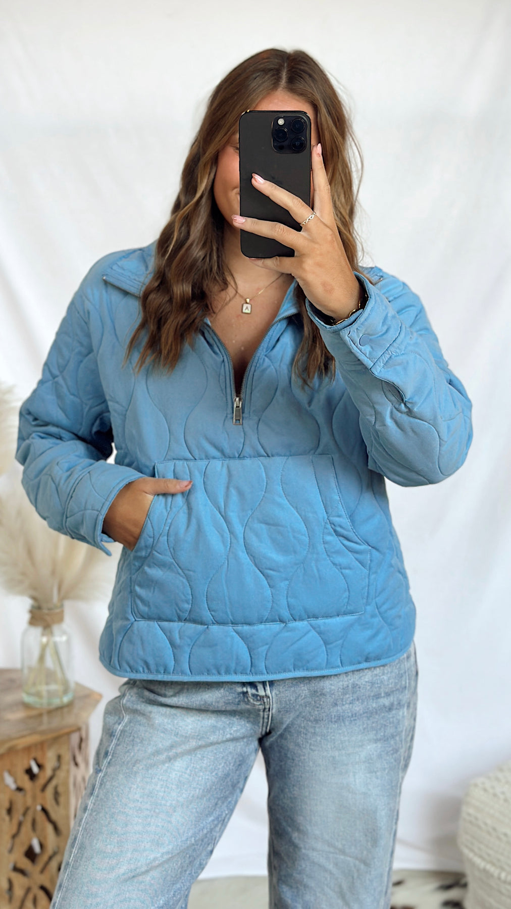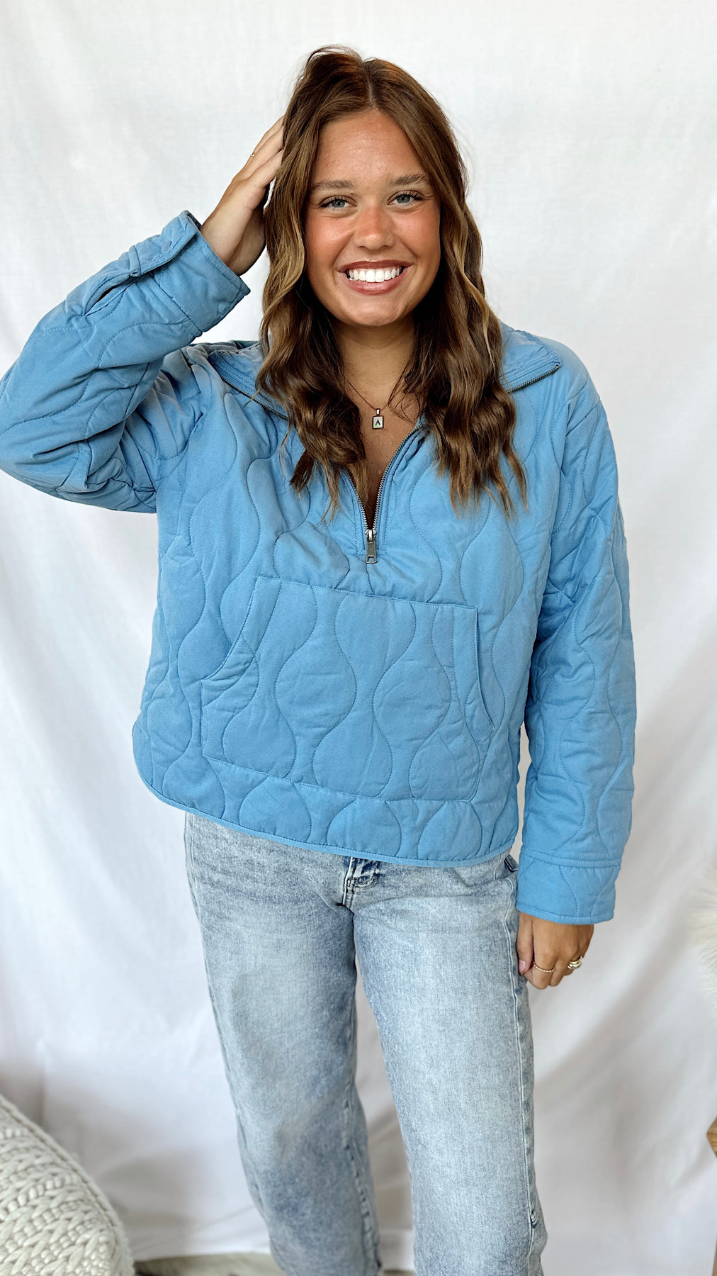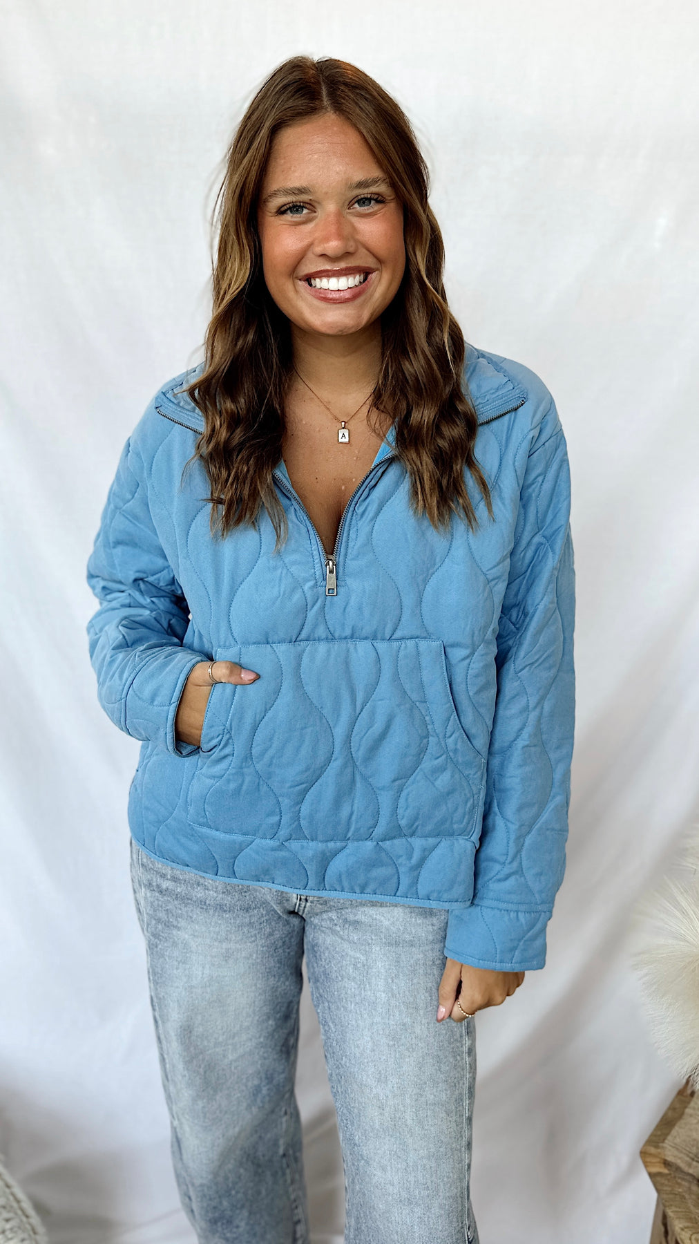 Stay cozy and stylish in The Elevated Jacket, a blue puffer quilted jacket designed with a handy quarter zip for easy wear. Its lightweight warmth makes it perfect for layering on chilly days, while the quilted design adds a playful, comfy vibe to your look.