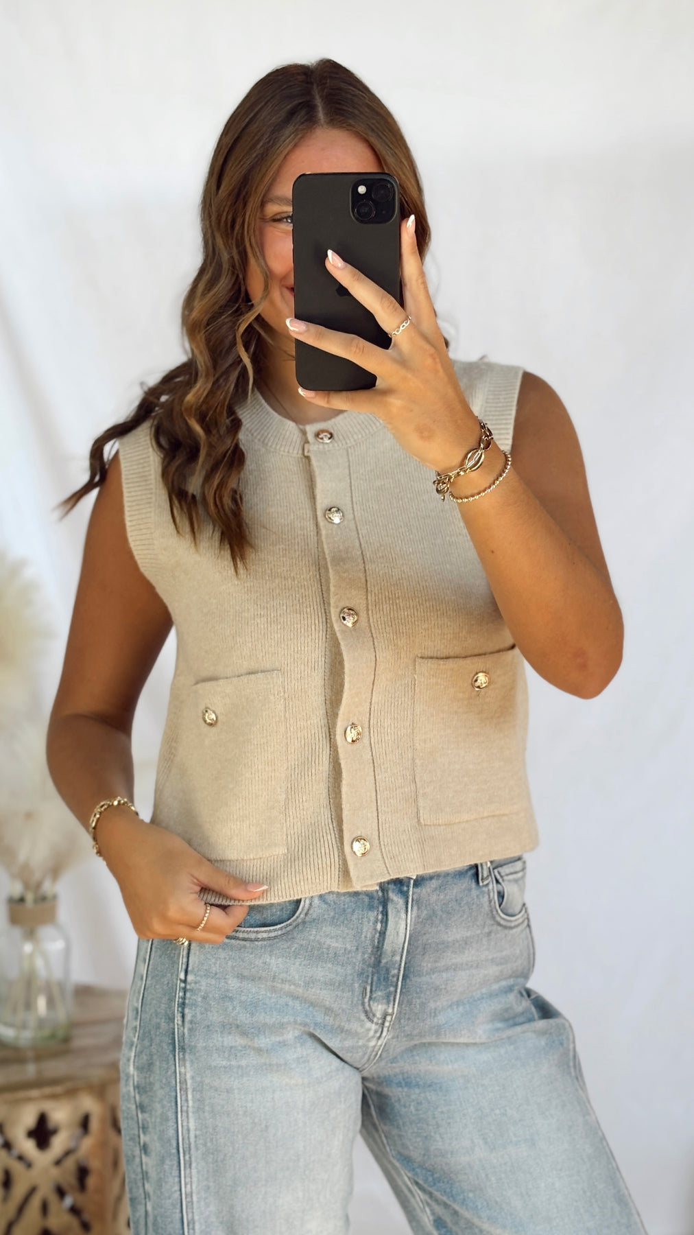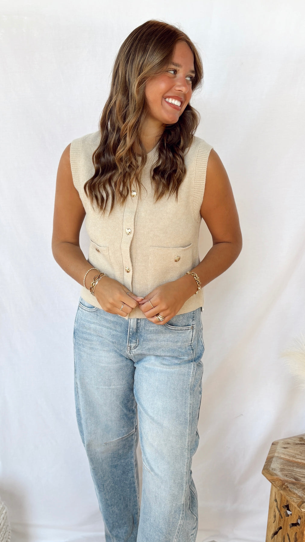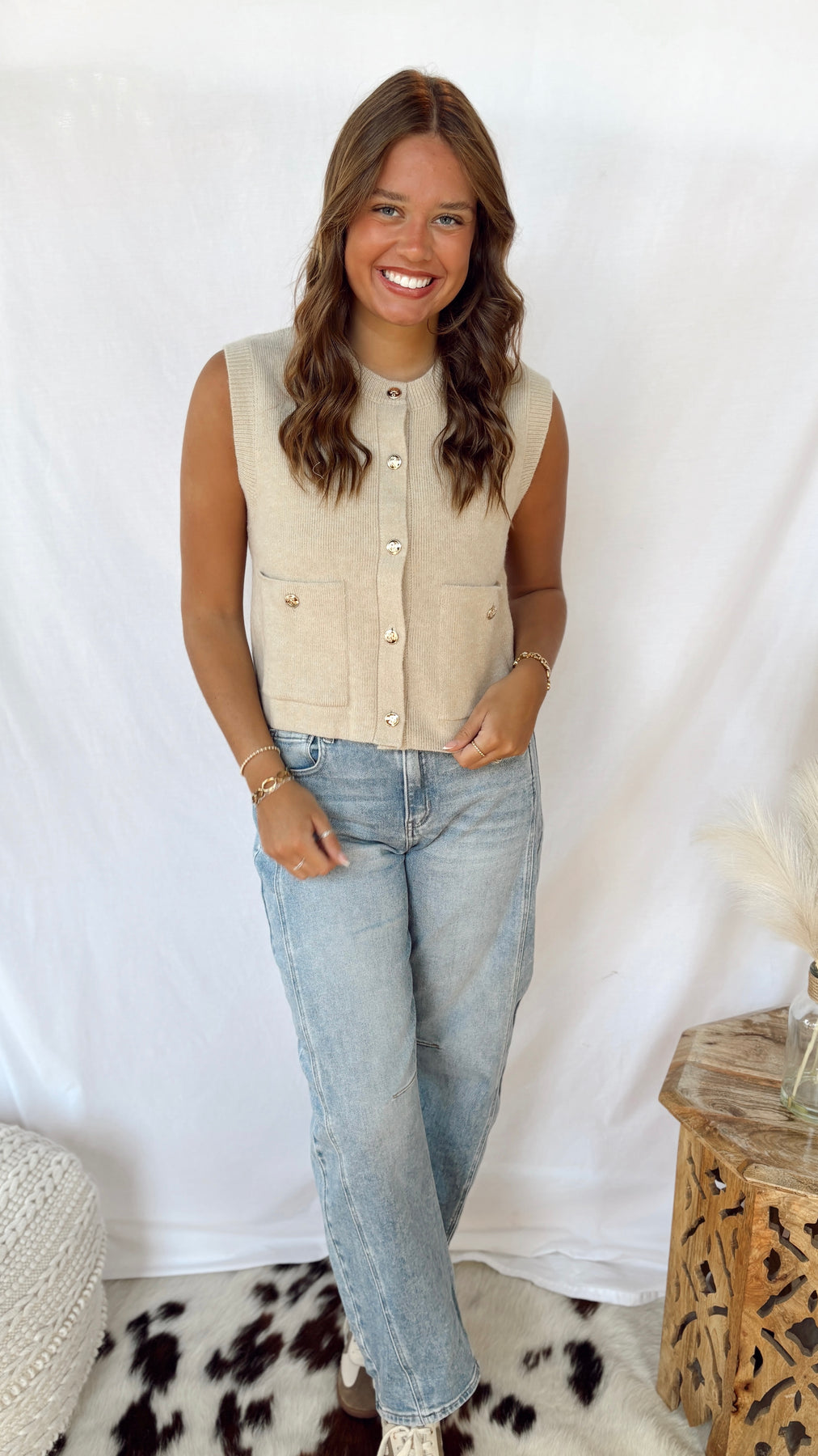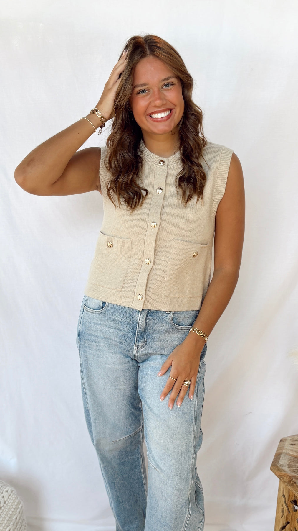 The Evaline Sweater Vest is a cozy beige layer with shiny gold buttons that add a touch of sparkle. Featuring two handy front pockets, it’s as practical as it is stylish. Perfect for easygoing days when you want to keep warm but stay cute!