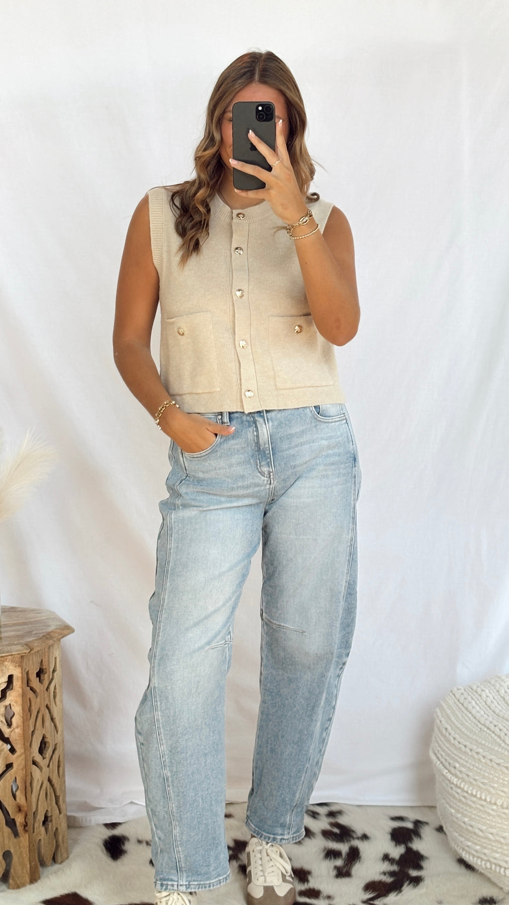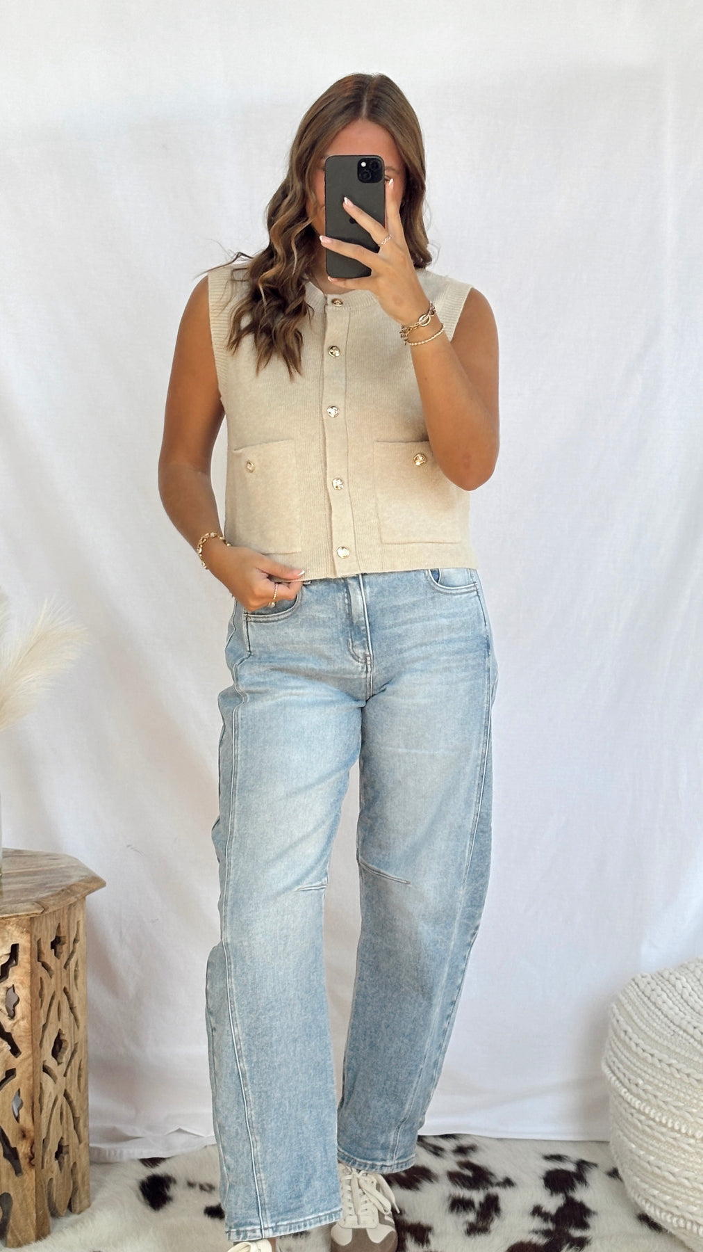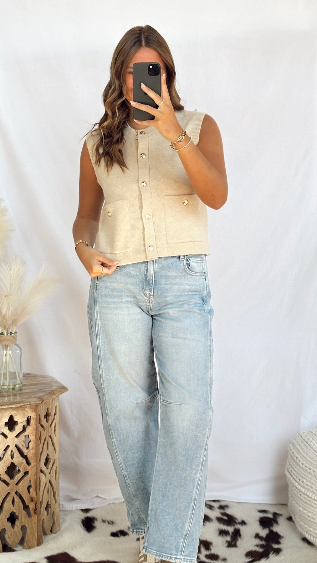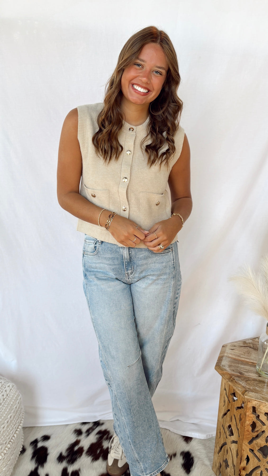 The Evaline Sweater Vest is a cozy beige layer with shiny gold buttons that add a touch of sparkle. Featuring two handy front pockets, it’s as practical as it is stylish. Perfect for easygoing days when you want to keep warm but stay cute!