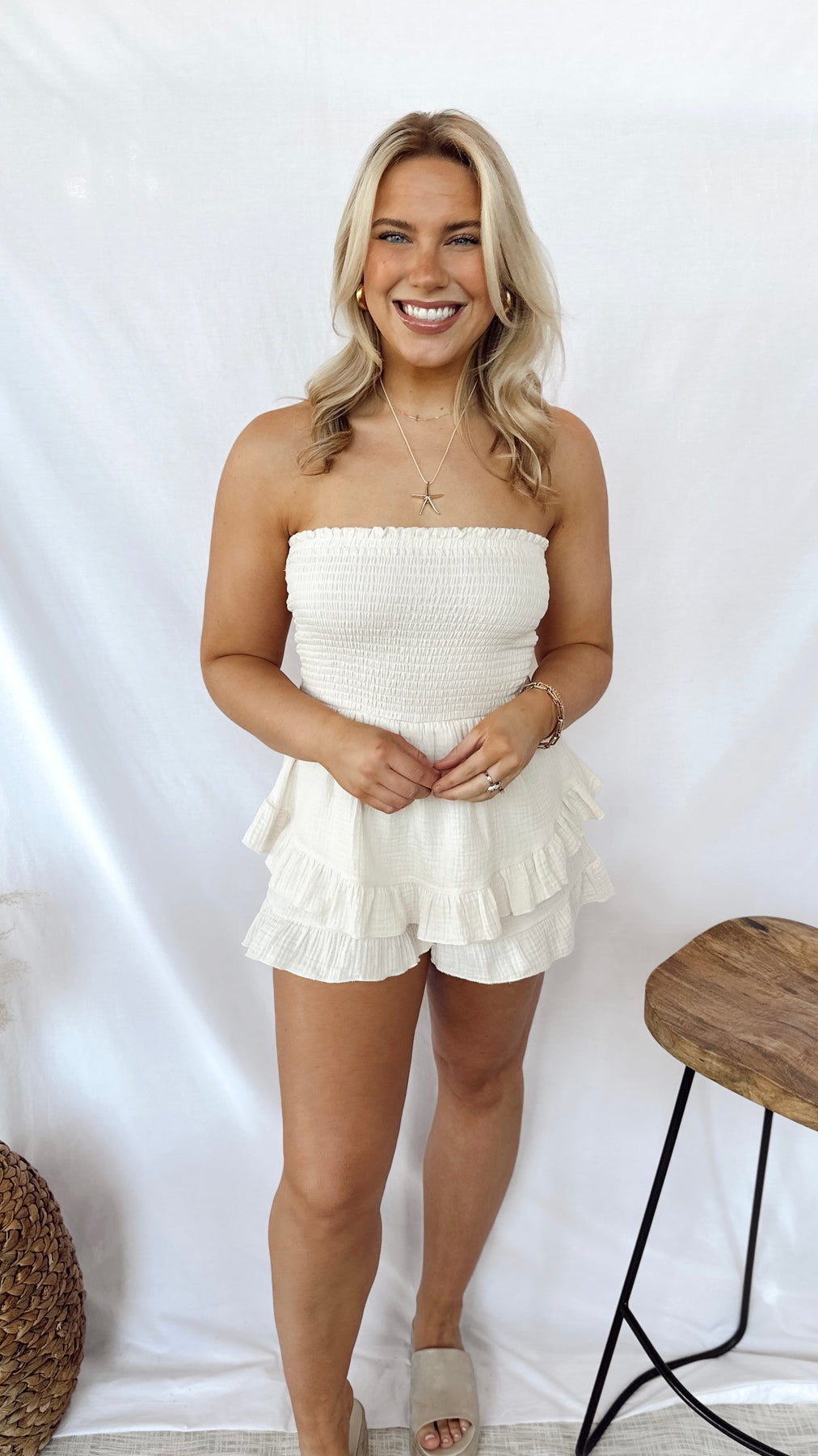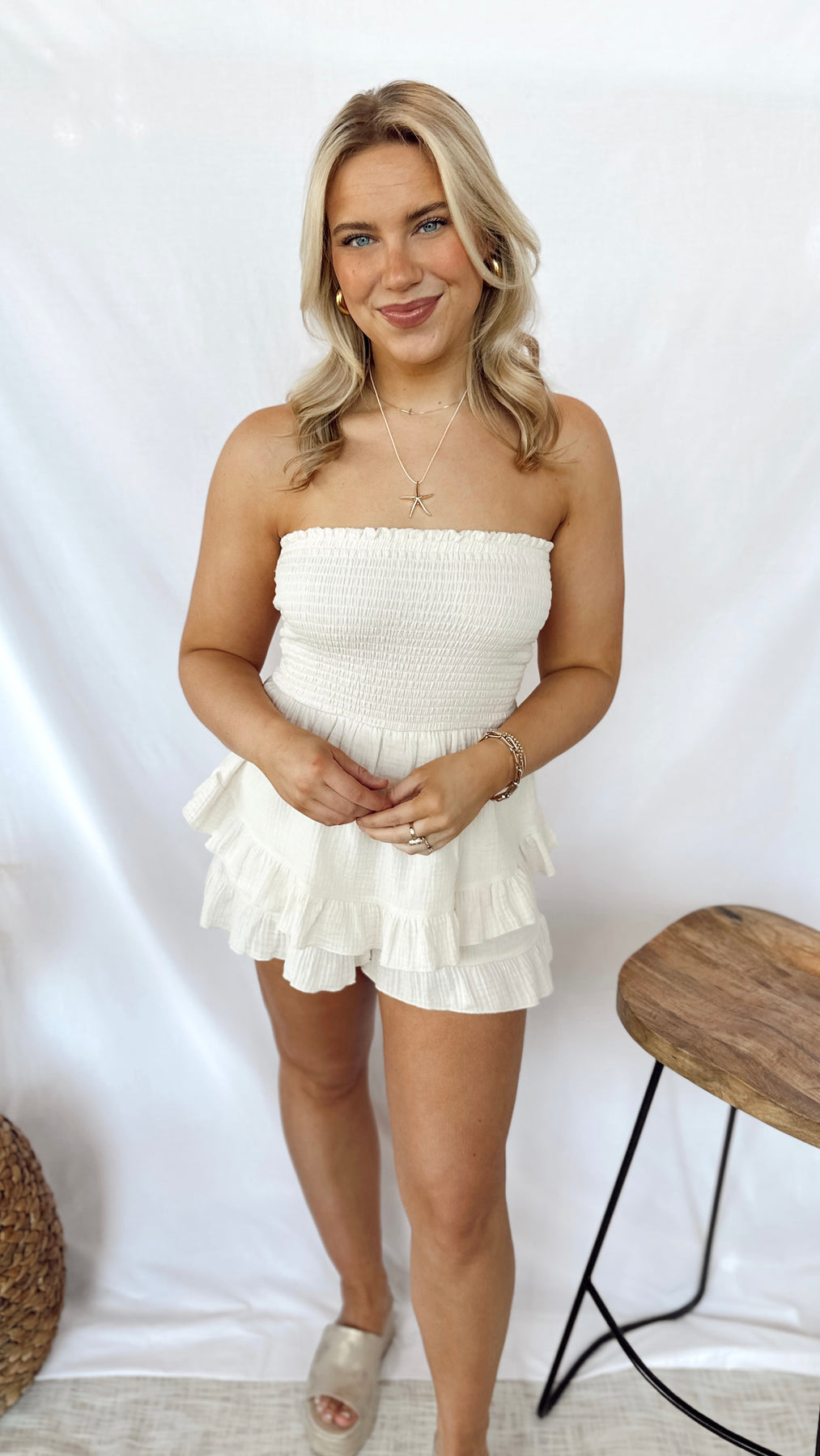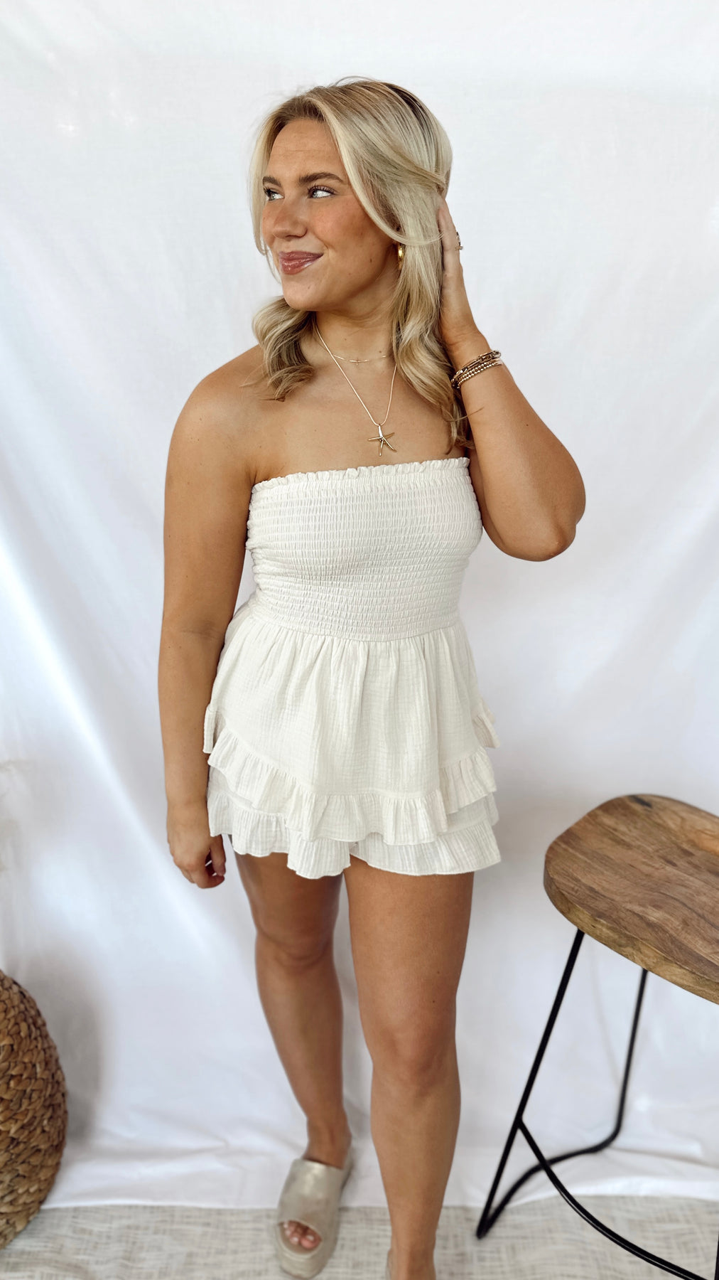 Dress up in style with The Me & You Romper! This fun and simple cream romper features ruffle straps and a strapless design, perfect for any summer outing. Show off your fashion-forward side and enjoy the comfort of this stylish piece.