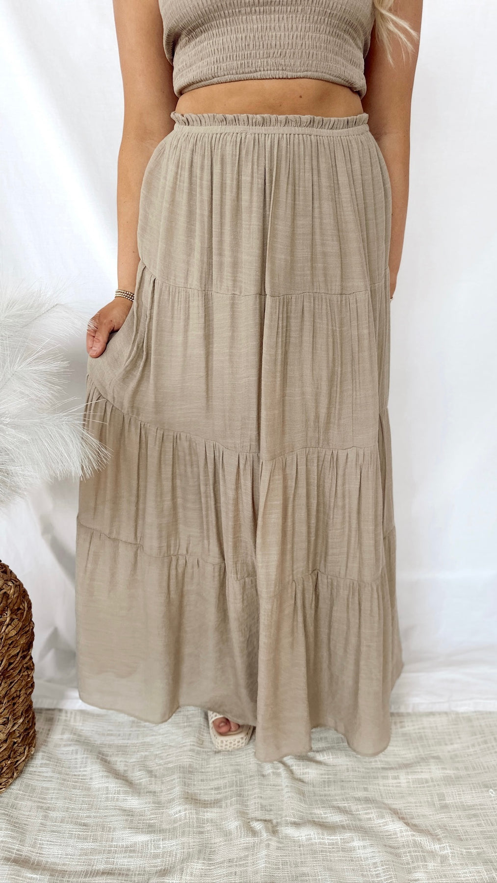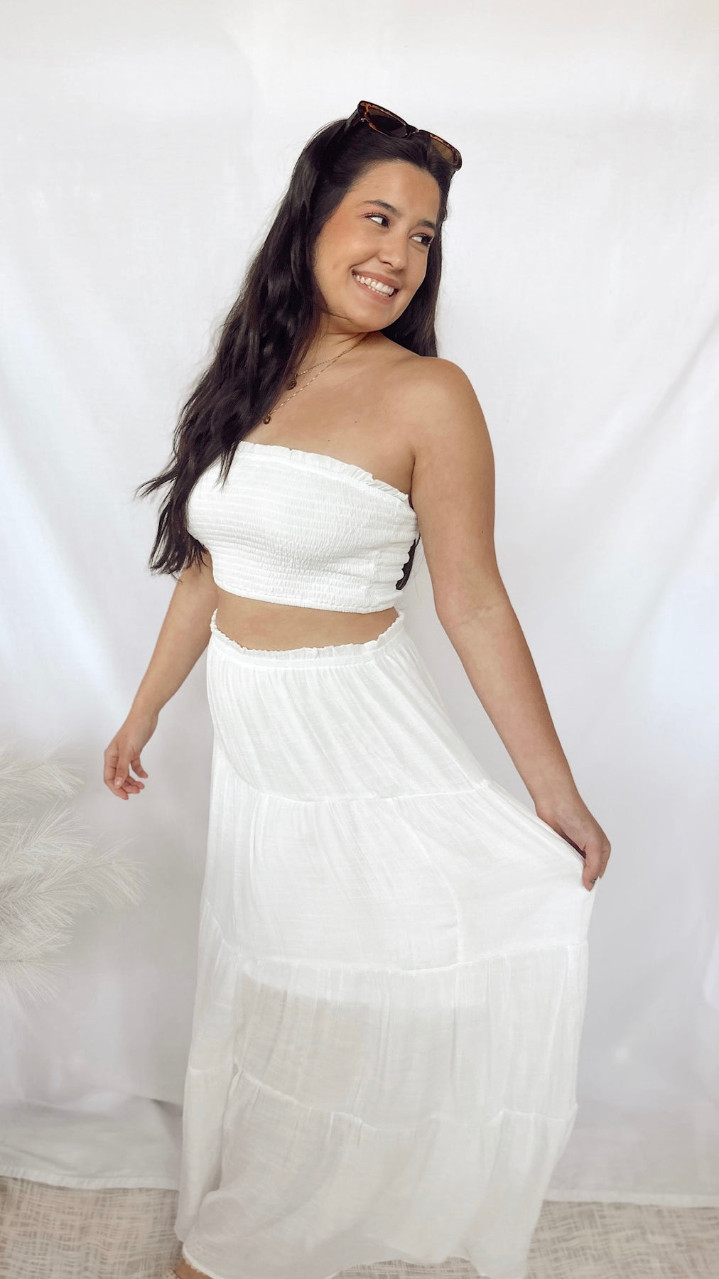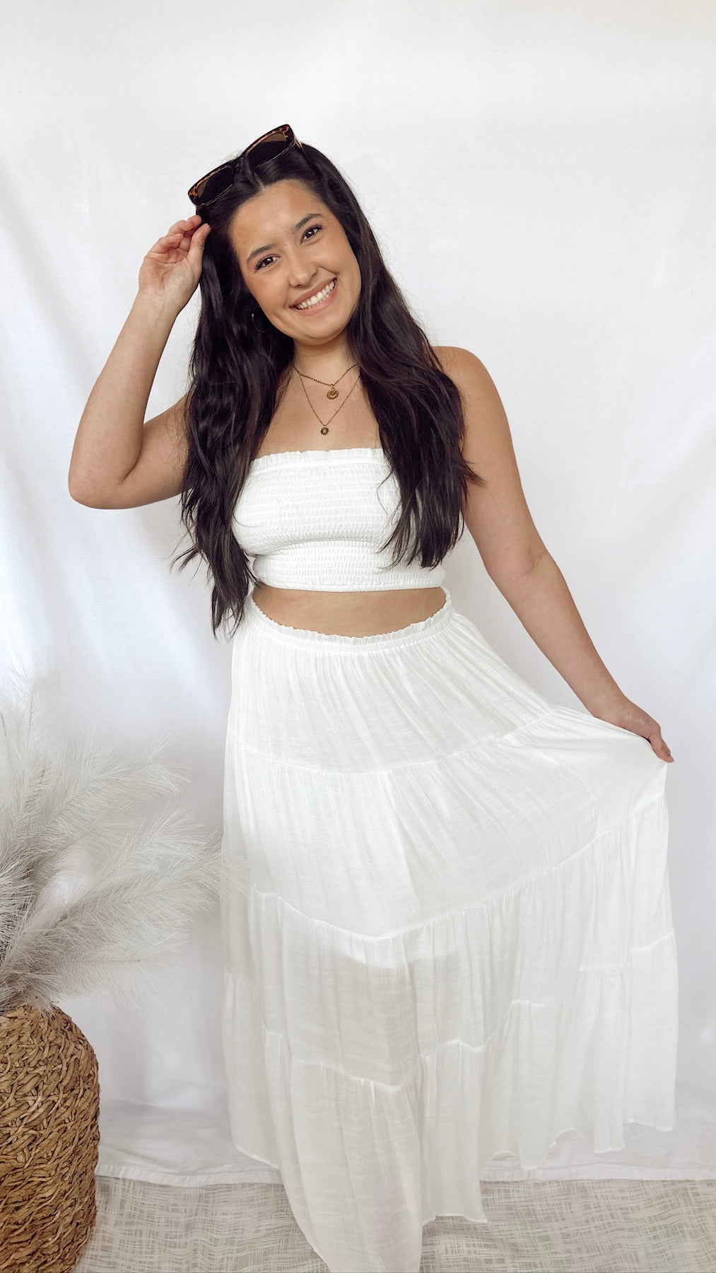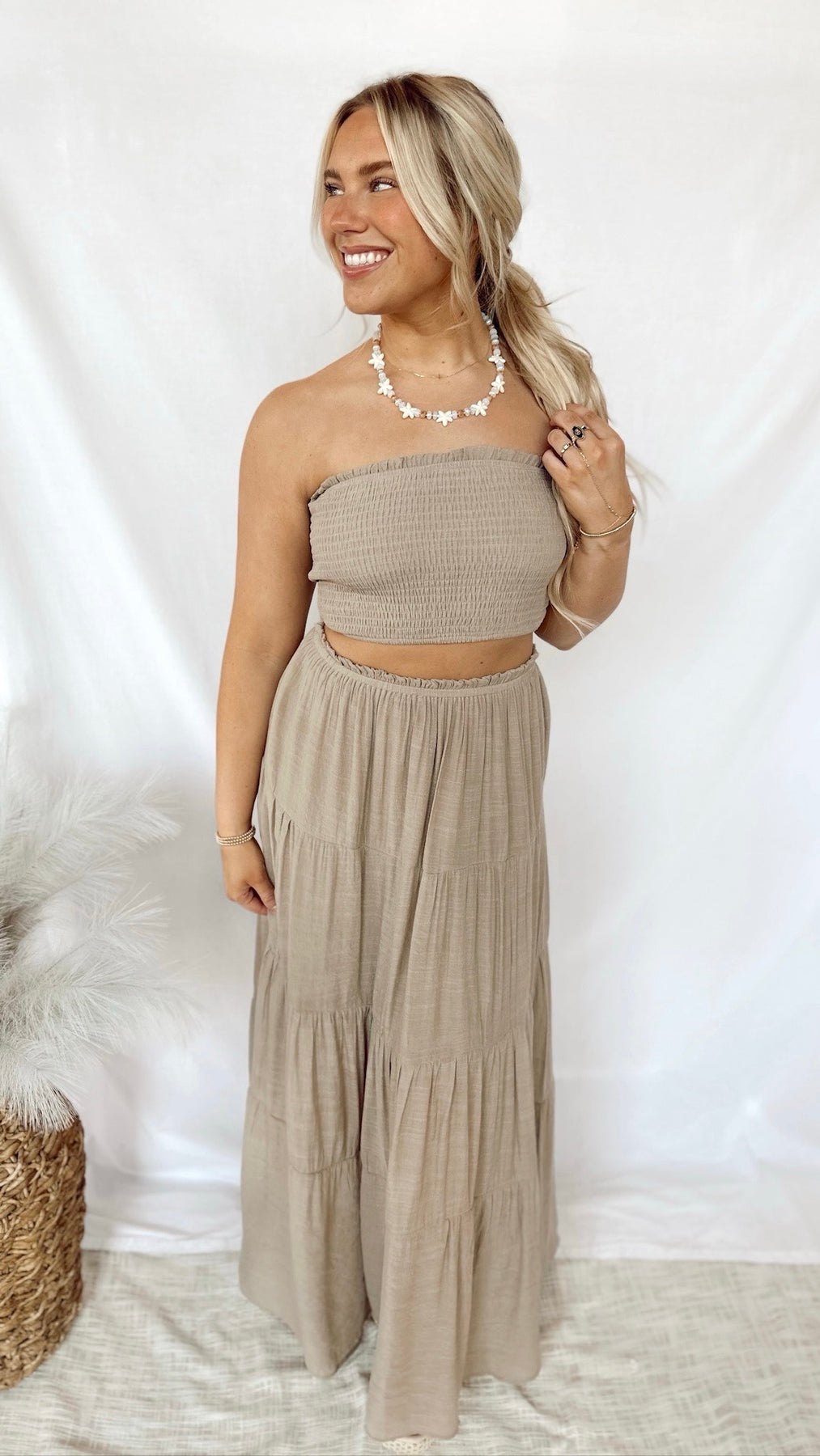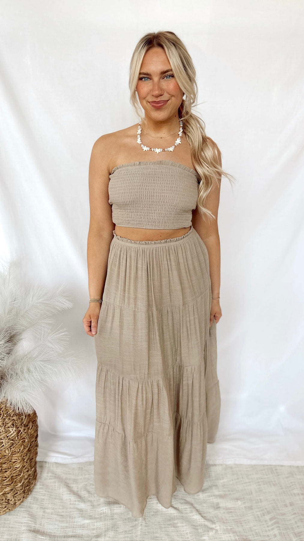 Effortlessly chic and versatile, The Cabo Set is a must-have addition to your wardrobe. The tube top provides a flattering fit, while the flowy skirt adds movement and style. Perfect for any occasion, this set will have you turning heads with its fun and simple design. Comes in either white or taupe