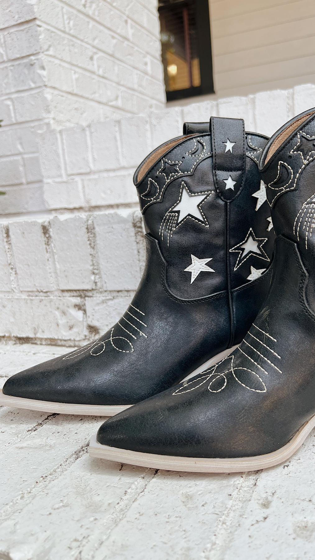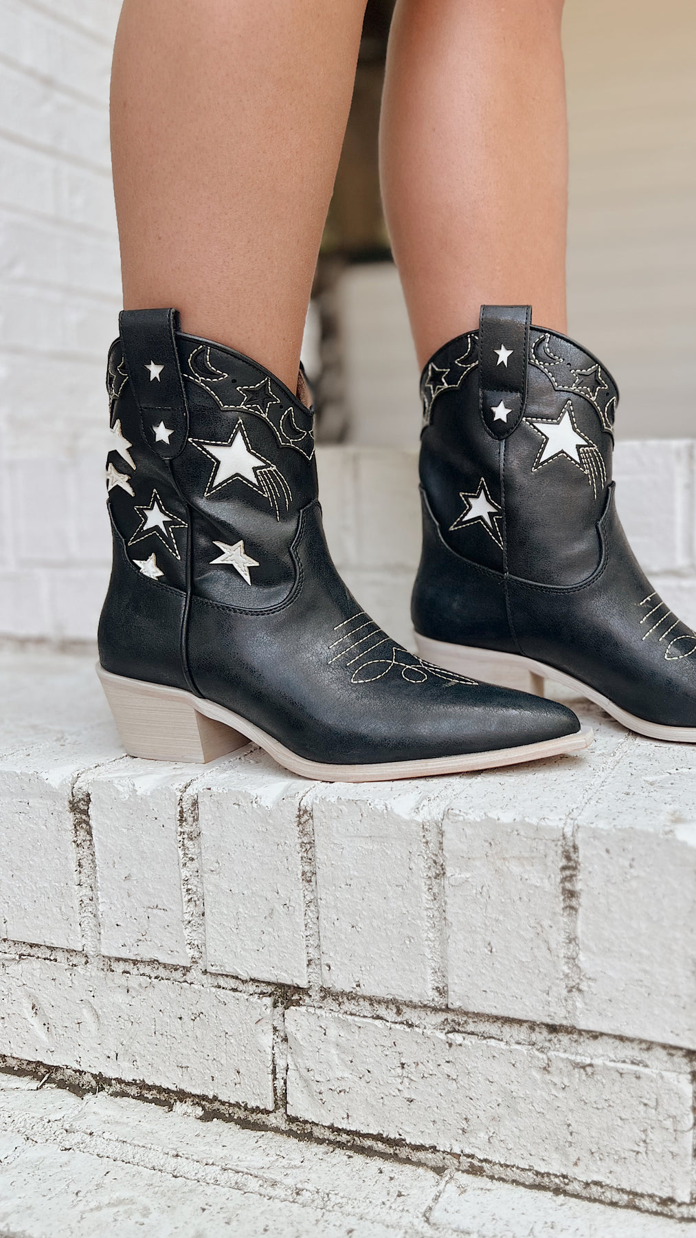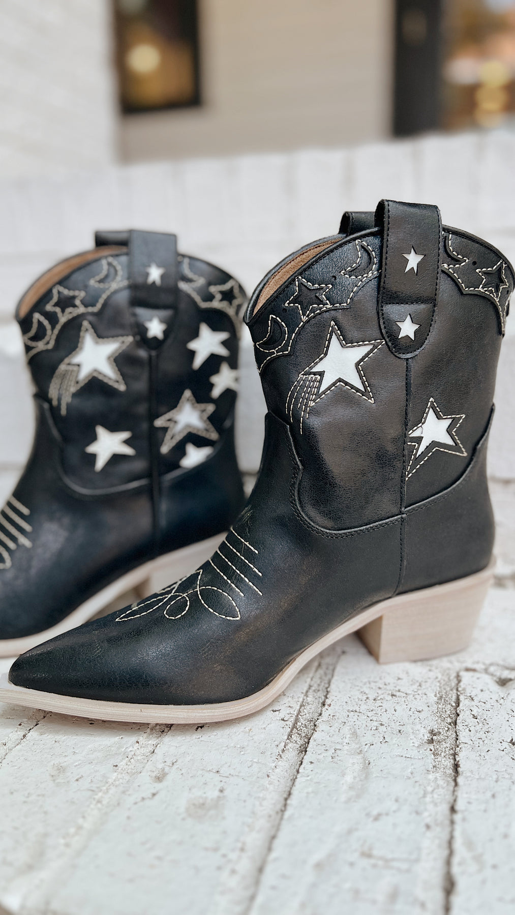 Saddle up in style with The Valeria Cowgirl Boots! These sleek, black boots come complete with star-studded flair that'll make you shine from head to toe.