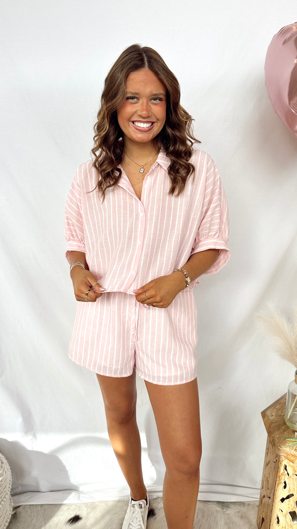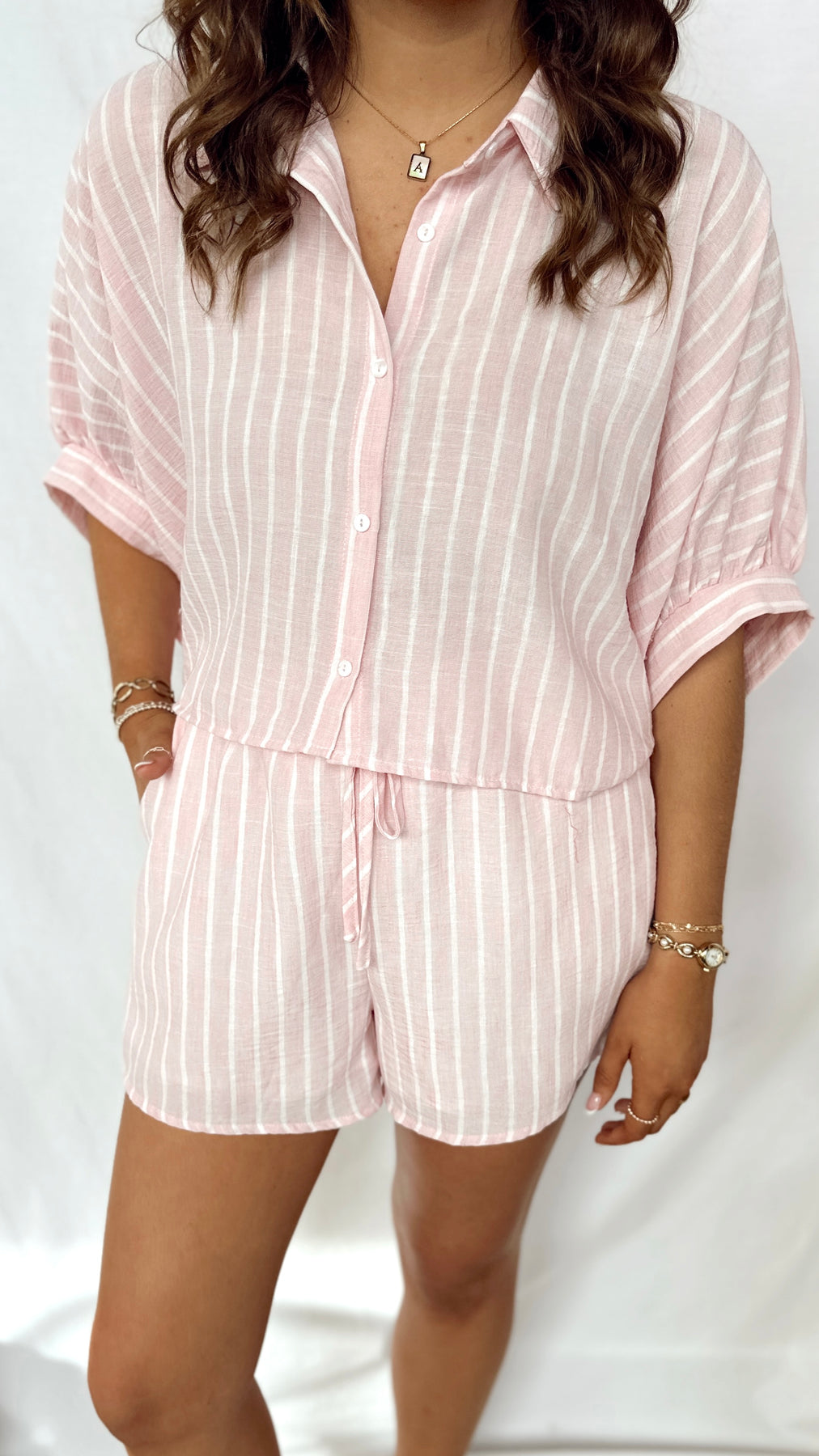 The Vivienne Set brings effortless style with its charming pink and white striped design. This two-piece set features a cropped button-up top paired with comfortable shorts that include functional pockets—perfect for keeping your essentials close. Mix and match these pieces or wear them together for a fresh, playful look that works for casual outings or relaxed weekends.