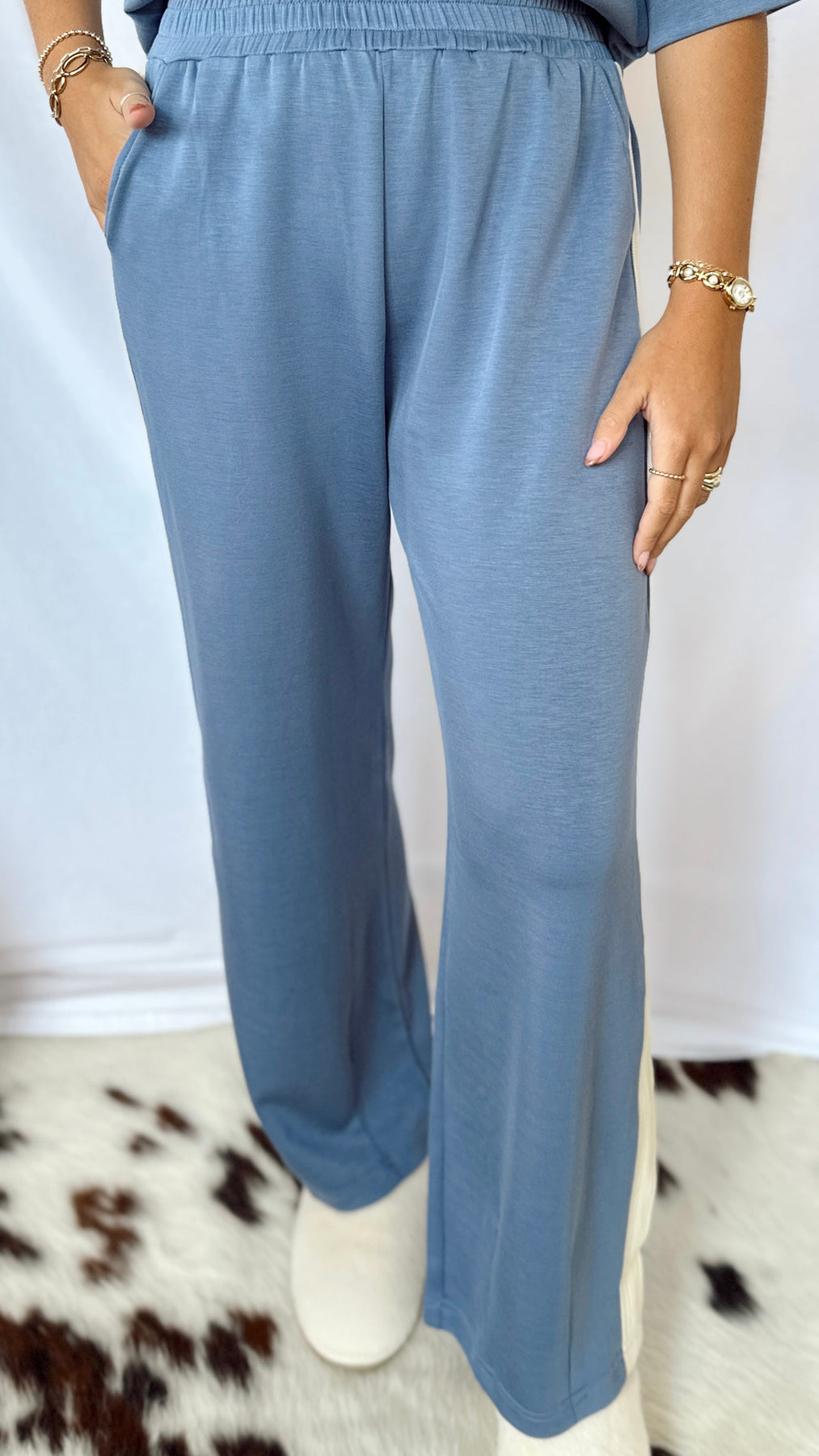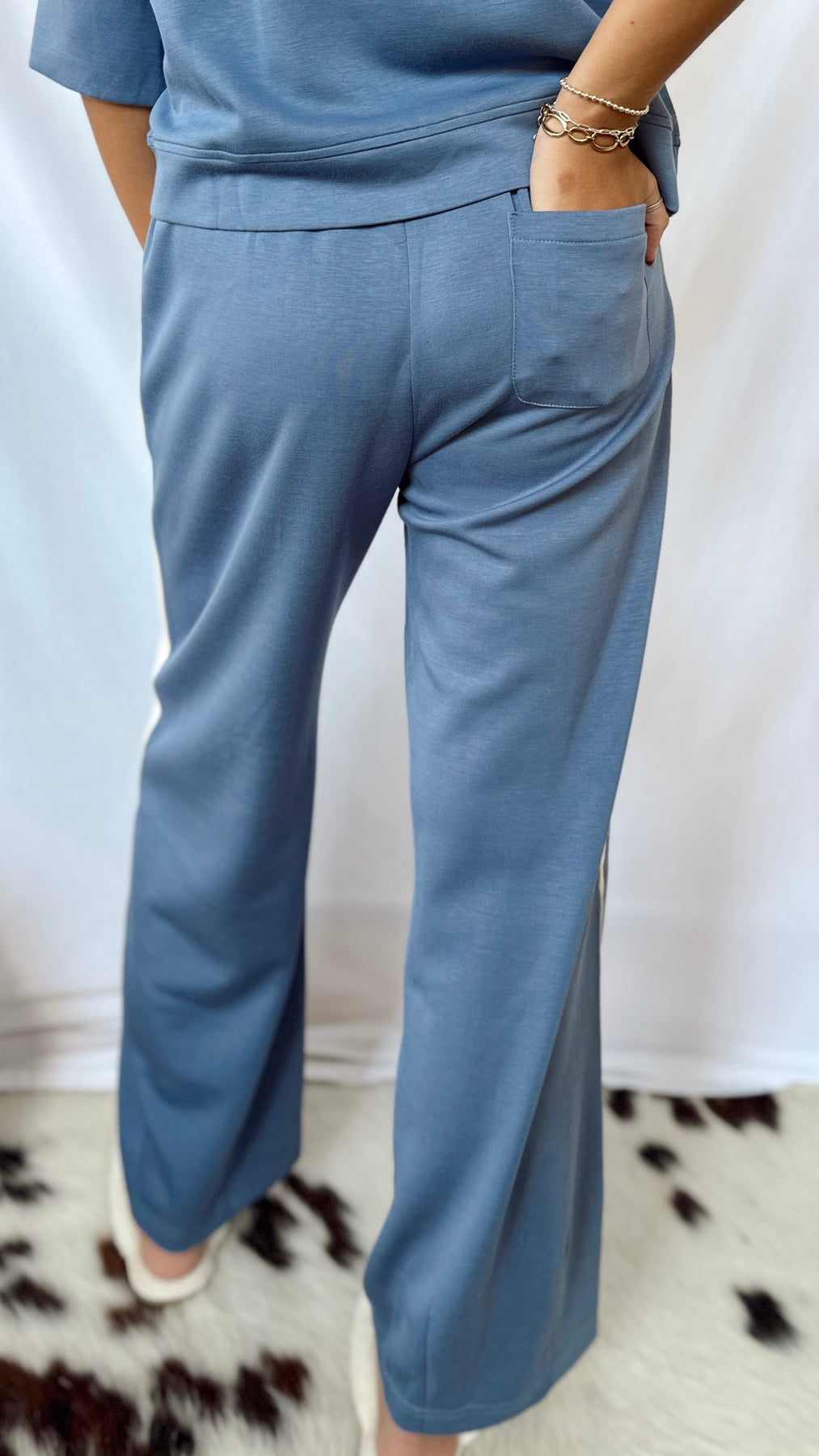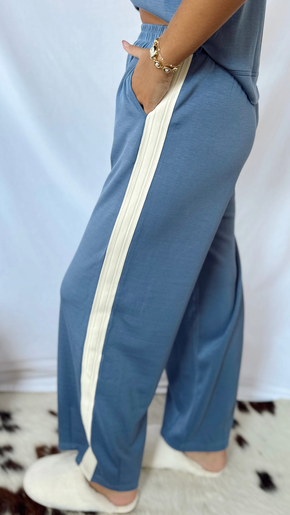 The Adele Sweatpants bring cozy vibes with a soft blue fabric that feels great all day long. A crisp white stripe down each side adds a sporty touch, perfect for lounging or casual outings.