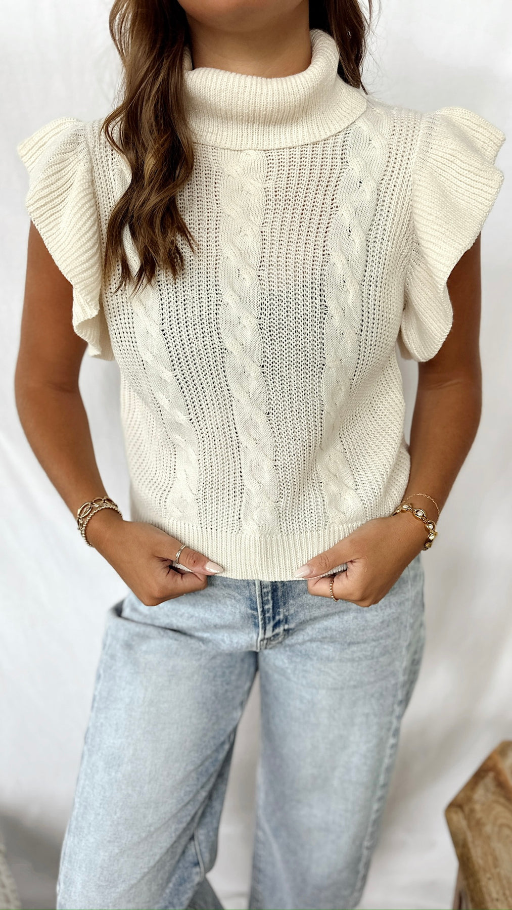The Alessia Top is a cozy mock neck knit sweater with playful ruffle sleeves that add a flirty touch. Easy to dress up or down, this top brings a little extra style to your everyday look.