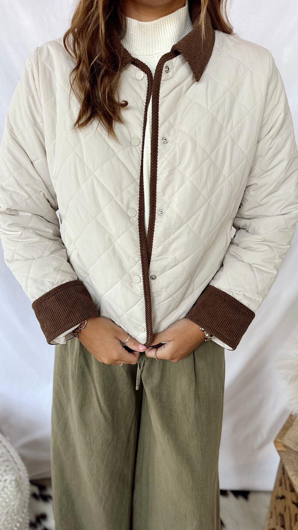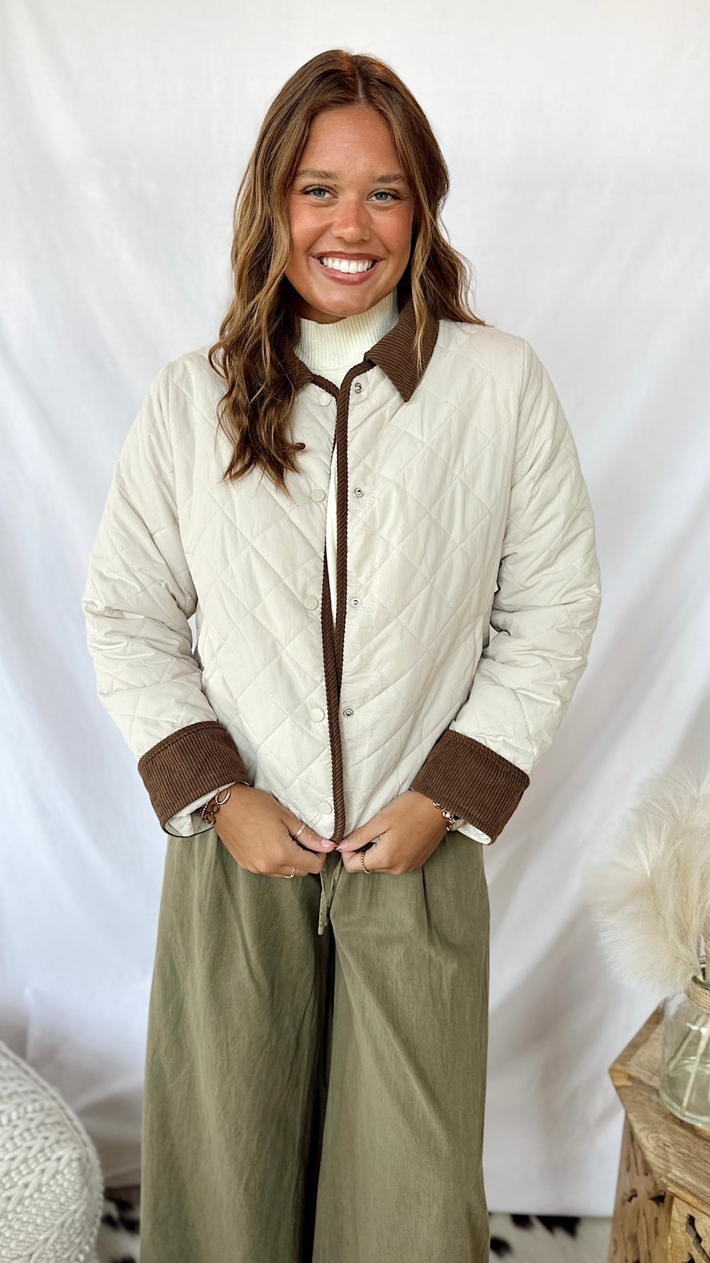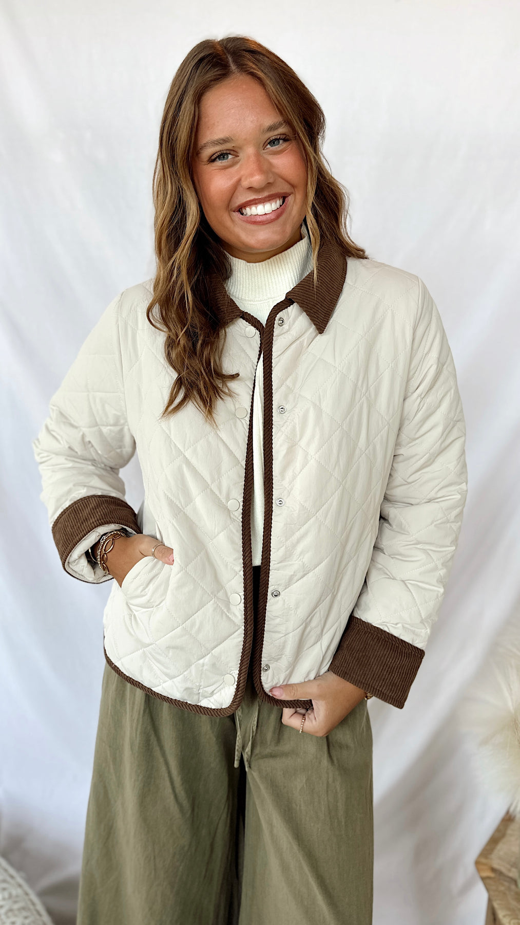 Stay cozy and stylish in The All Natural Jacket, featuring a soft cream quilted design paired with a warm brown collar.