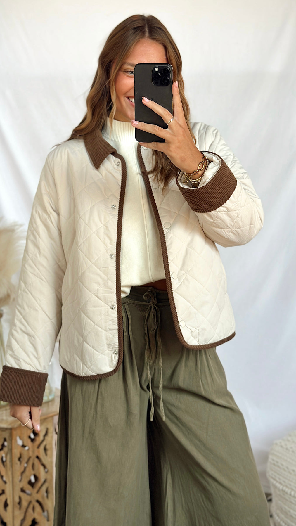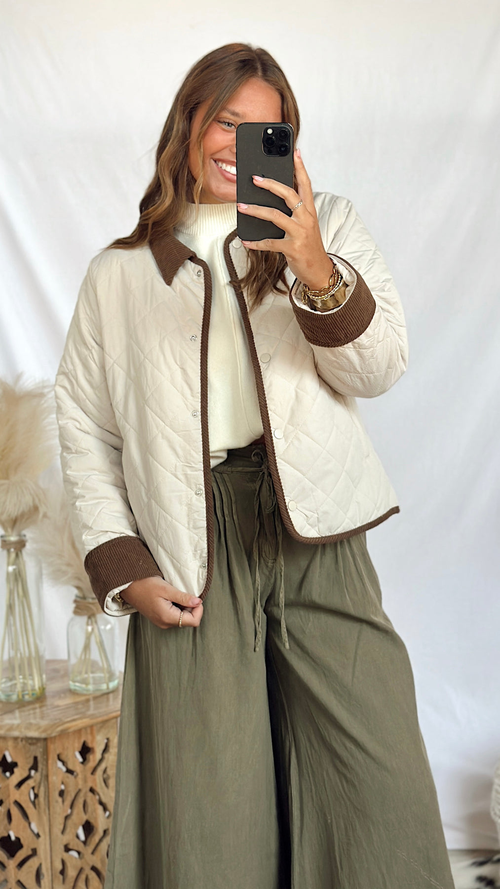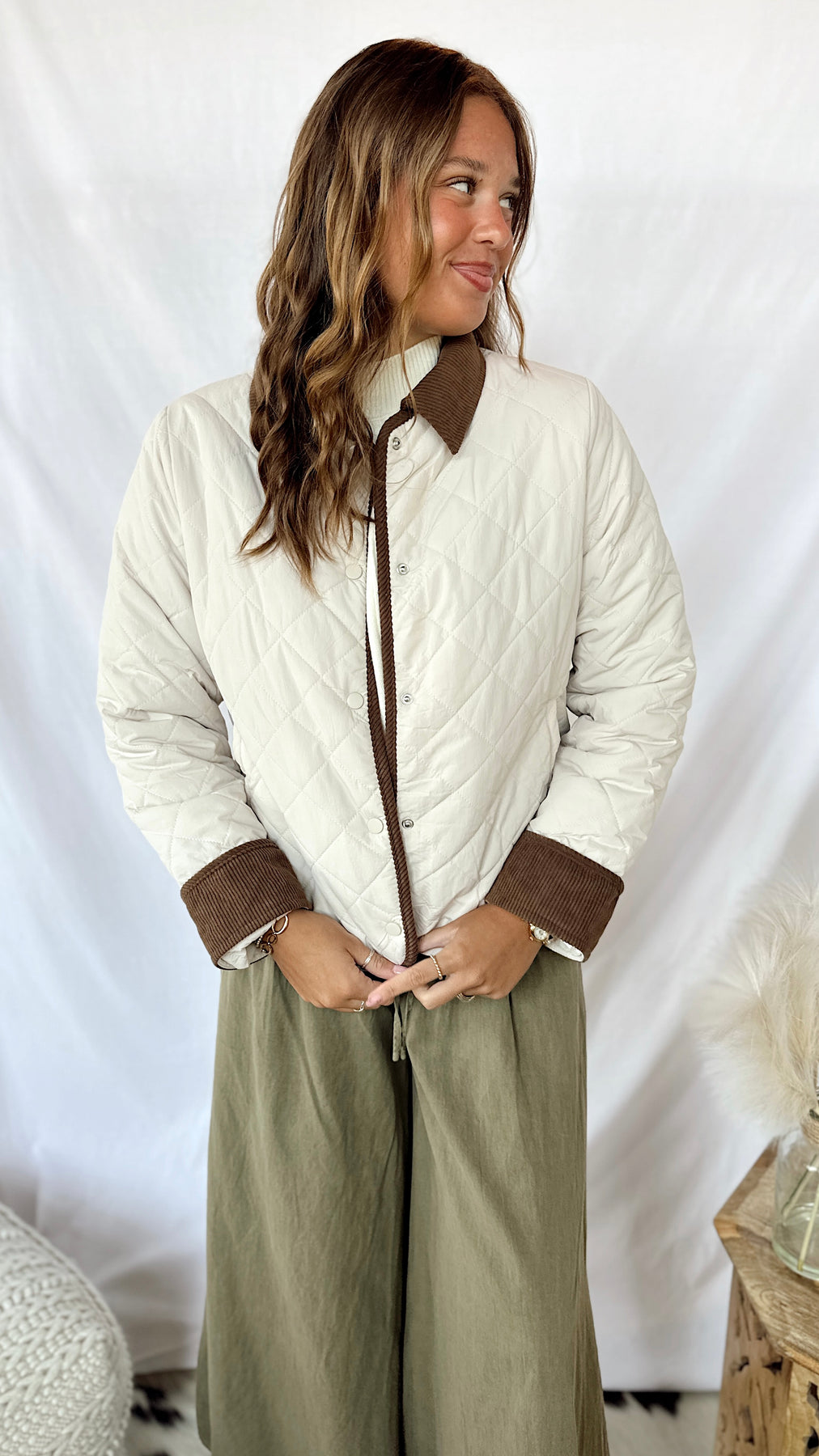 Stay cozy and stylish in The All Natural Jacket, featuring a soft cream quilted design paired with a warm brown collar.