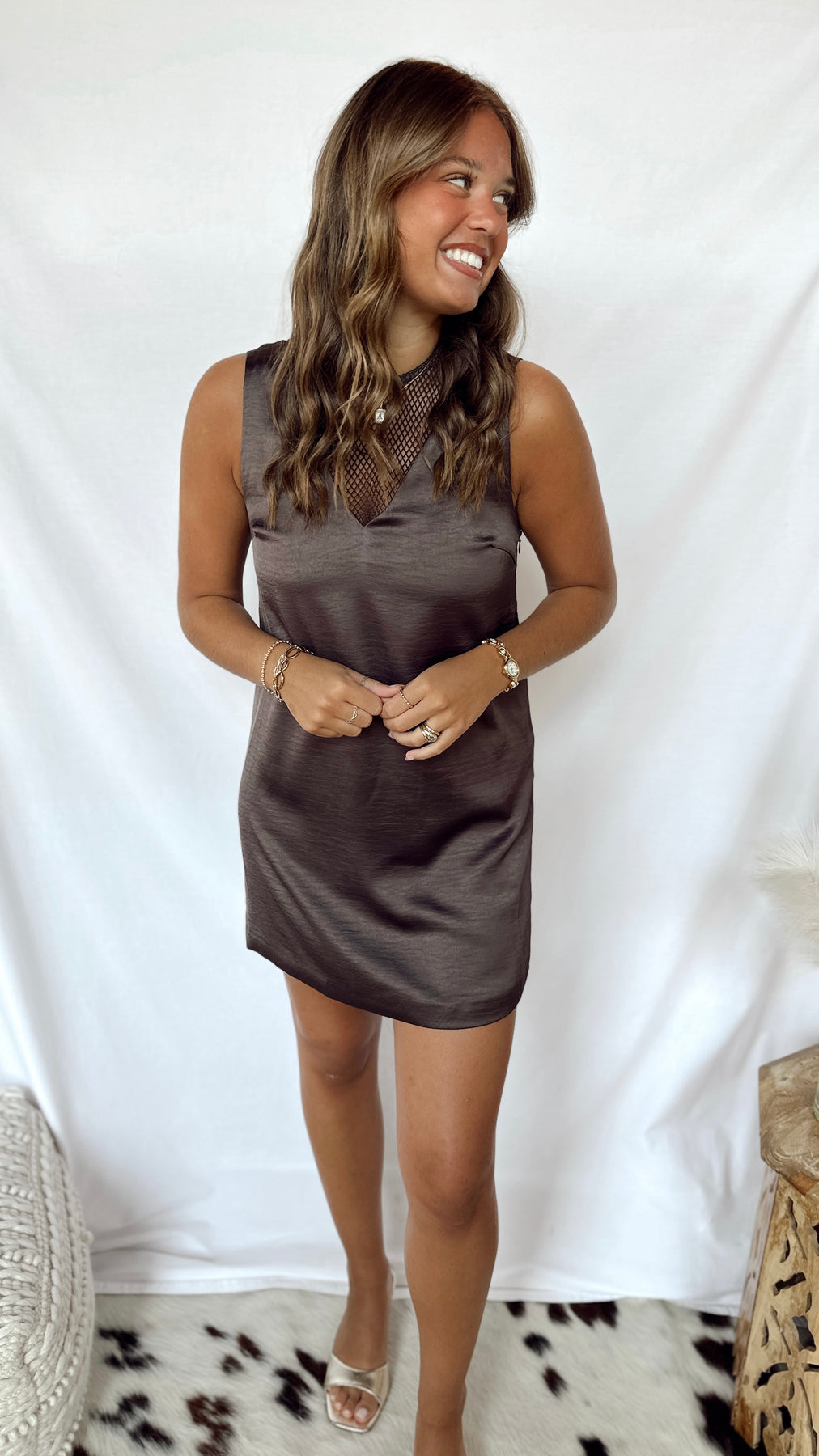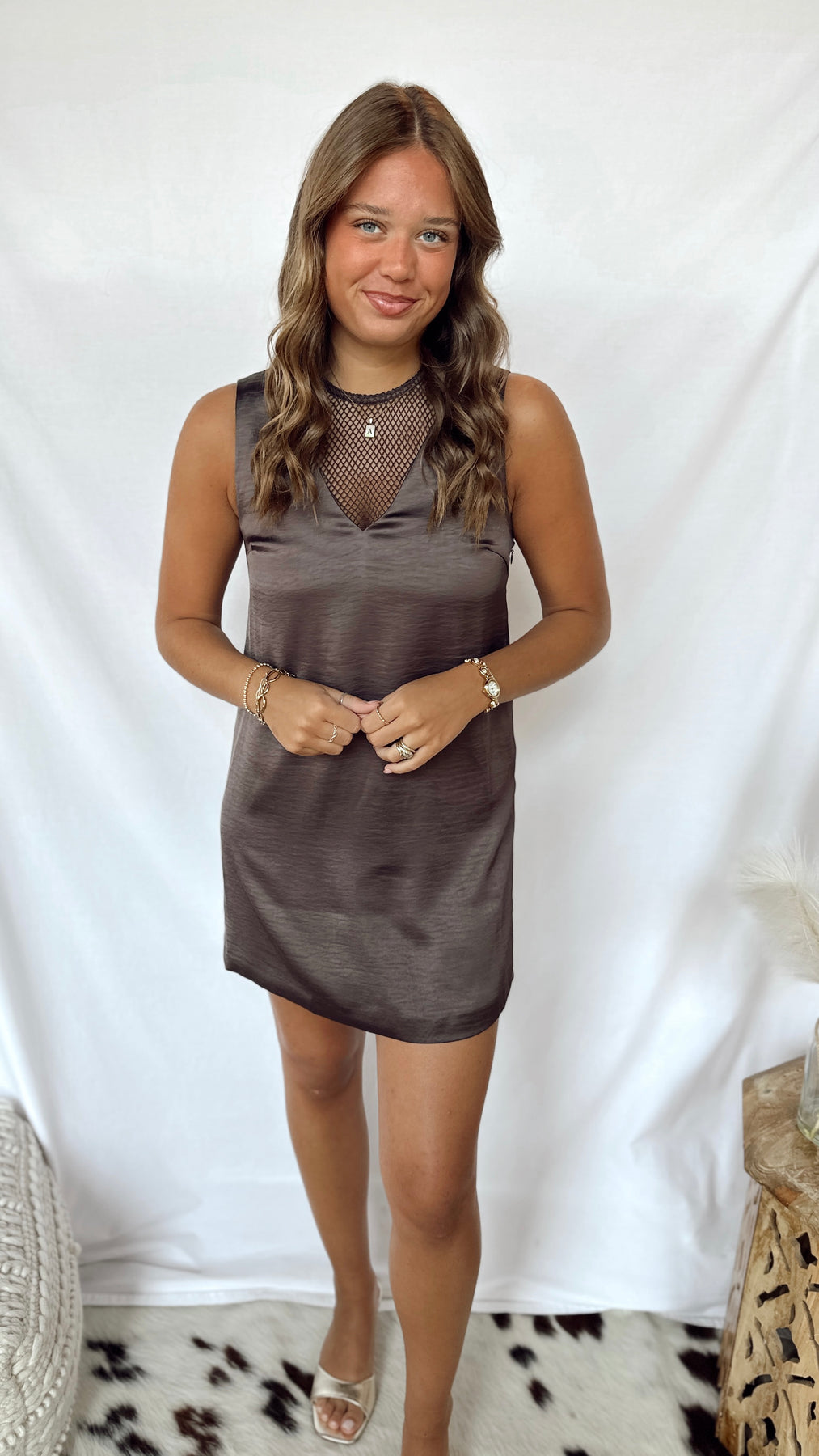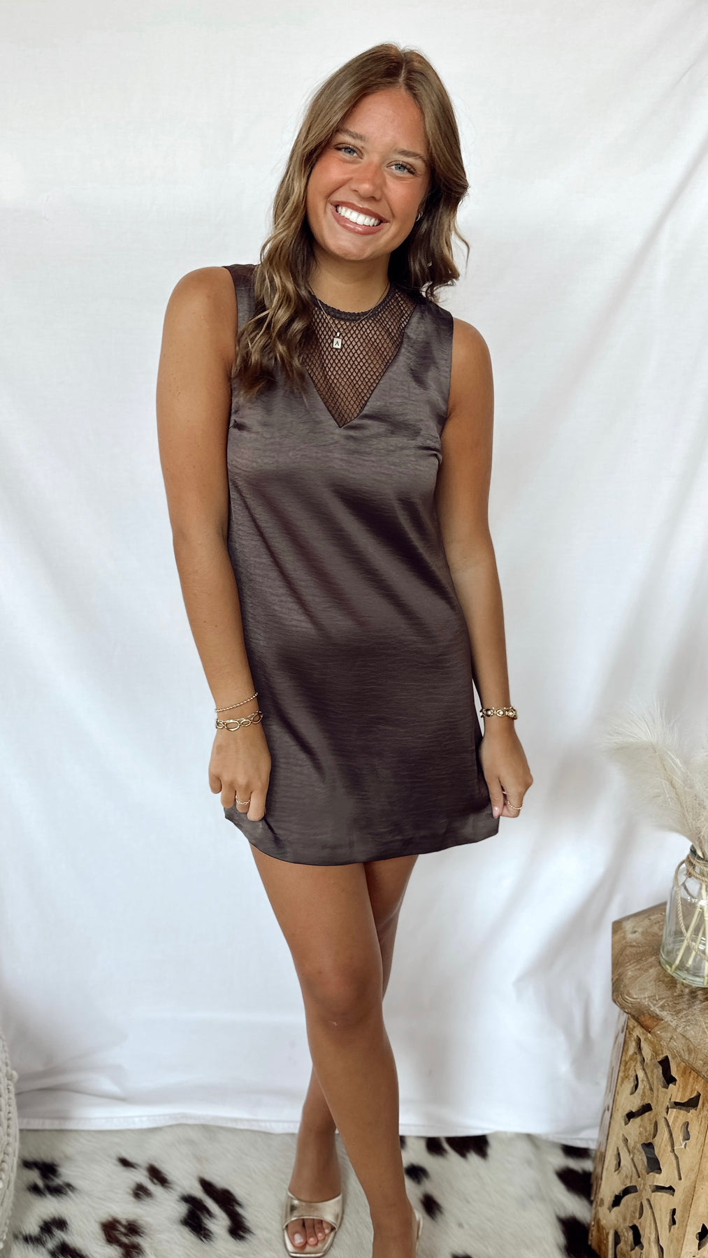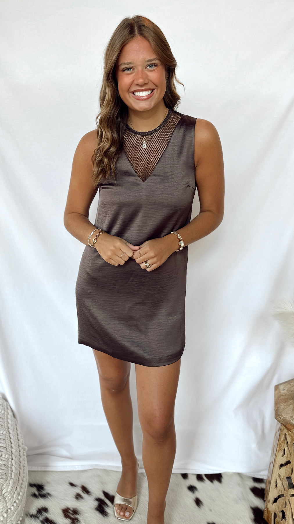 The Arden Dress combines sleek brown satin with playful fishnet accents for a look that’s both elegant and edgy. Perfect for a night out or special occasion, its smooth fabric feels as good as it looks, while the fishnet details add a fun twist to classic style.