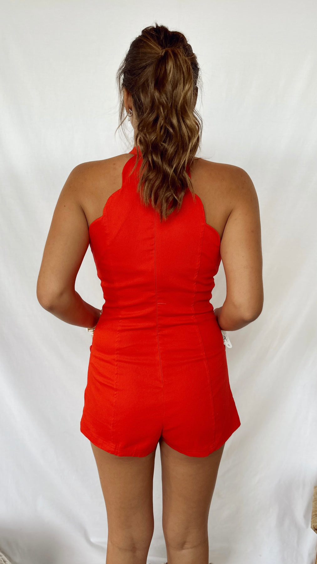 The Ariana Romper is your go-to for playful summer days. Featuring a orange halter neck and delicate scalloped edges, it offers a flattering fit with a fun, flirty vibe.