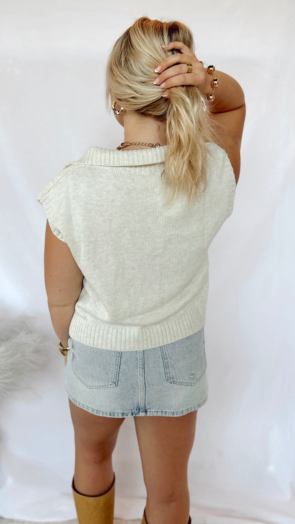 Stay cozy and stylish with the Arrowood Cable Knit Sweater, a cream-colored, sleeveless top featuring a fun half-zip design. Its classic cable knit adds texture while keeping you comfortable, making it perfect for layering or wearing on its own during warmer days. Easy to mix and match, this sweater top brings a playful yet simple touch to any outfit.