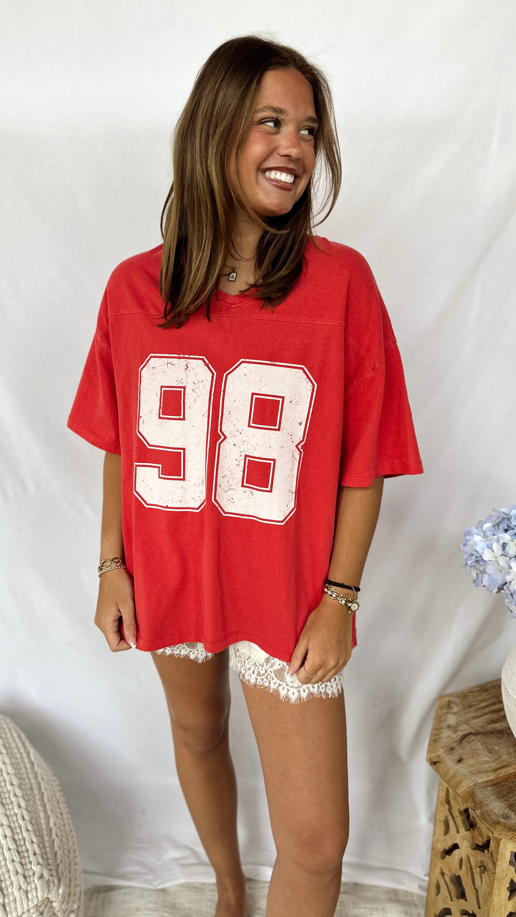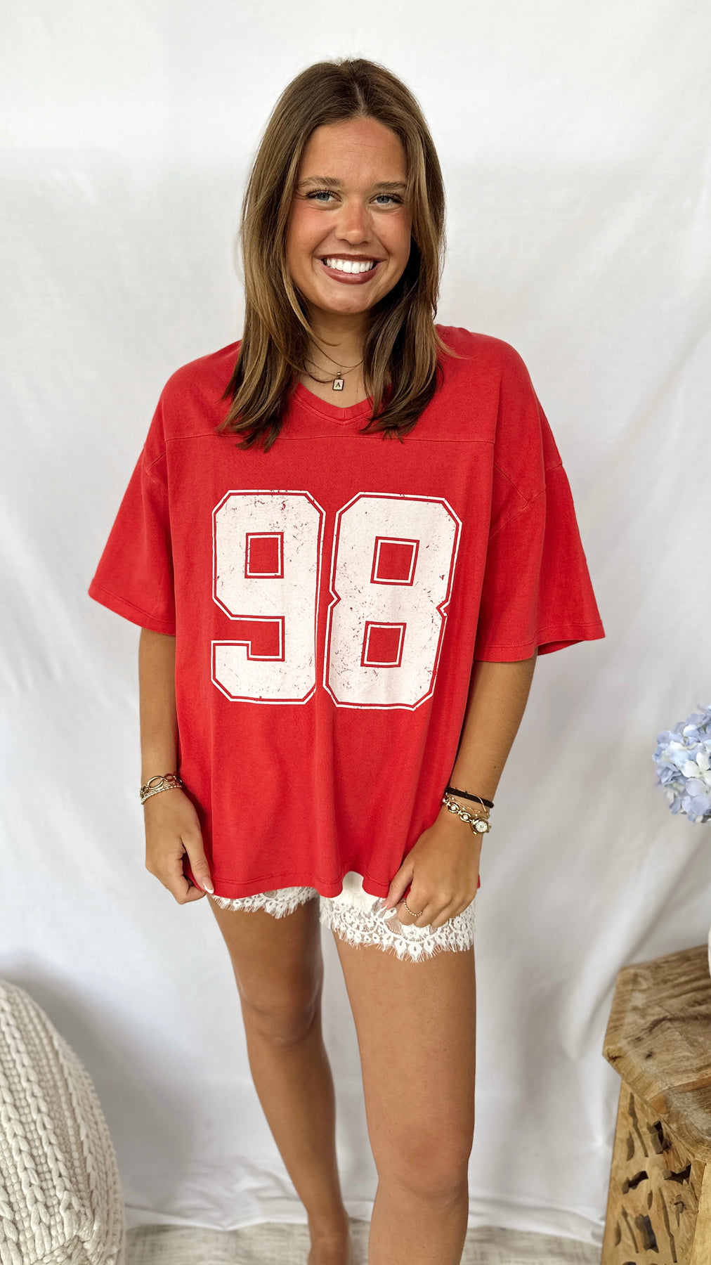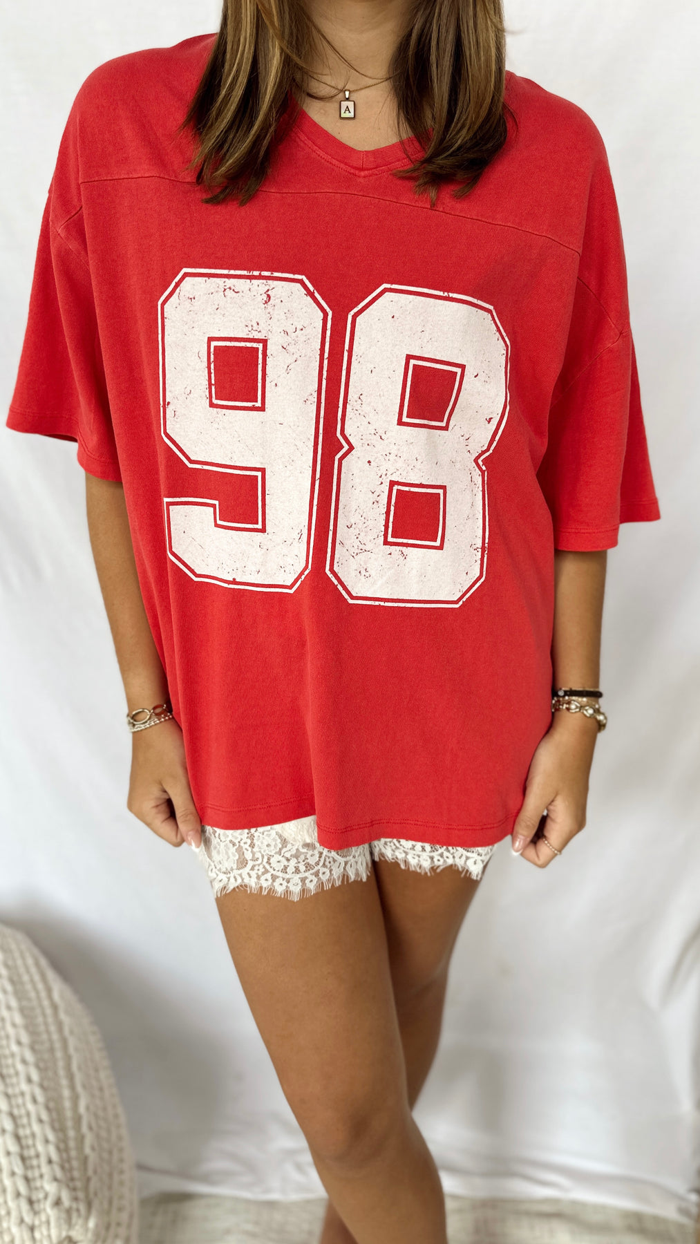 Red cotton v-neck tee with 98 print.