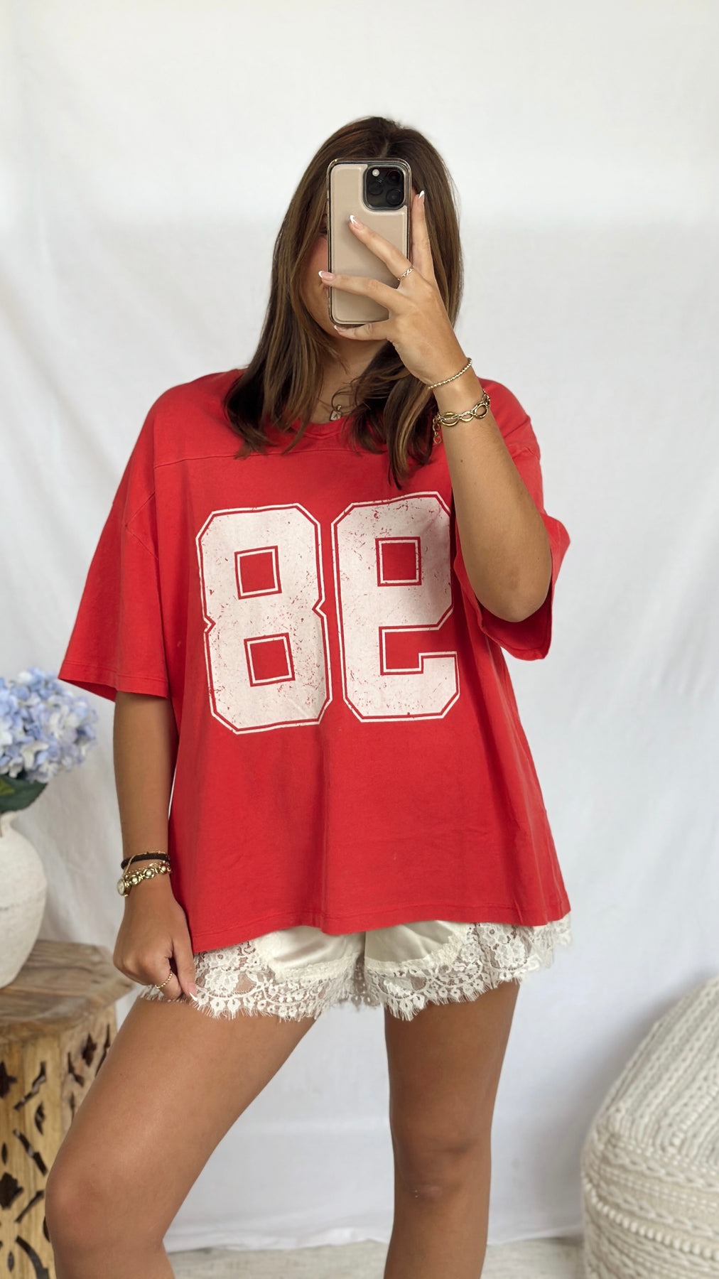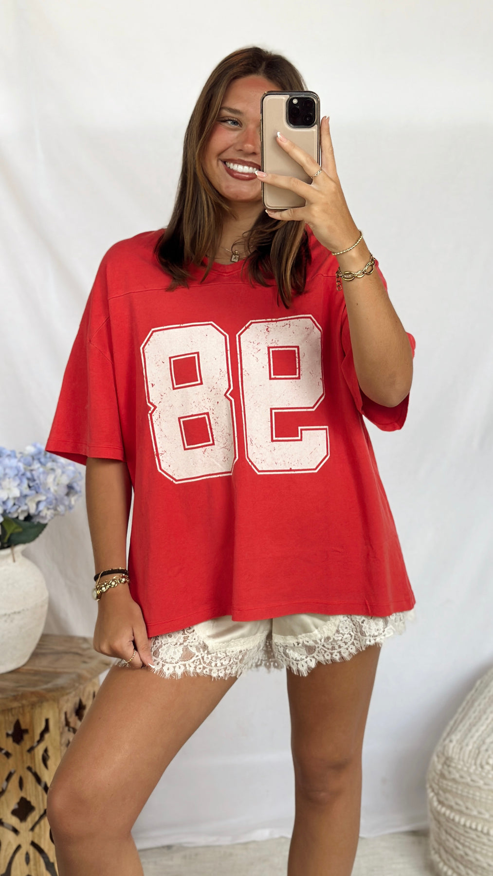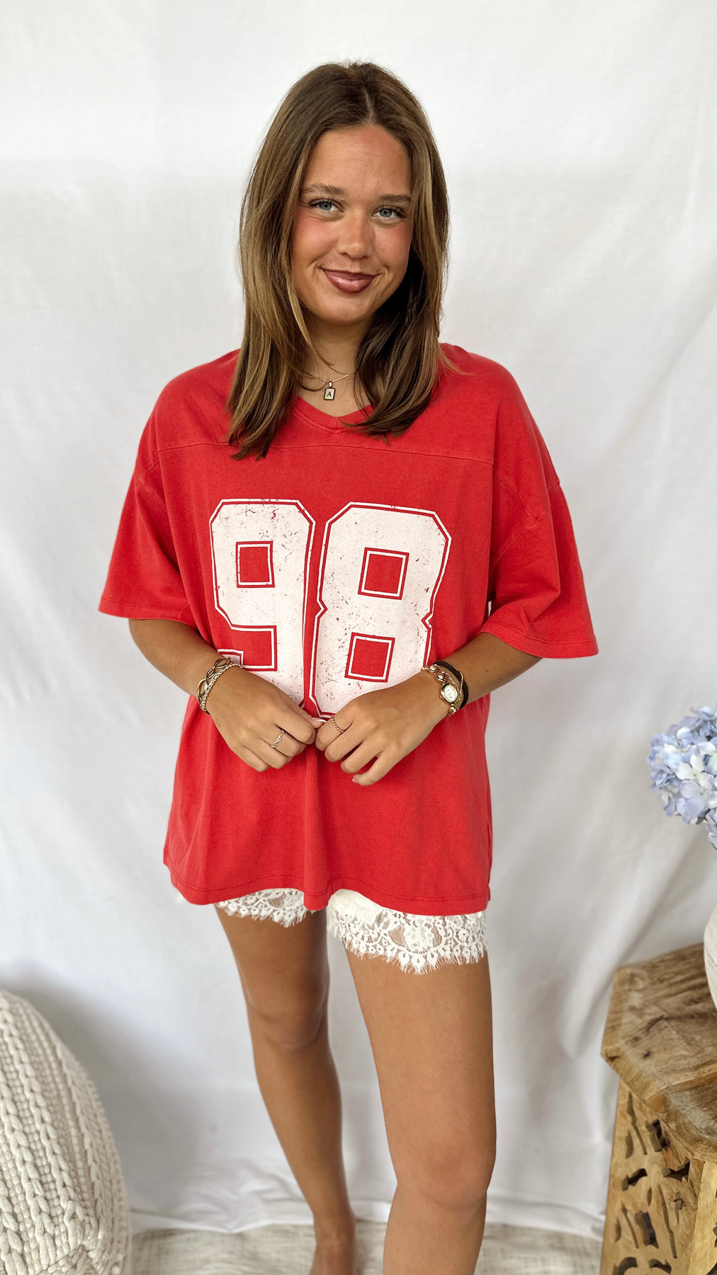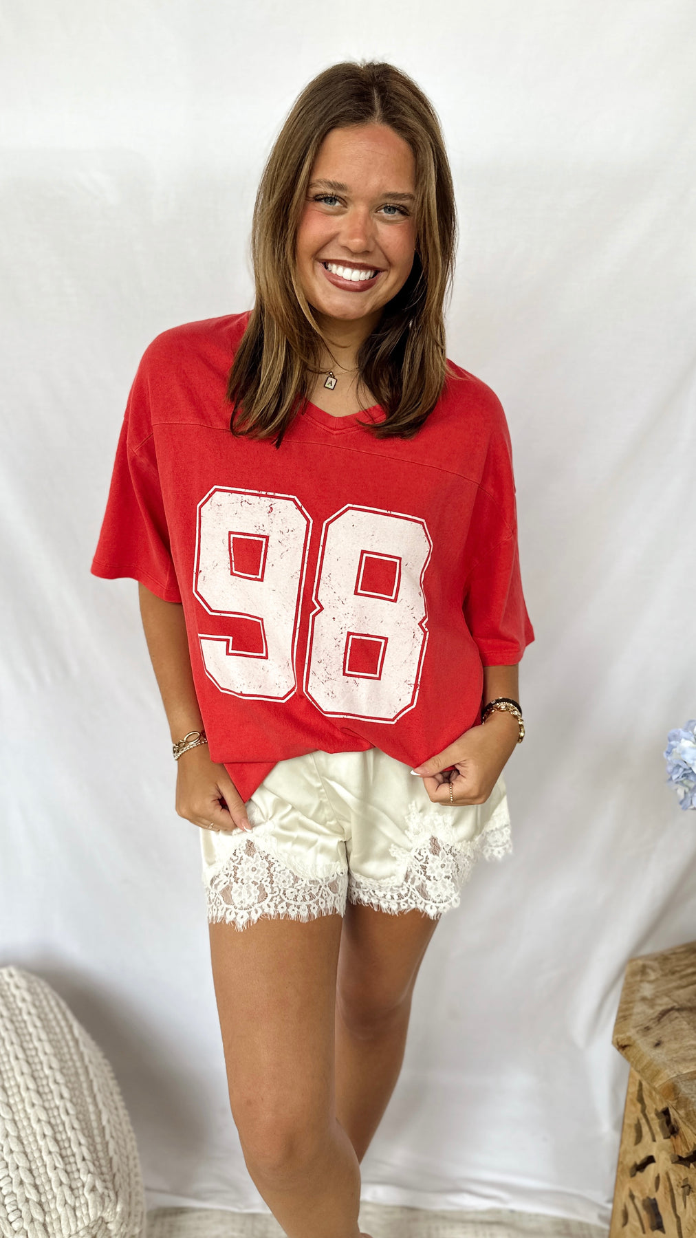 Red cotton v-neck tee with 98 print.