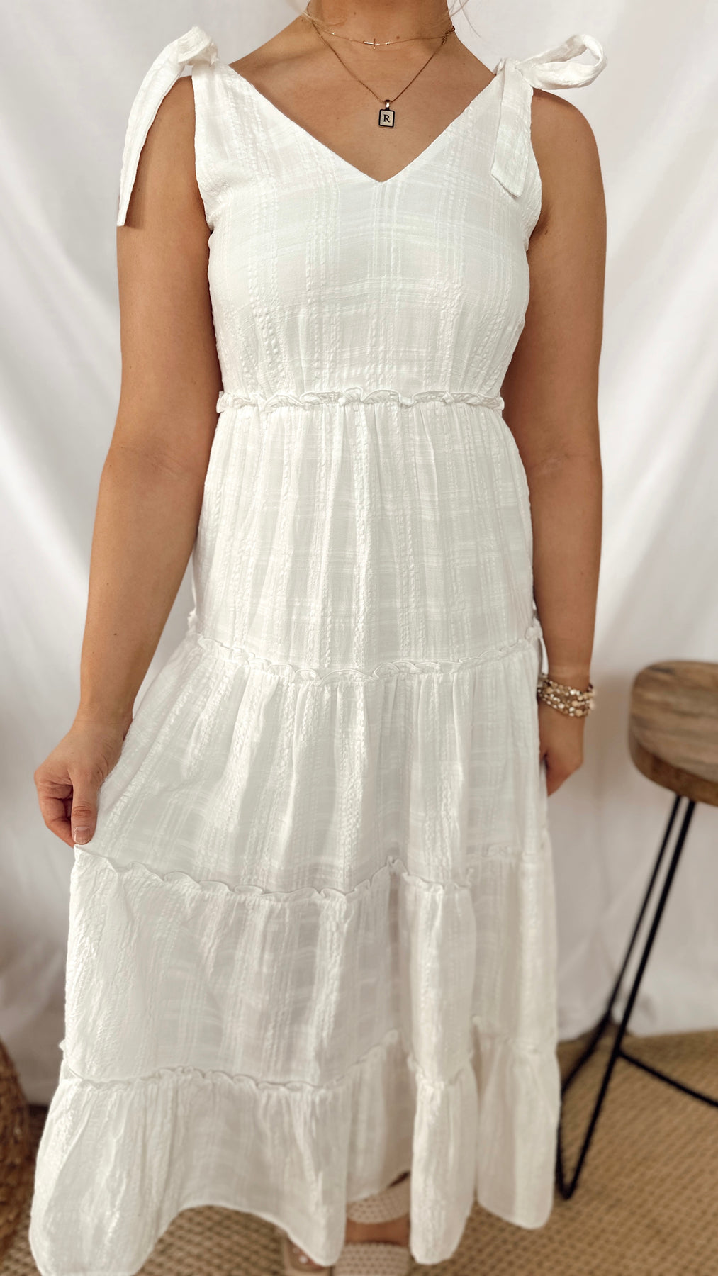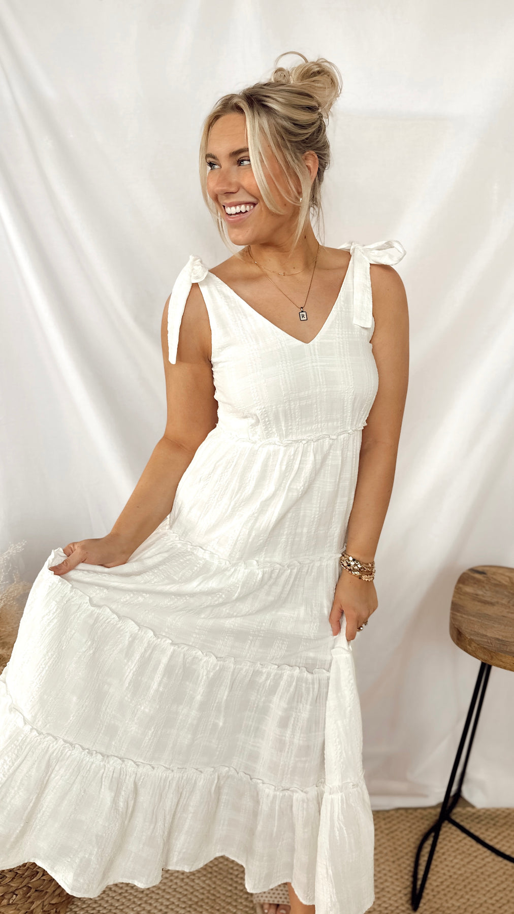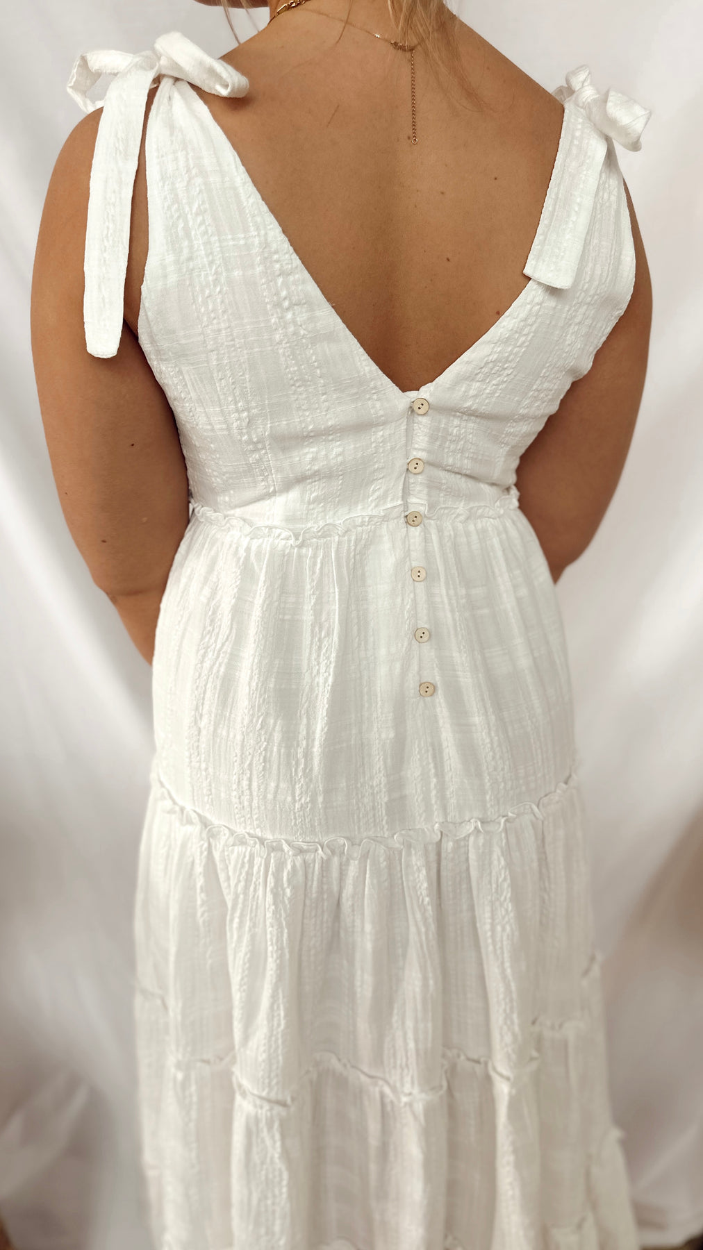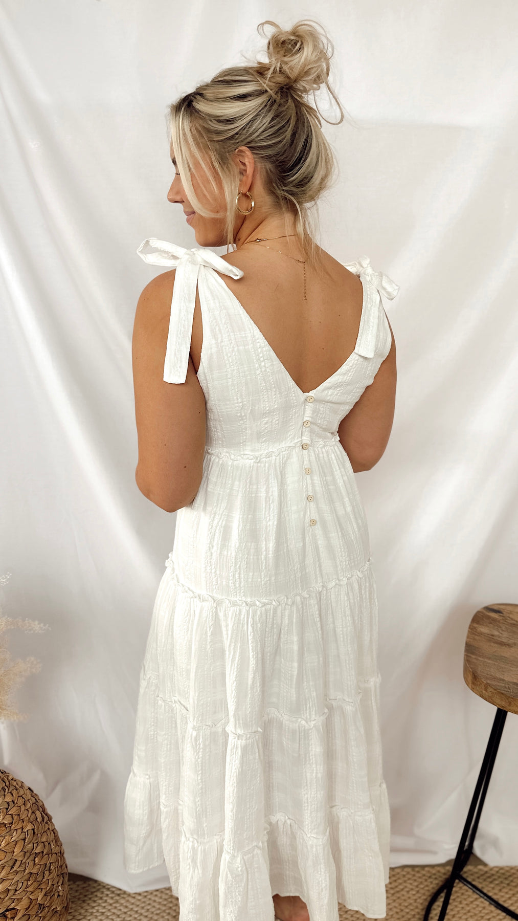 Introducing The Beaufort Dress - a stylish and flowy maxi dress in crisp white. Perfect for any occasion, it features delicate ruffle details and a unique button and tie strap back. Make a statement and stay comfortable in this must-have dress.