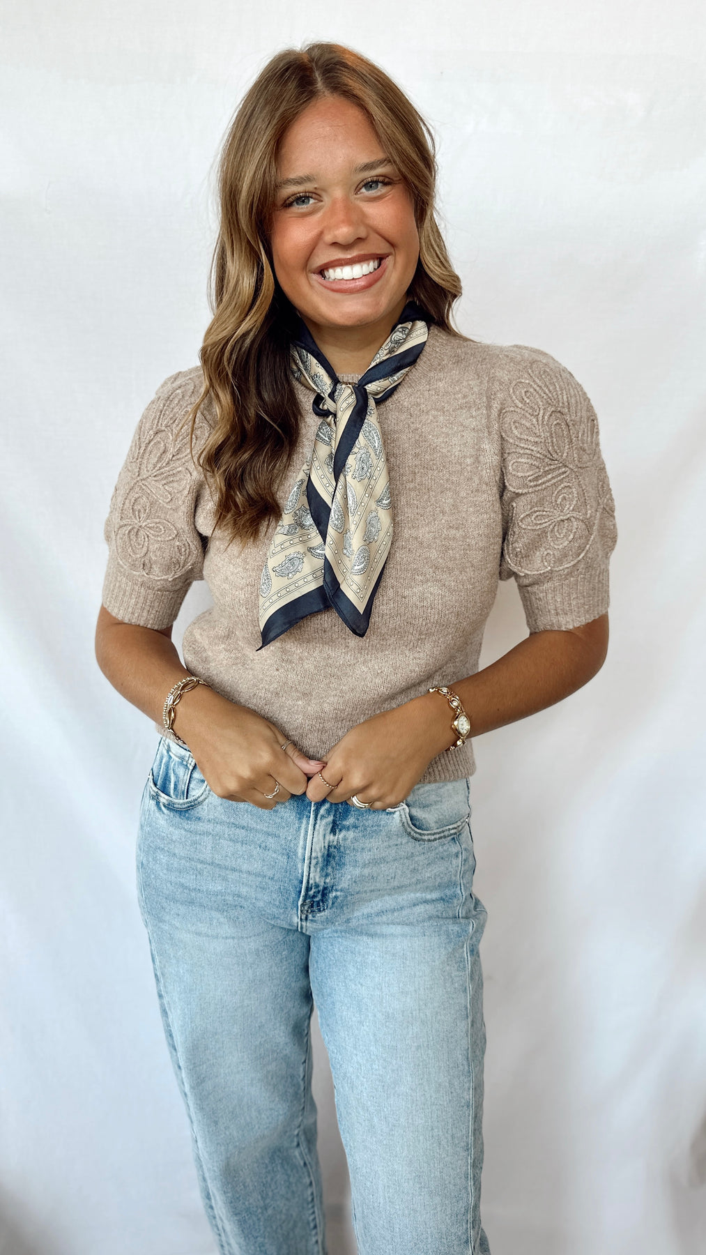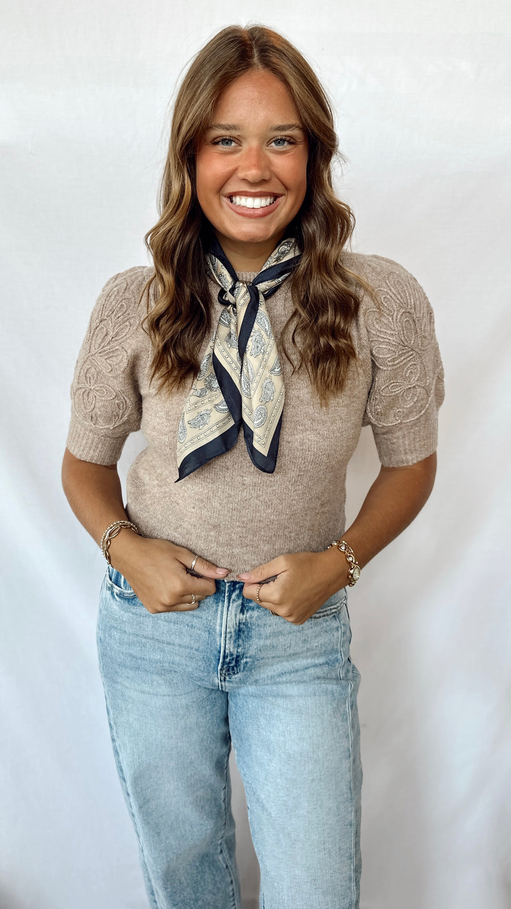 The Bella Top is a cozy brown sweater featuring playful puff sleeves with charming knit detailing. Perfect for adding a touch of fun to your casual wardrobe while keeping you comfy and stylish all day long.