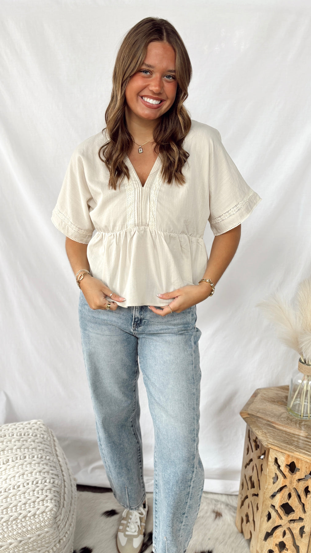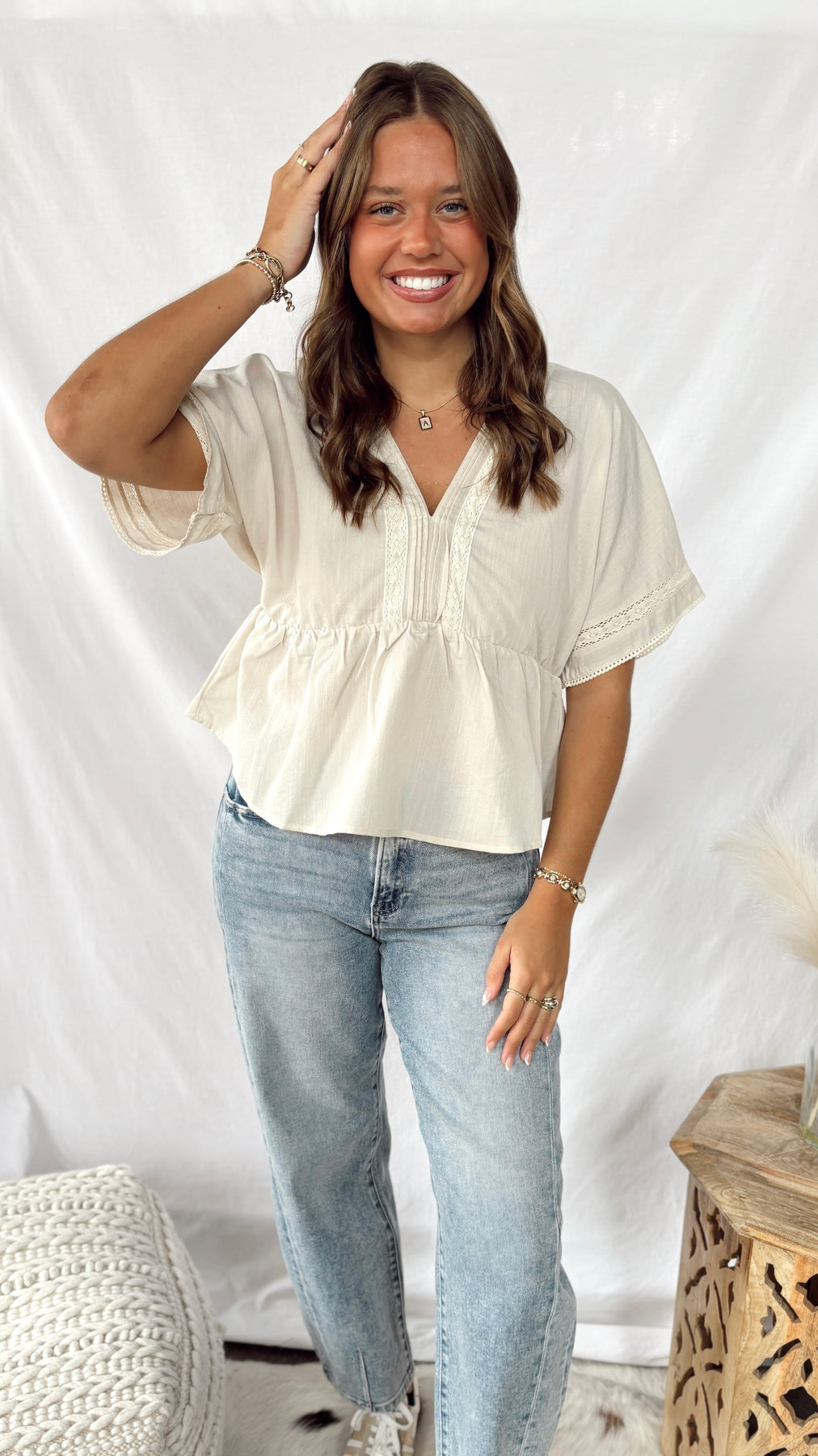 The Blair Top is a fun and fresh cream-colored piece featuring short sleeves and a pretty V-neck. Its charming floral pattern adds a touch of effortless style, perfect for brightening up any casual outfit. Comfortable and easy to wear, it’s a go-to top for everyday fun.