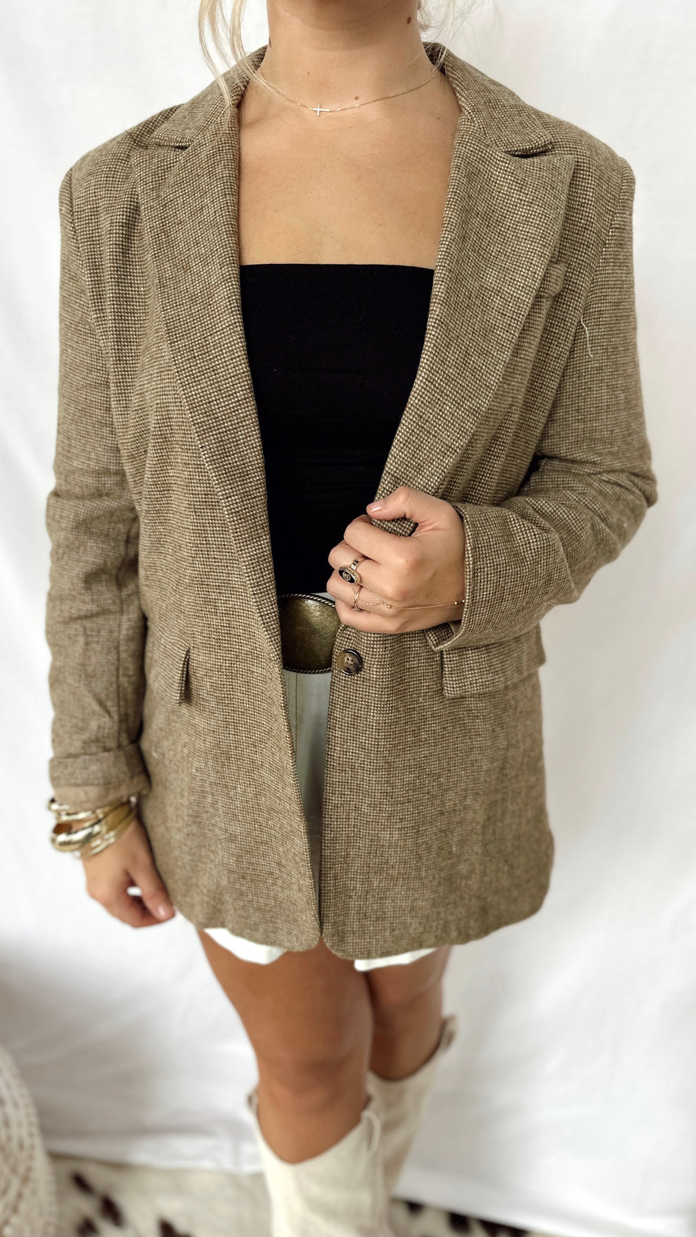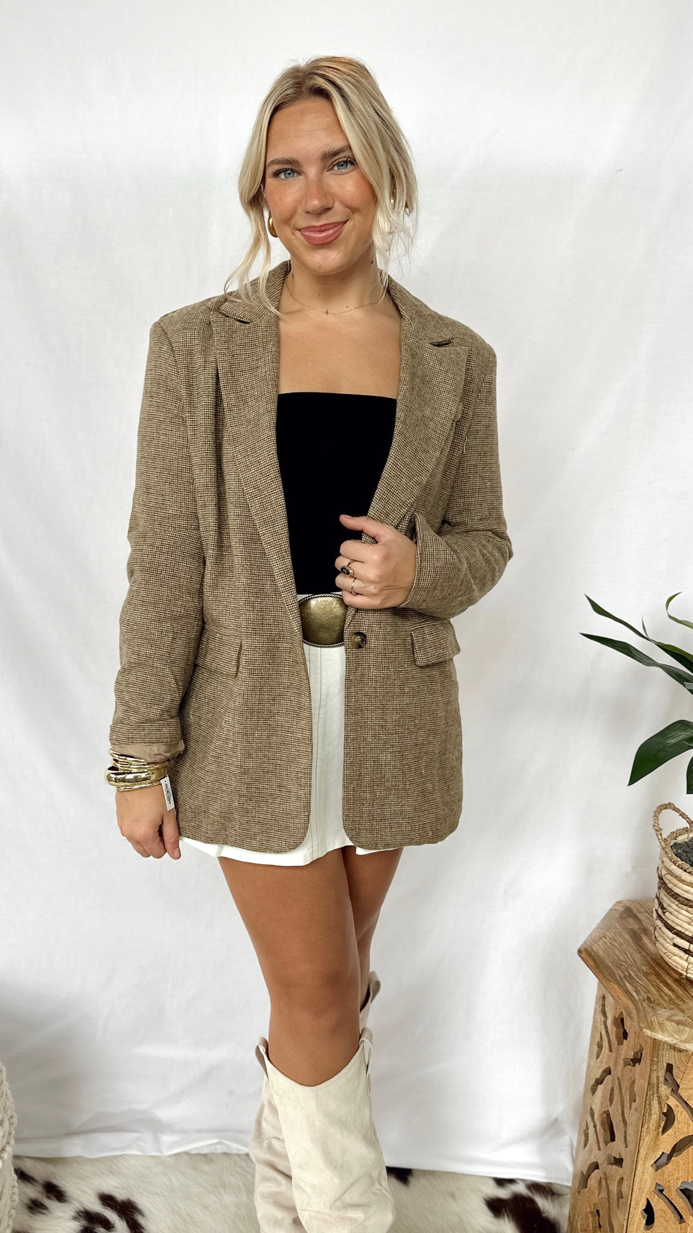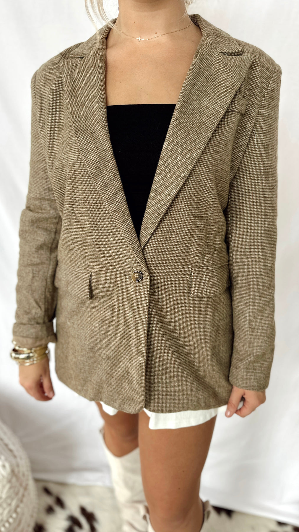 The Bonnie Blazer brings a playful twist to your wardrobe with its warm brown taupe and vibrant orange hues. Perfect for adding a pop of color while keeping things cozy and stylish, this blazer is your go-to for effortless, fun fashion.