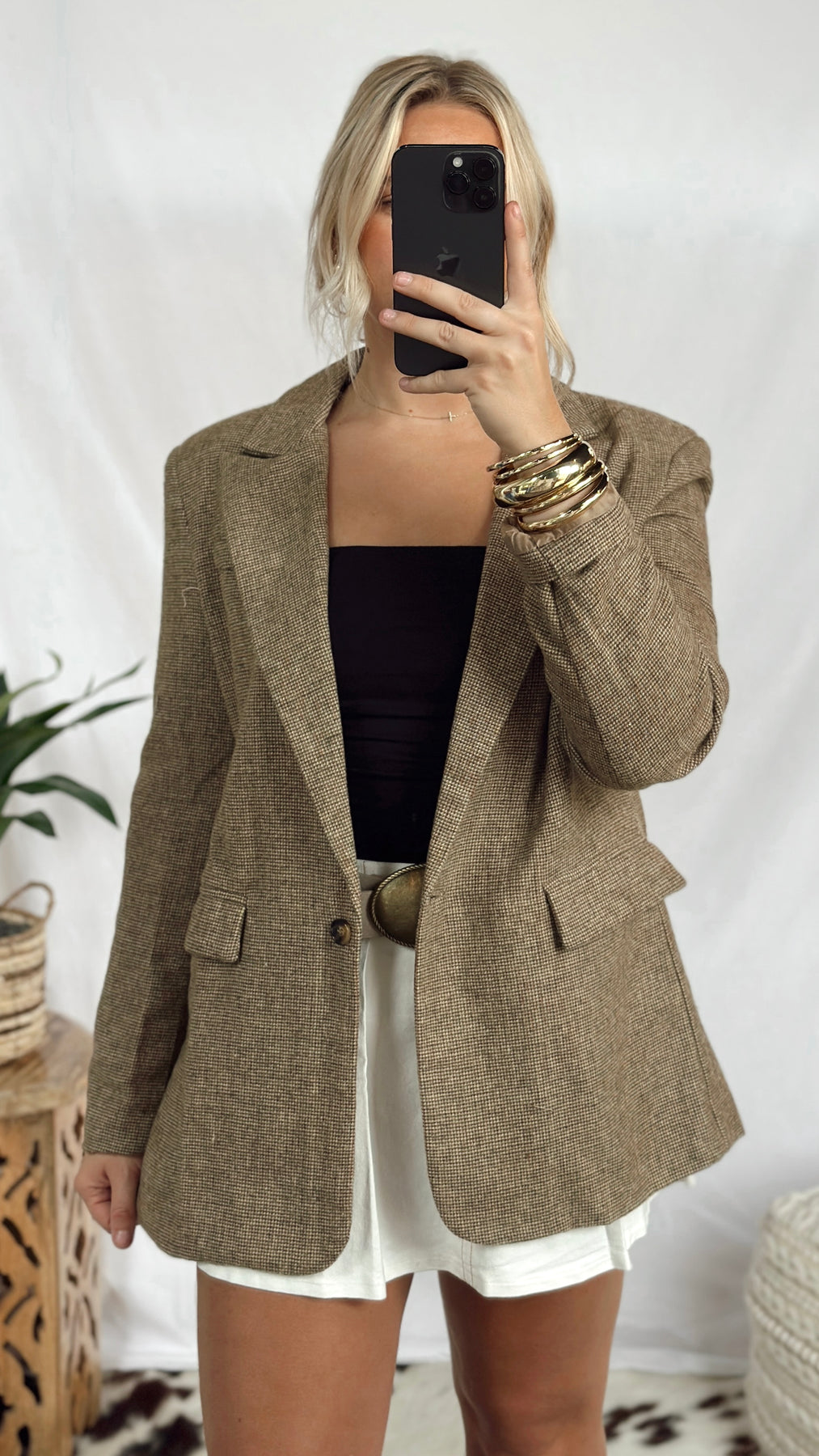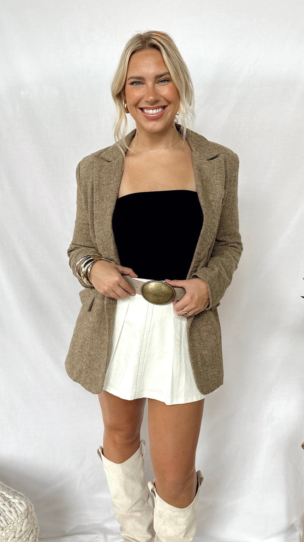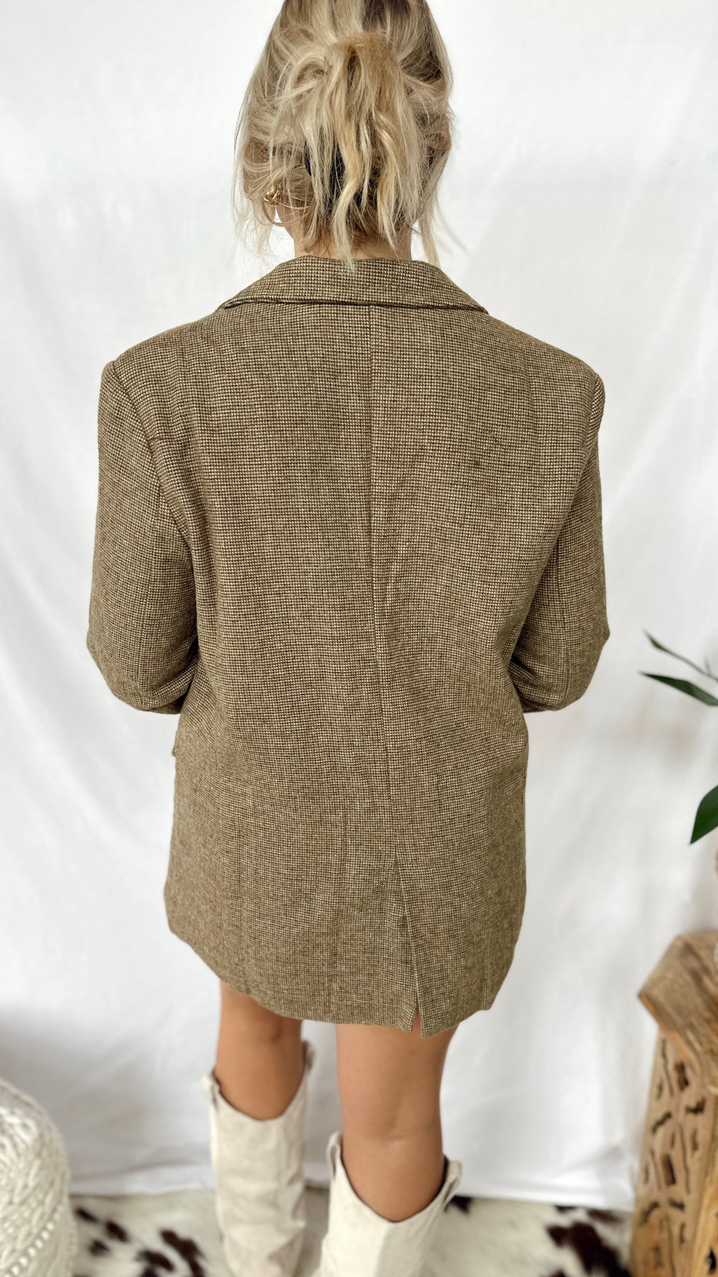 The Bonnie Blazer brings a playful twist to your wardrobe with its warm brown taupe and vibrant orange hues. Perfect for adding a pop of color while keeping things cozy and stylish, this blazer is your go-to for effortless, fun fashion.