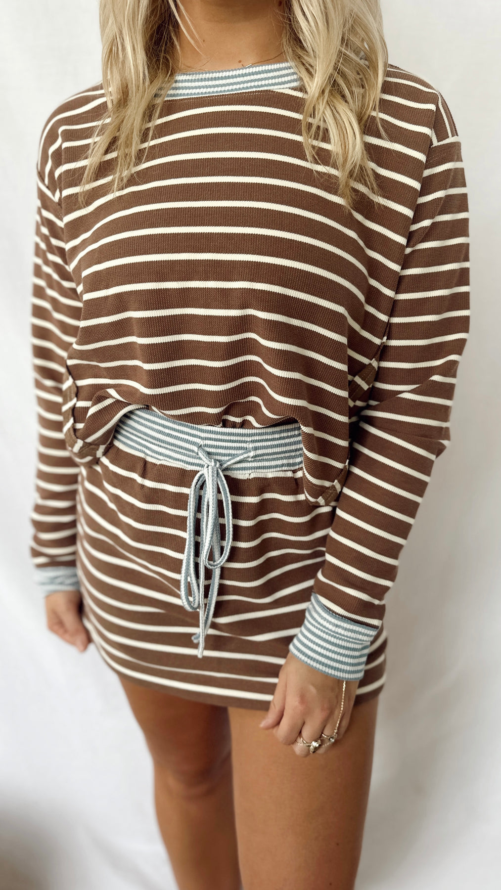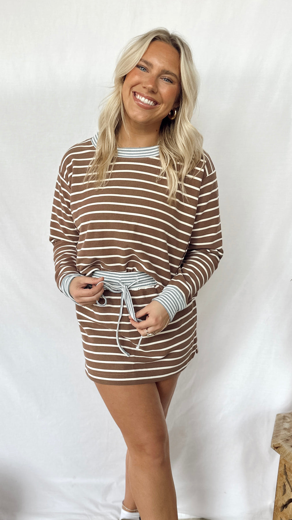 The Brunch Date Skort features a playful mix of brown and white stripes with charming blue and white striped accents. Perfect for sunny days and casual outings, this fun and easy-to-wear skort combines style and comfort effortlessly.