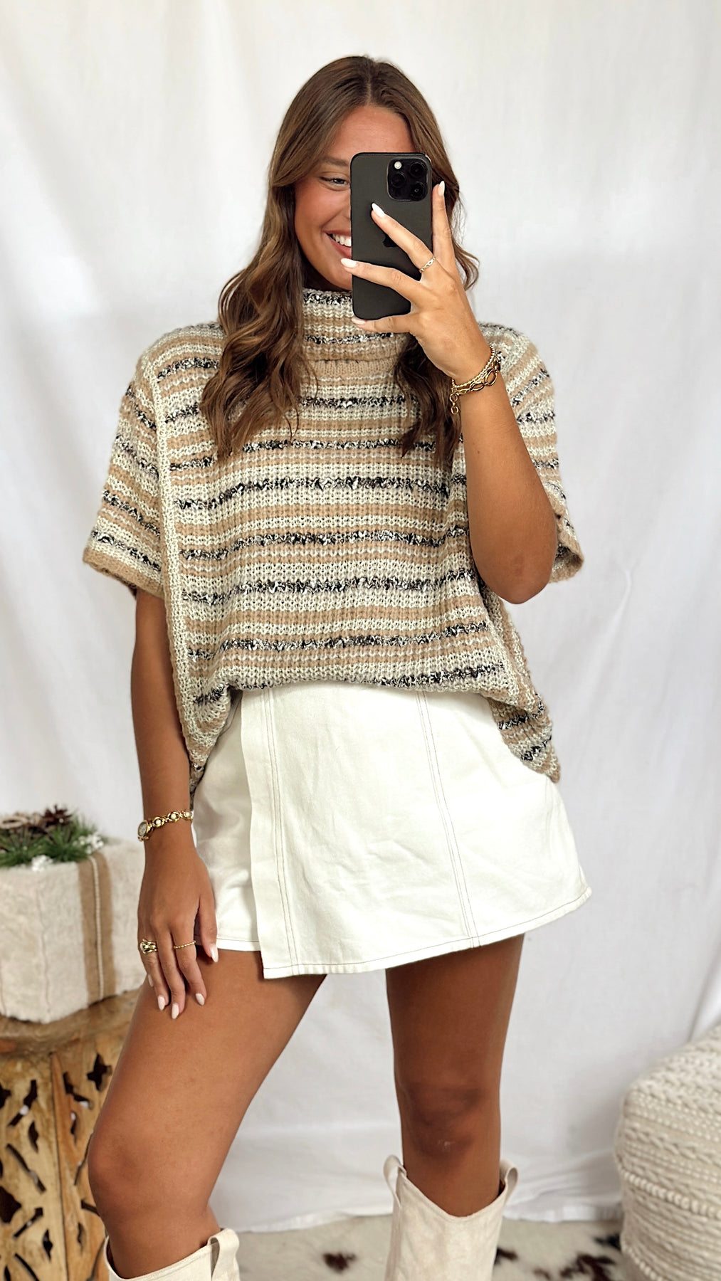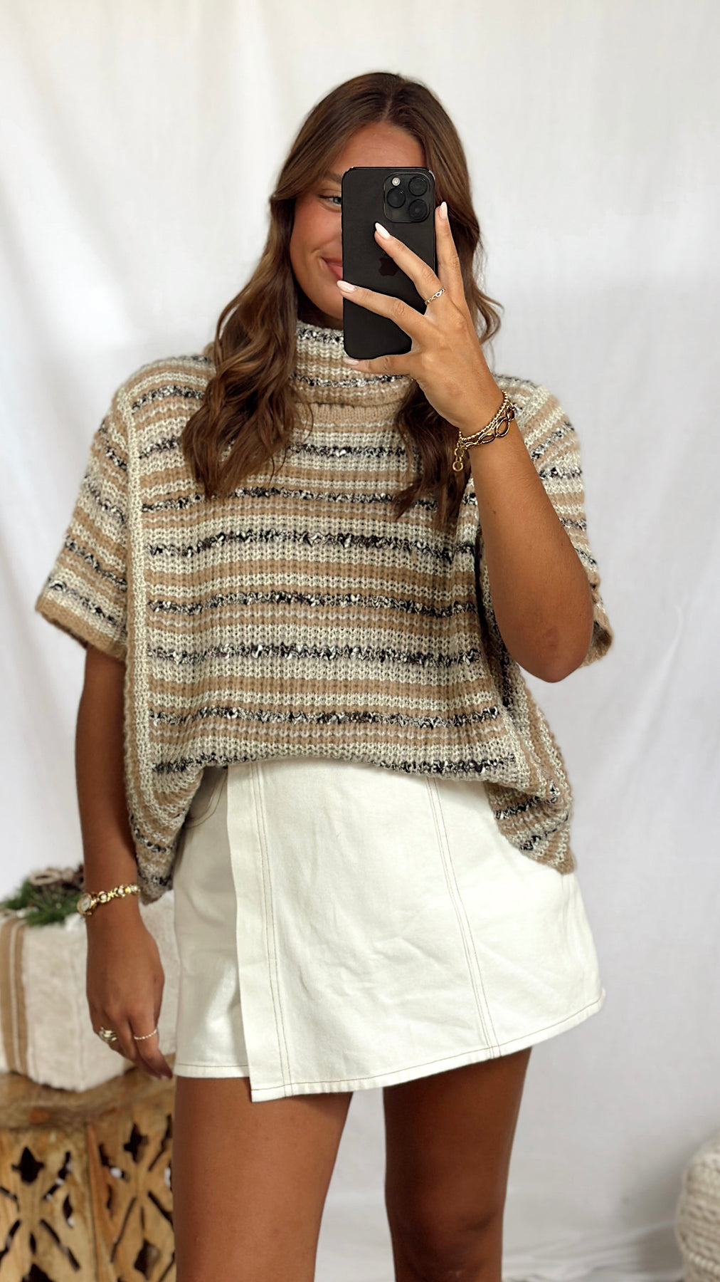 The Carmen Sweater is a cozy turtleneck with a fun twist—its tan, black, and silver threaded knit adds a spark of style to your everyday look. Perfect for chilly days, it keeps you warm while standing out with subtle shimmer. Easy to pair and comfy to wear, this sweater brings simple charm to any outfit.