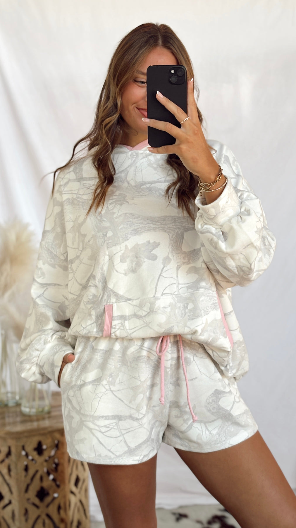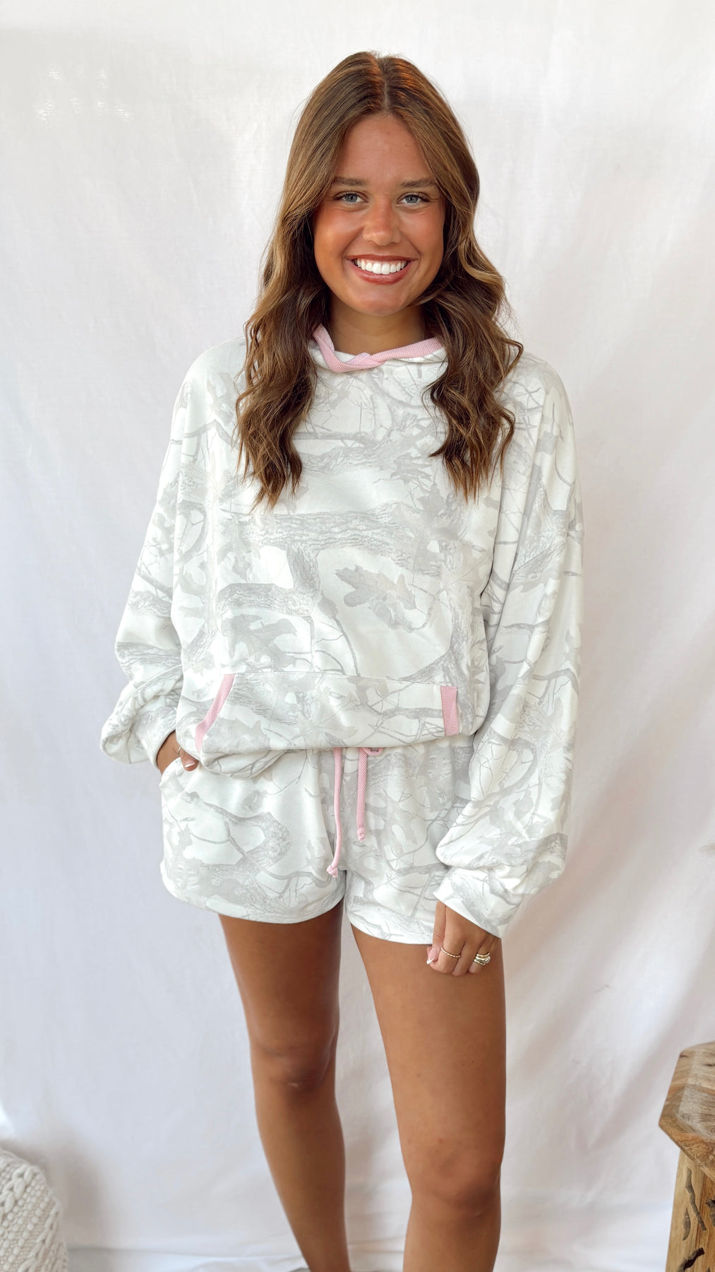 The Comfy Camo Sweatshorts blend cozy comfort with playful style. Choose from white fabric with classic camo or light grey camo accented by a sweet baby pink drawstring. Perfect for lounging or casual outings, these shorts keep you relaxed and effortlessly cool all day long.