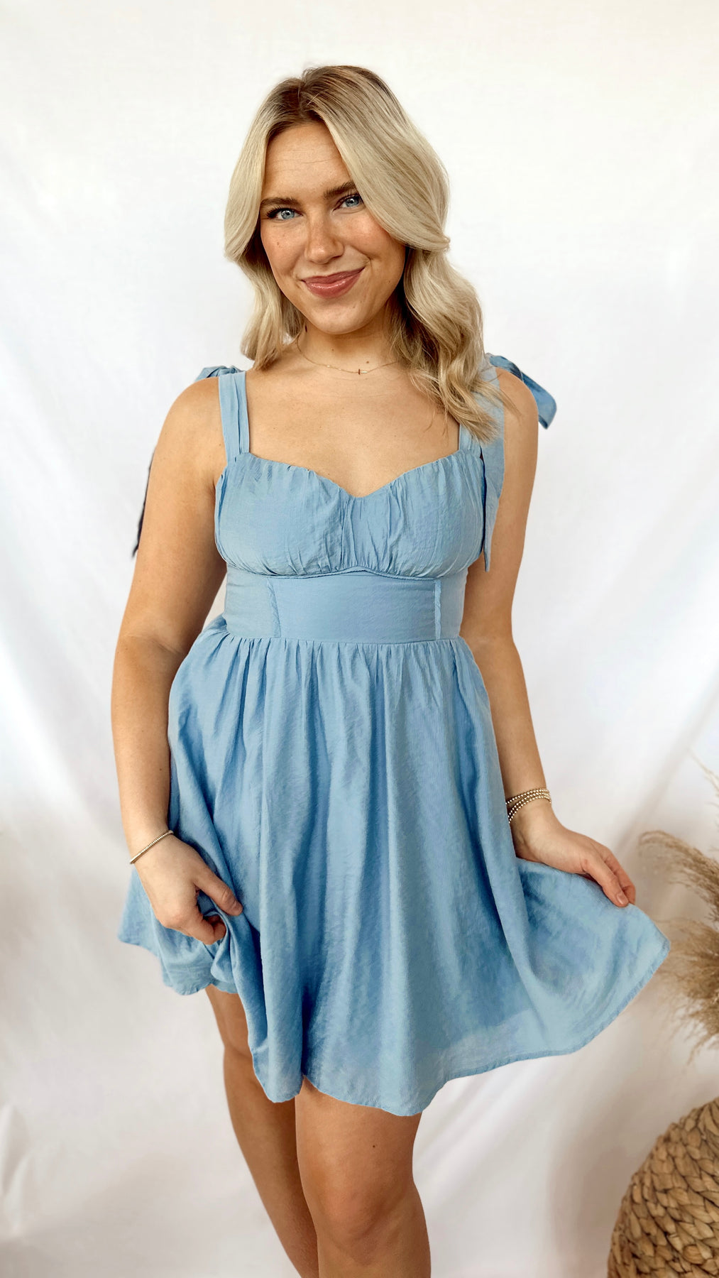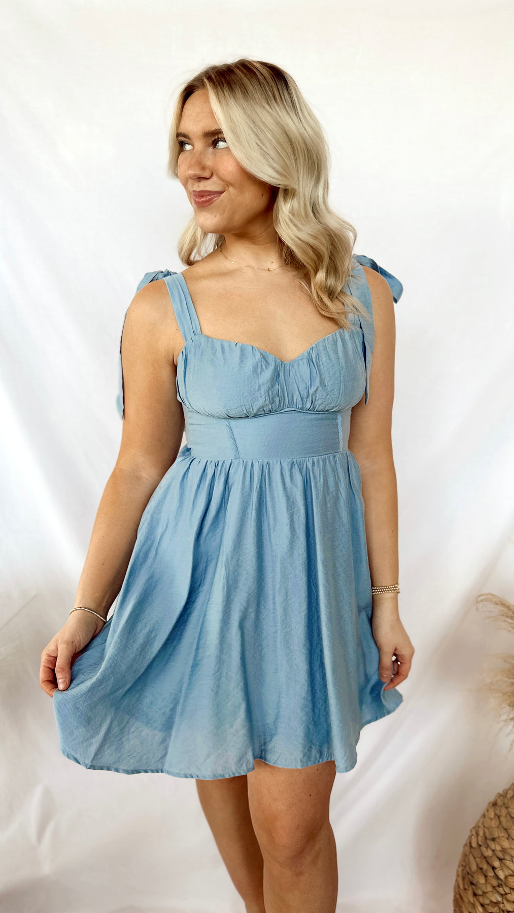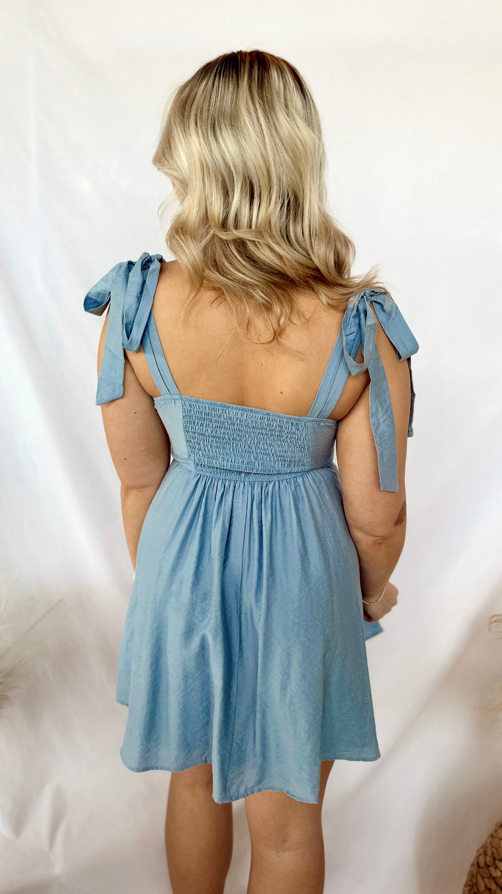 Experience the ultimate dreamy vibes with our Dream of Me Dress. Flowy and mini in length, this dress features playful tie straps that add a touch of whimsy. Available in both white and blue, it's the perfect choice for a fun and effortless look.