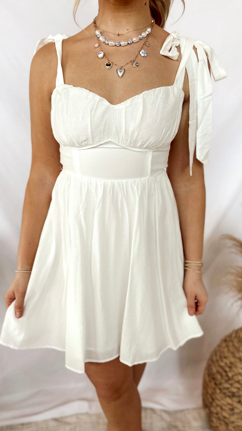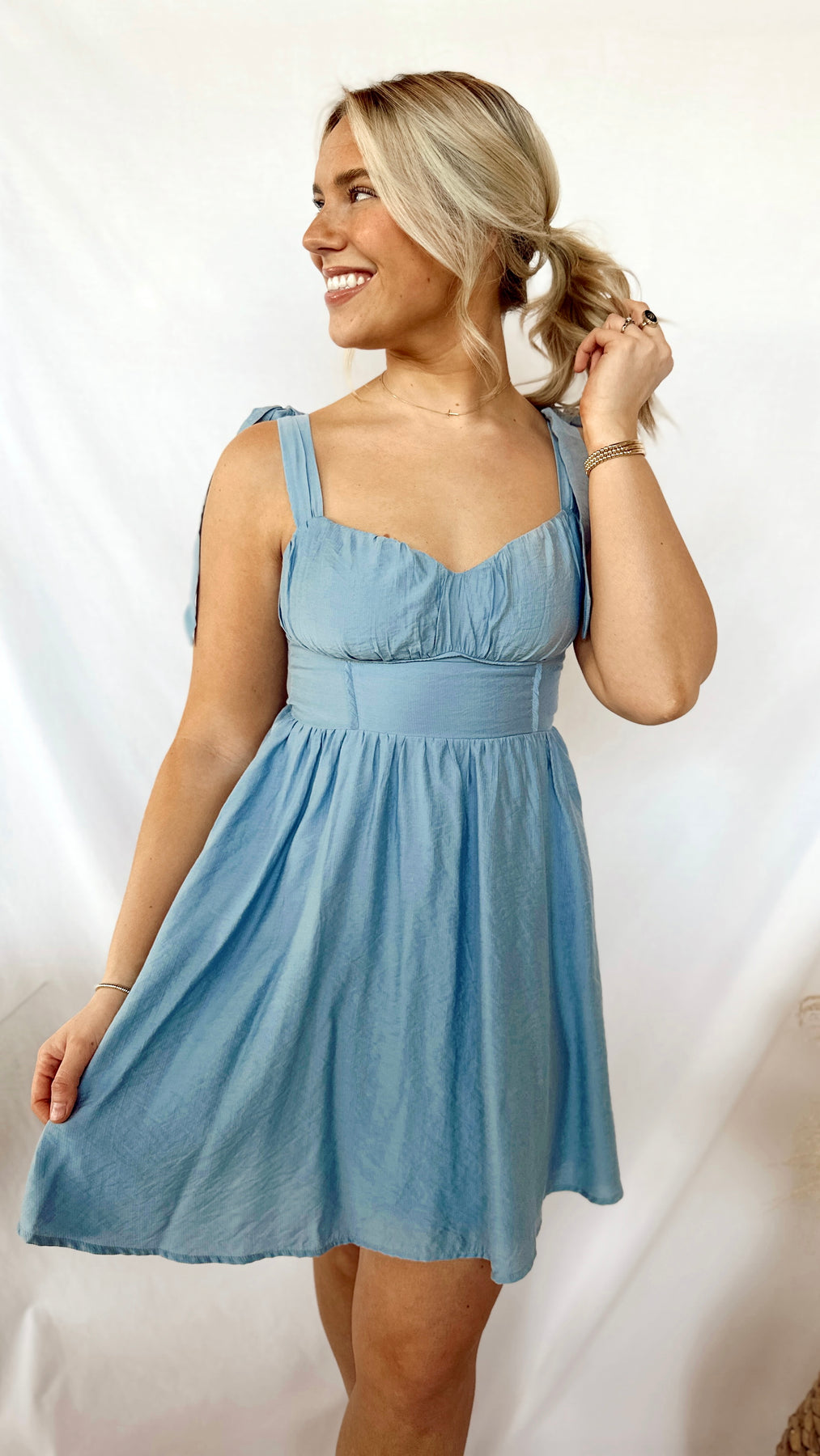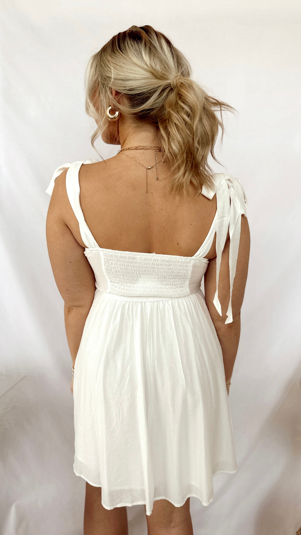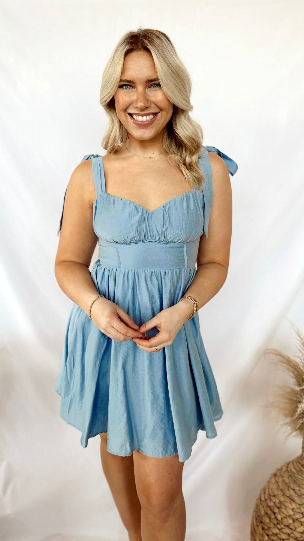 Experience the ultimate dreamy vibes with our Dream of Me Dress. Flowy and mini in length, this dress features playful tie straps that add a touch of whimsy. Available in both white and blue, it's the perfect choice for a fun and effortless look.