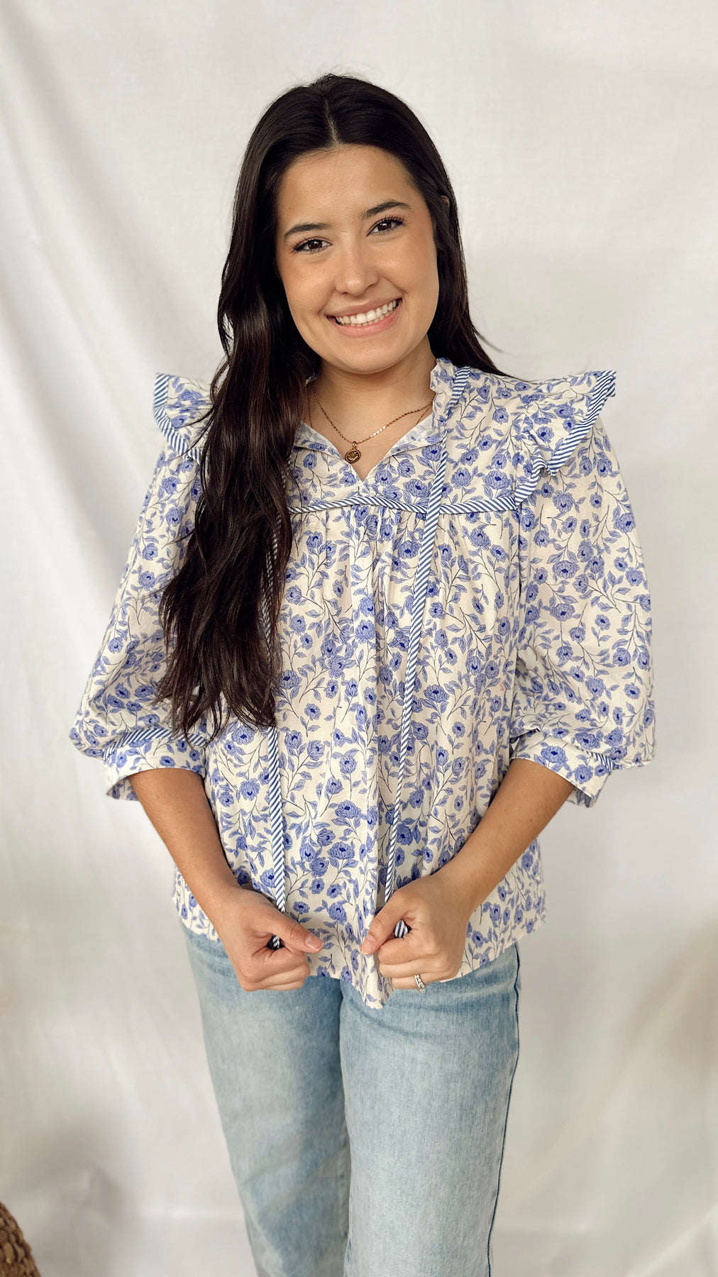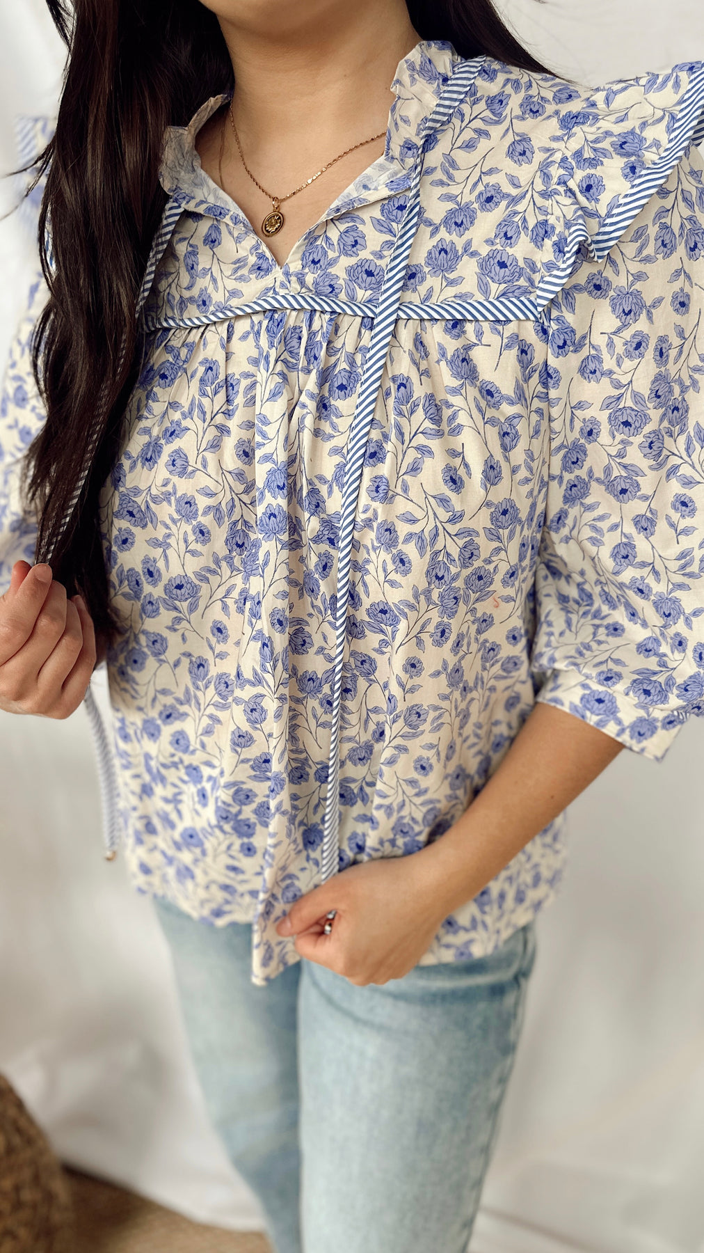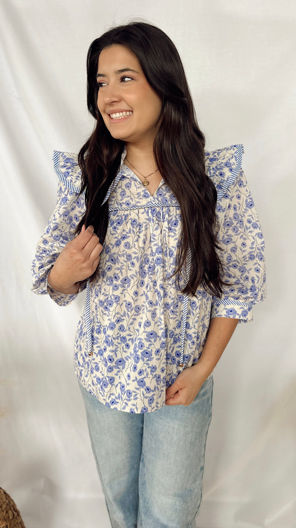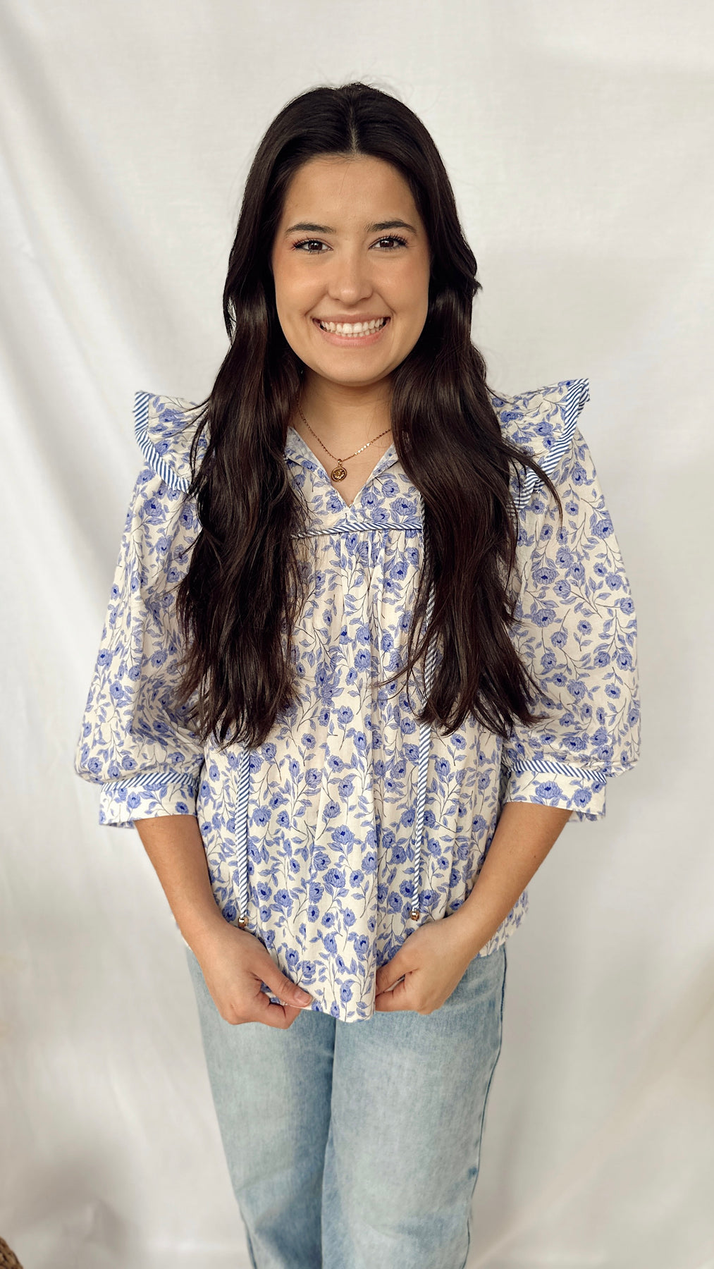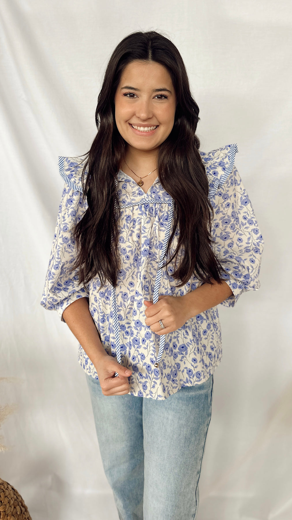 Introducing The Elizabeth Top, a fun and simple addition to your wardrobe. This blue floral top features puff sleeves and a tie top, perfect for adding a touch of whimsy to any outfit. Elevate your style with ease and make a statement wherever you go.