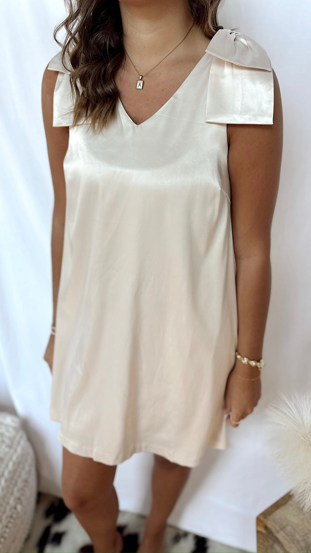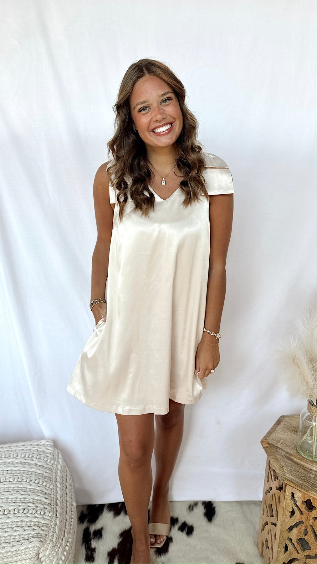 The Francesca Dress shines in a soft champagne satin with playful bow tie details on the sleeves. Its flattering v-neck adds a touch of elegance while keeping the look light and fun. Perfect for any occasion where you want to feel effortlessly chic.