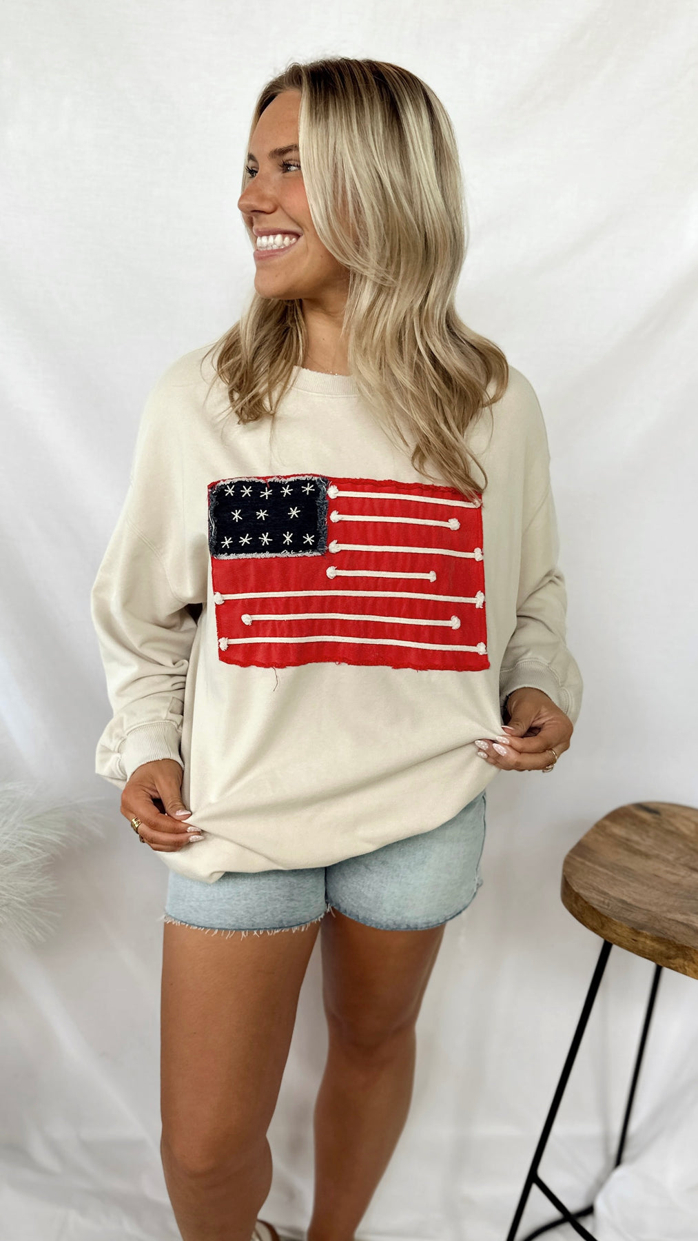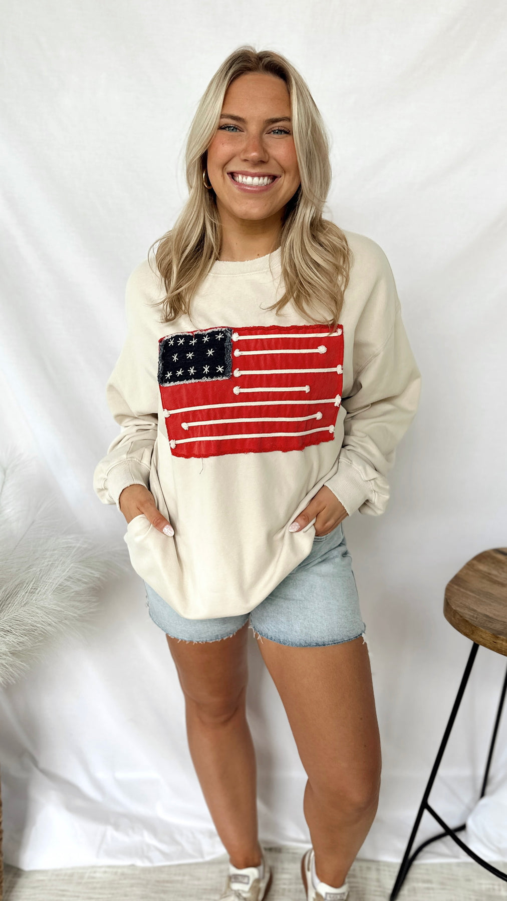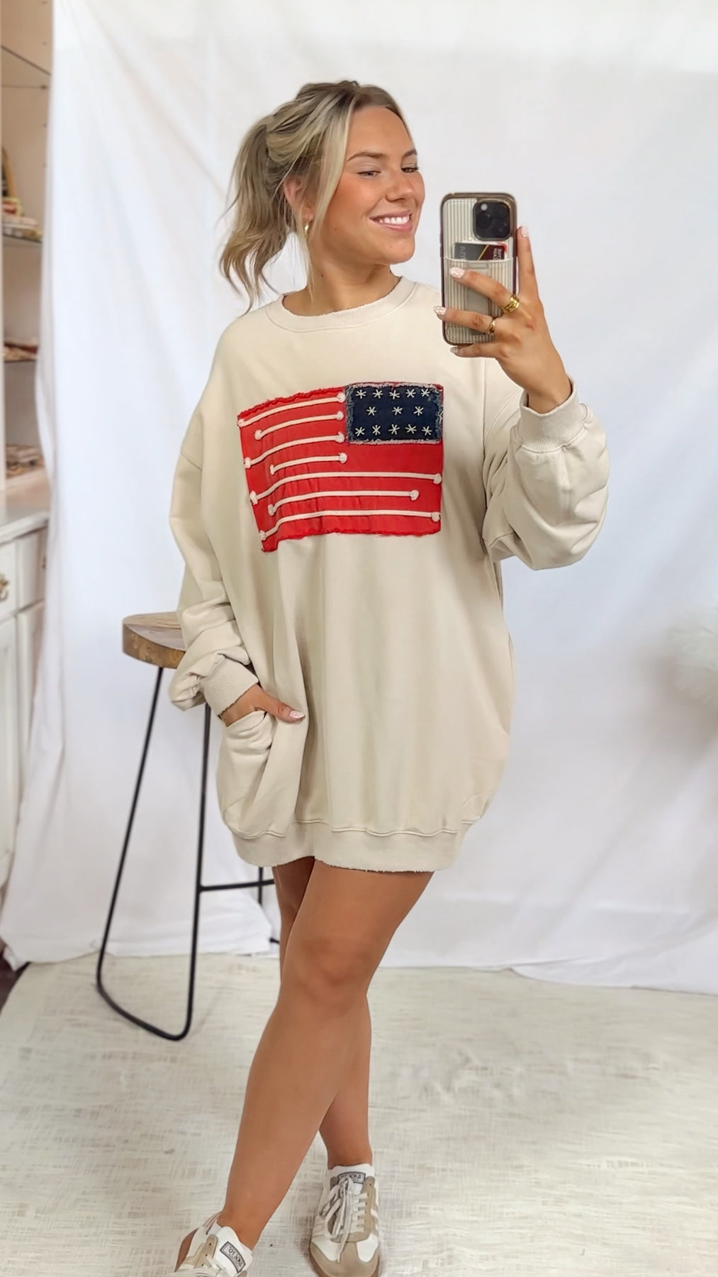 Cozy up with our Home Sweet Home Sweatshirt, featuring an oversized fit, pockets for your essentials, and a tan USA flag design. USA, USA, USA!