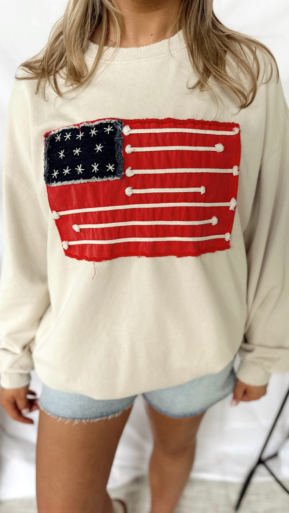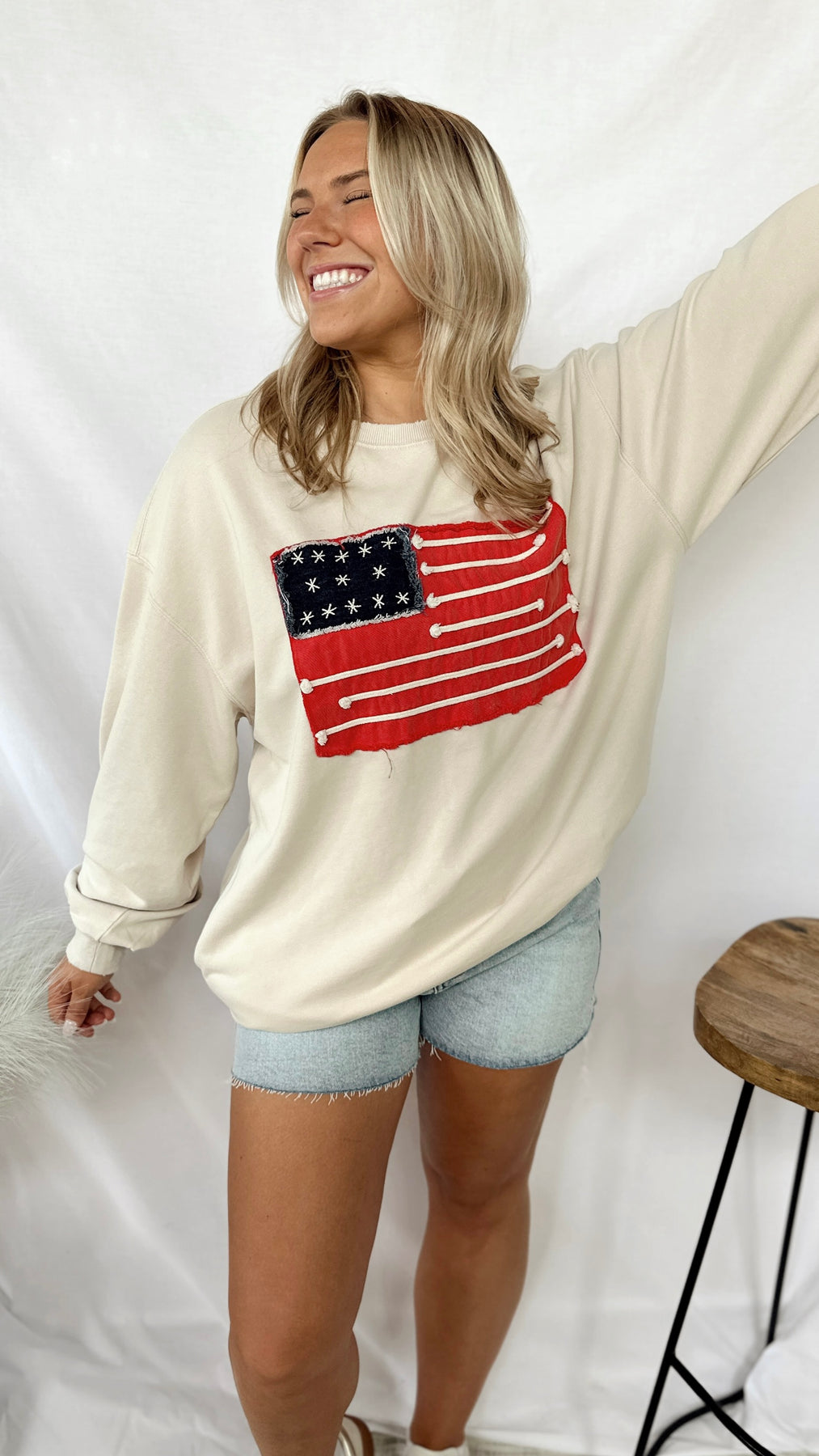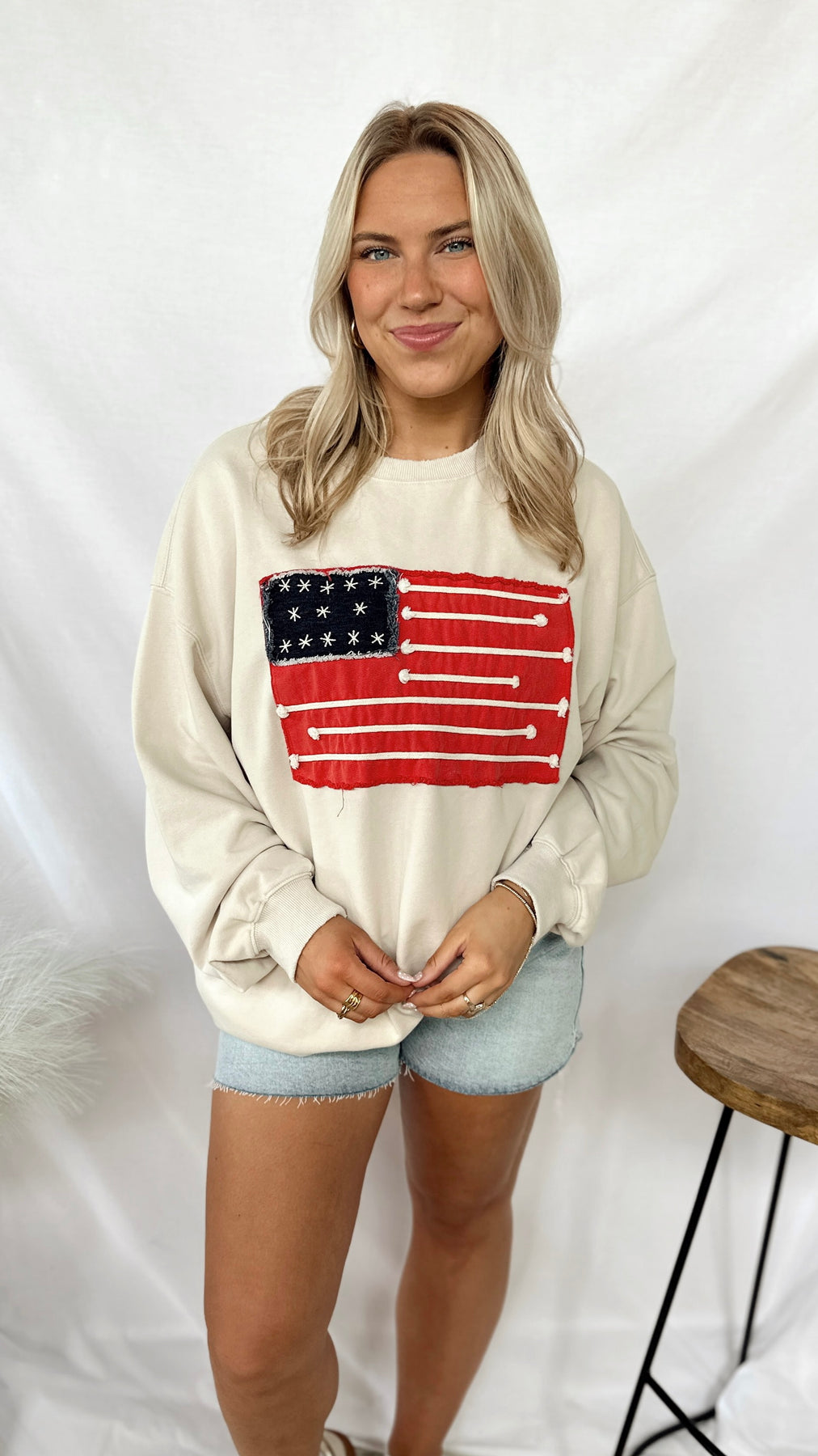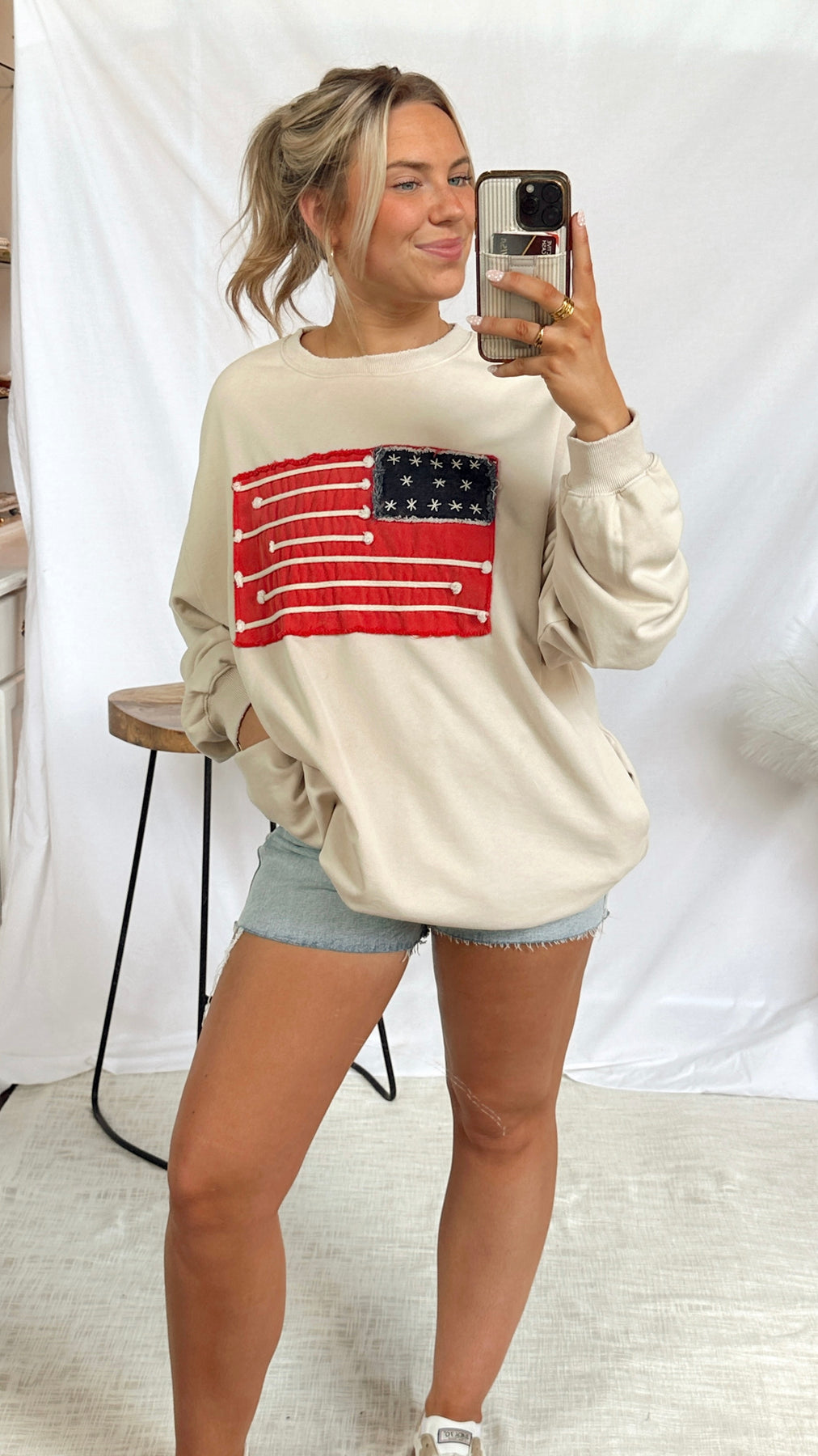 Cozy up with our Home Sweet Home Sweatshirt, featuring an oversized fit, pockets for your essentials, and a tan USA flag design. USA, USA, USA!