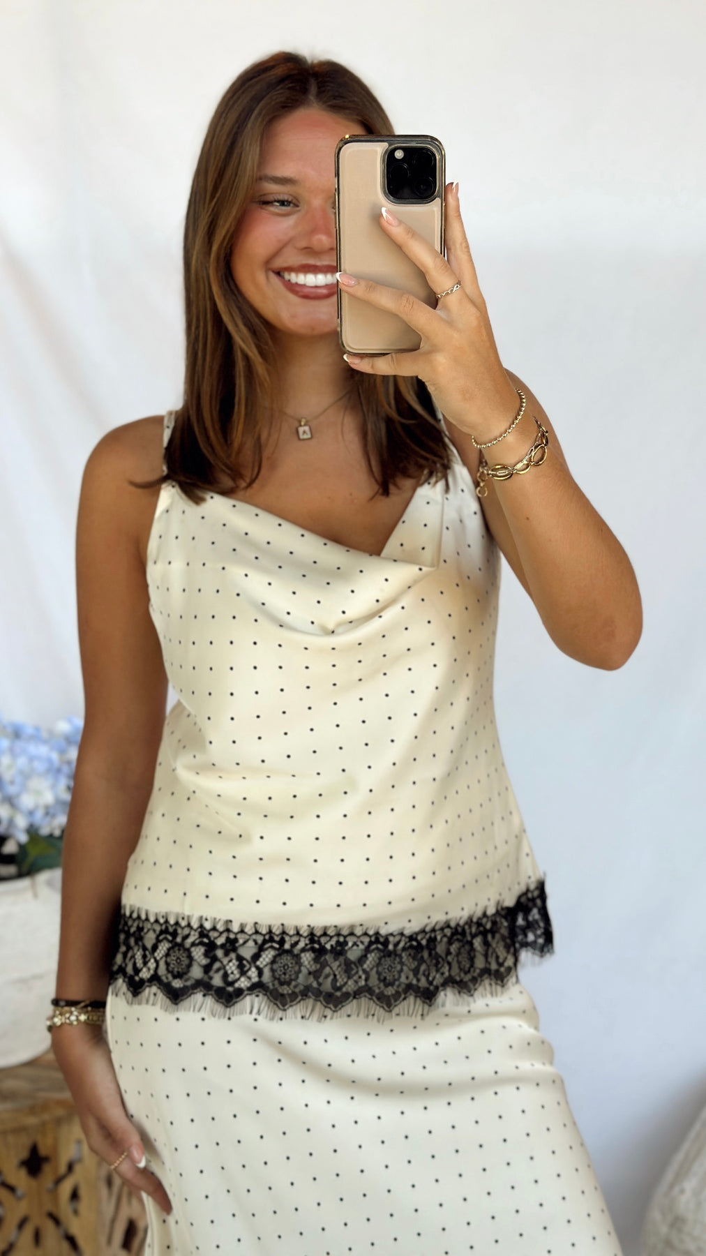Cream cowl neck tank top with black polka dots and black lace trim. Pairs perfectly with our Katie Skirt.