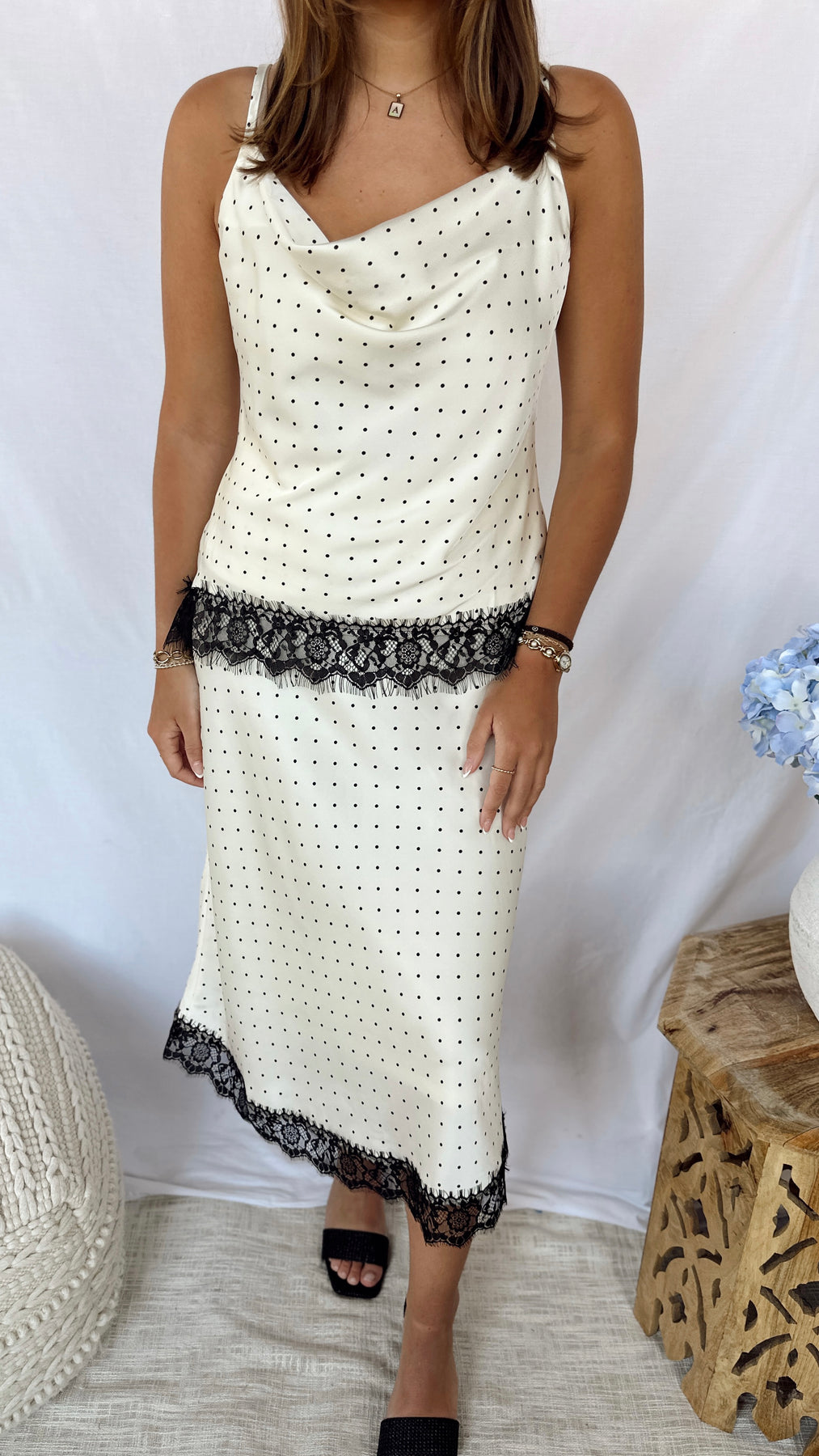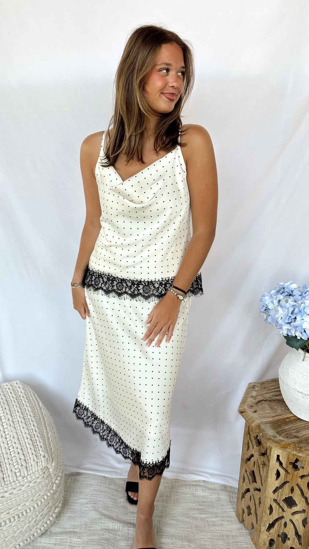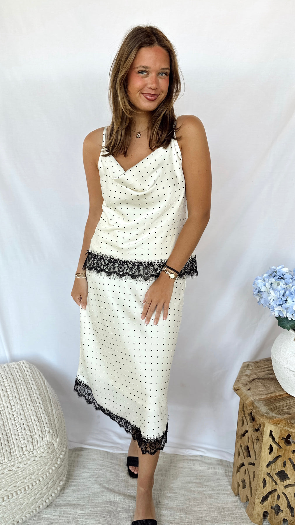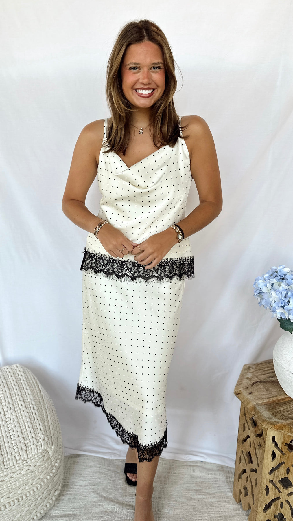 Cream midi skirt with black polka dots and black lace trim. Pairs perfectly with our Katie Tank.
