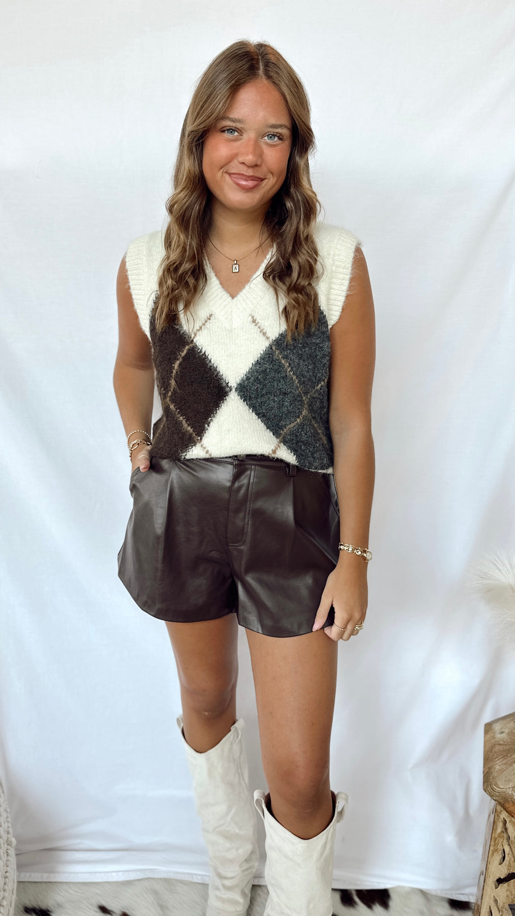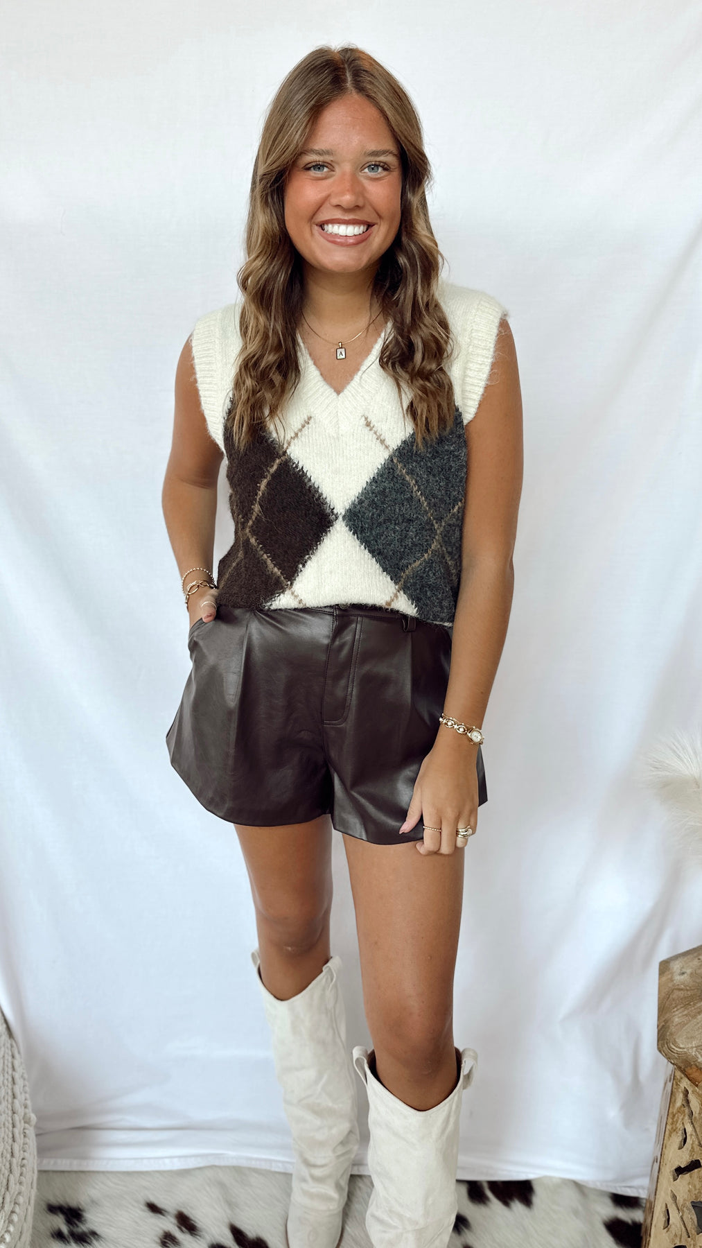 The Quinn Sweater Vest is a cozy and stylish cream-colored layer featuring a classic diamond pattern. Perfect for adding a touch of warmth and charm to any outfit, it’s easy to mix and match for a comfy, casual look that’s both fun and timeless.