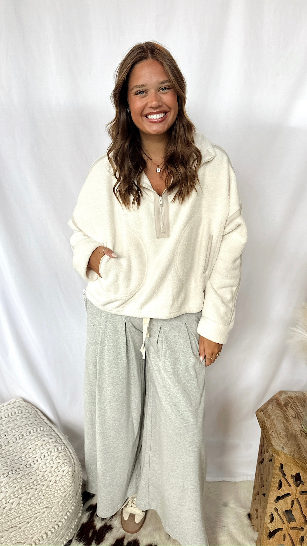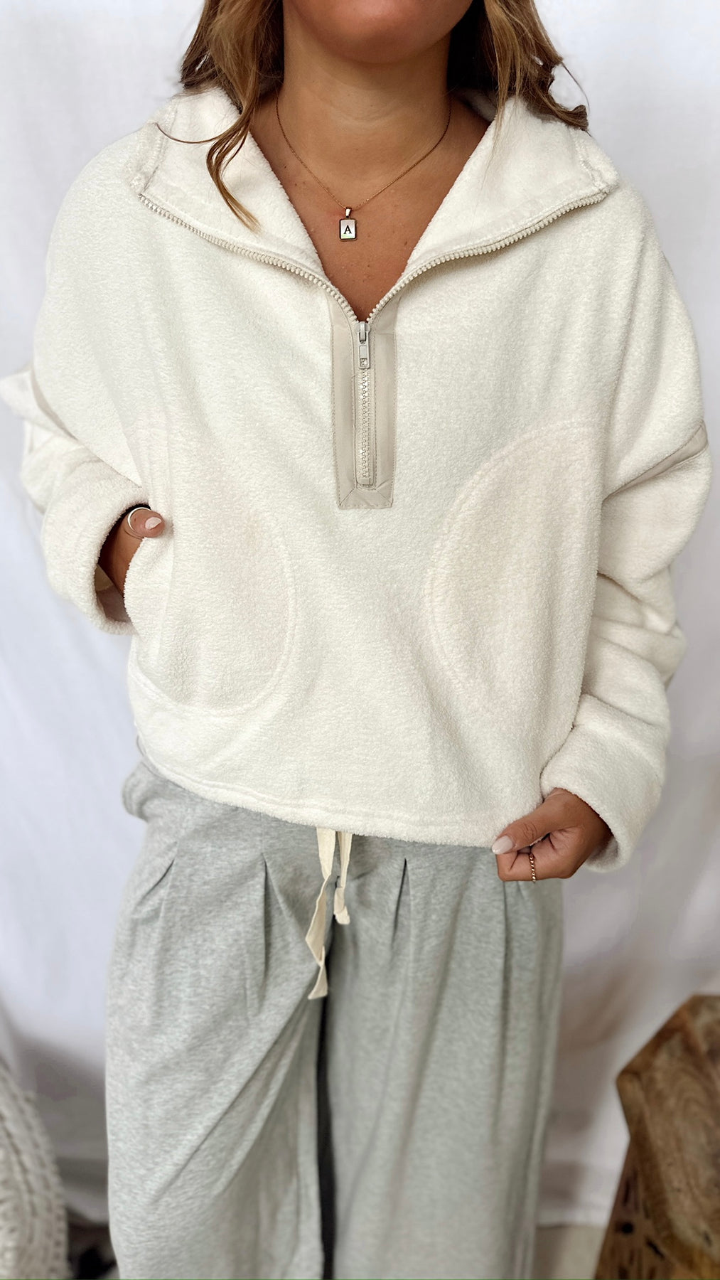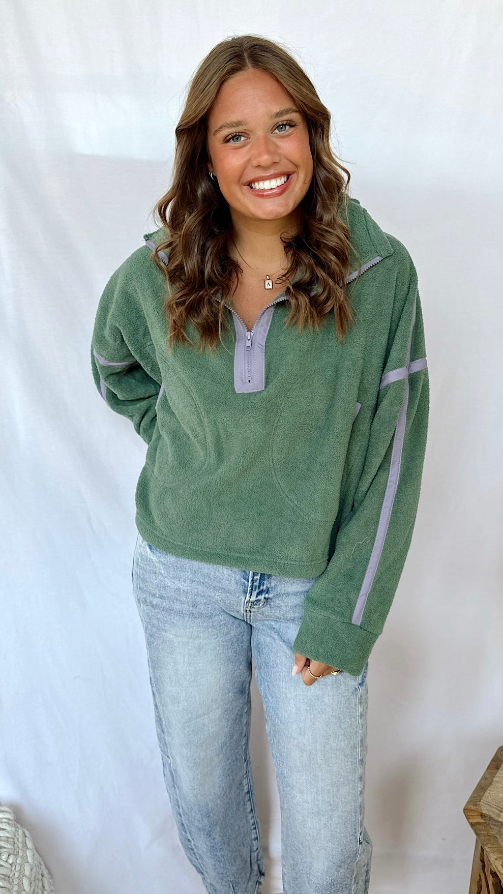 The Renee Quarter Zip is your new go-to for casual comfort with a twist. This comes in a green or cream-colored pullover features stylish taupe detailing on the front pockets, adding a subtle pop of contrast. Perfect for layering or wearing on its own, it combines cozy warmth with easy style for any fun day out.