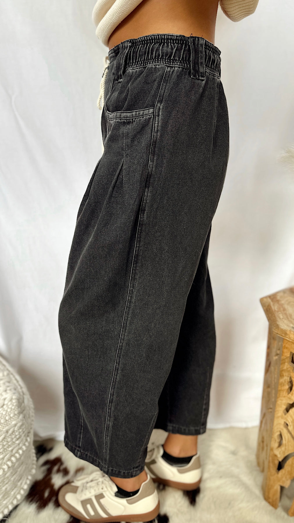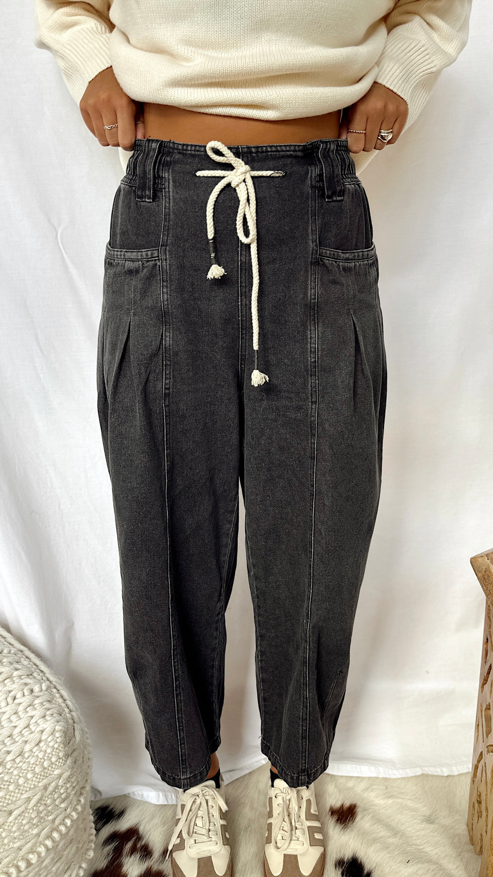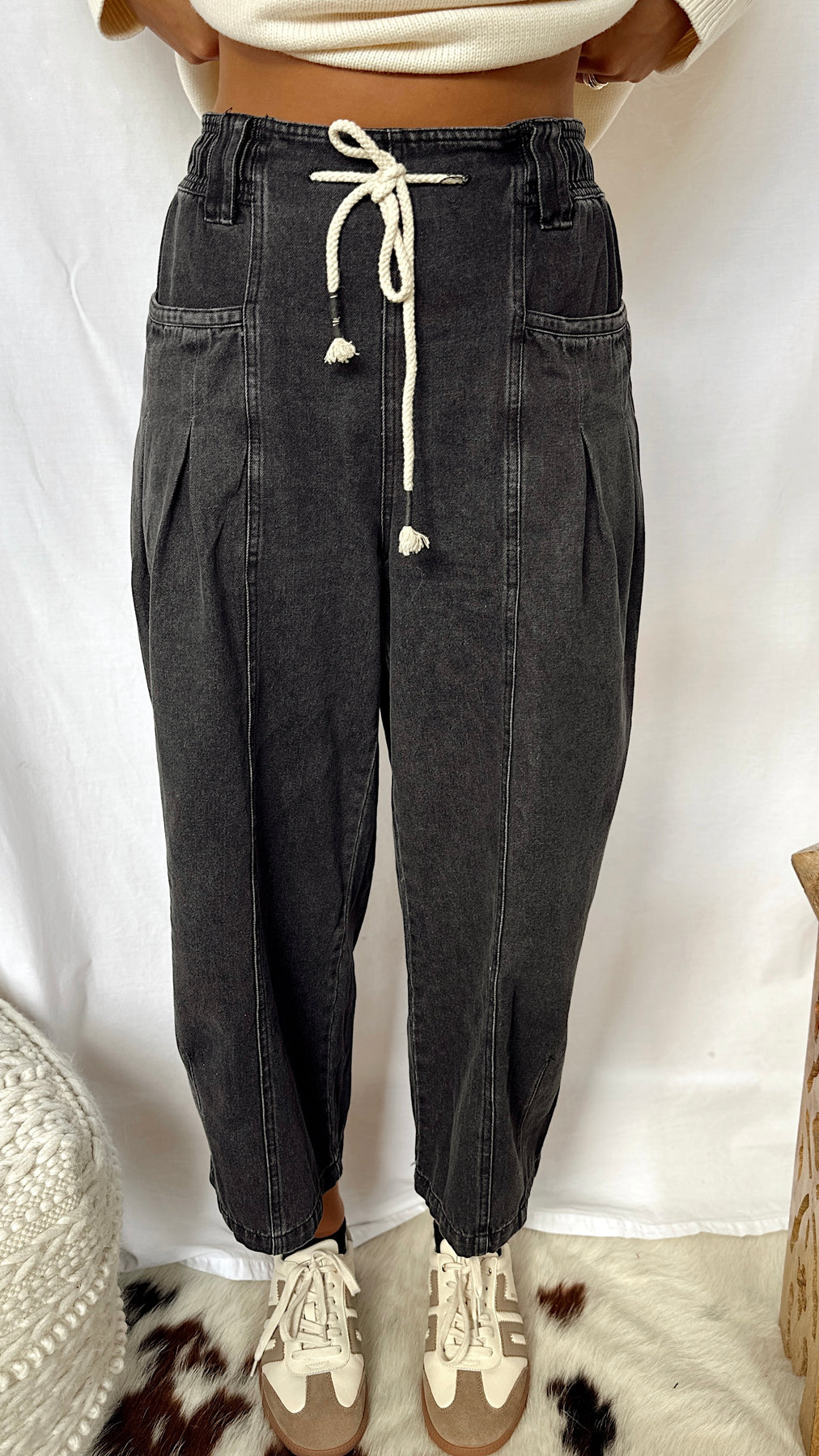 The Sadie Jane Pants bring a playful twist to classic denim. These black wide-leg barrel jeans feature roomy pockets and a trendy rope tie around the waist for an easy, laid-back vibe. Perfect for adding effortless style and comfort to your everyday look.