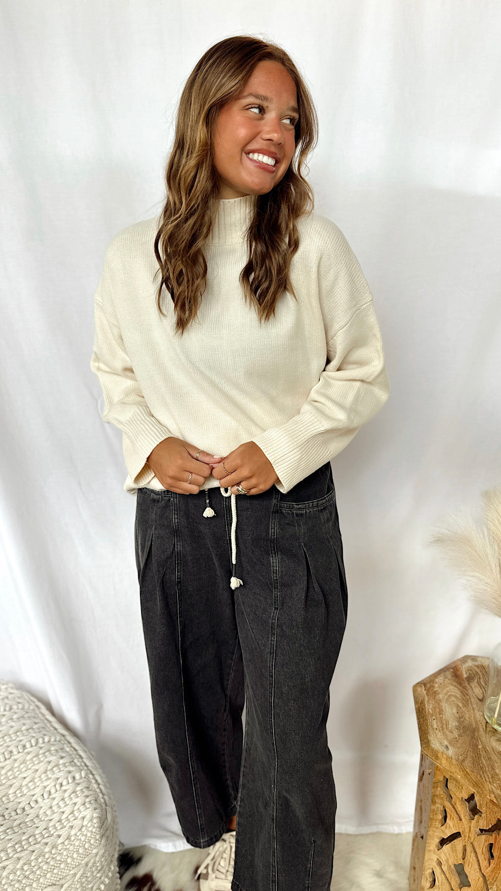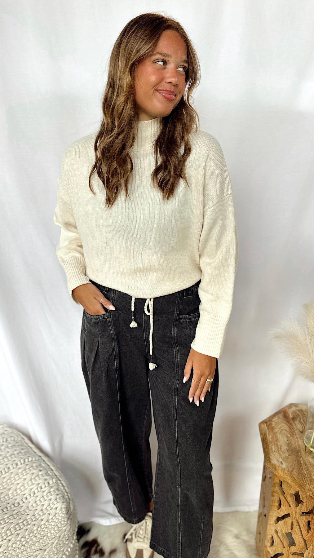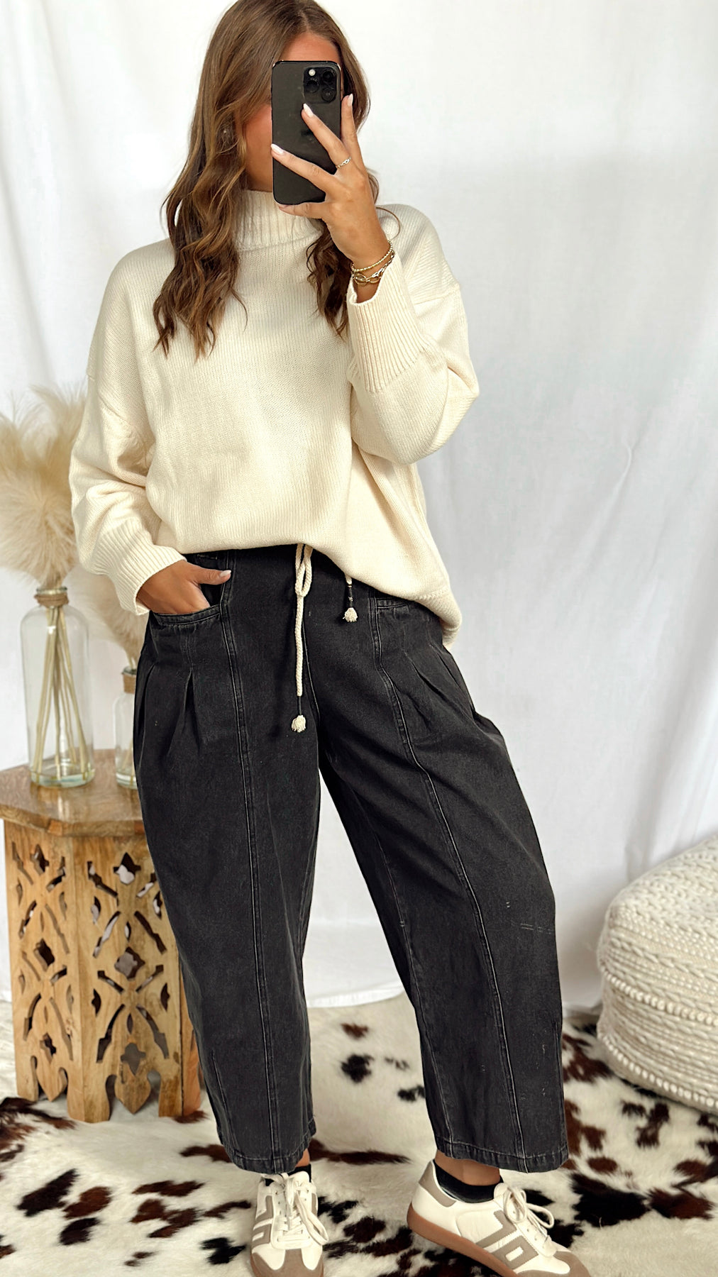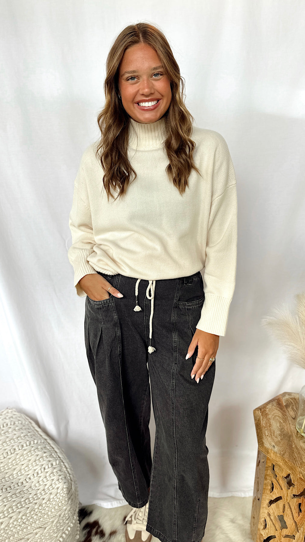 The Sadie Jane Pants bring a playful twist to classic denim. These black wide-leg barrel jeans feature roomy pockets and a trendy rope tie around the waist for an easy, laid-back vibe. Perfect for adding effortless style and comfort to your everyday look.