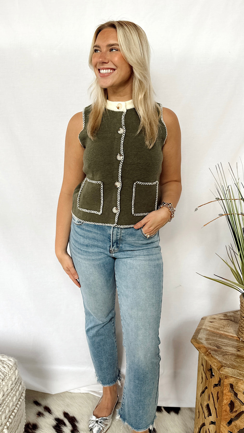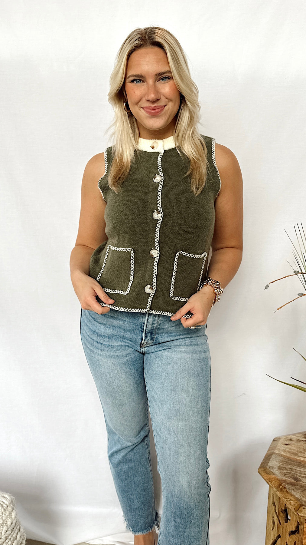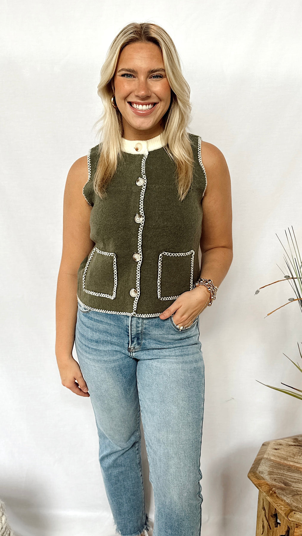 Add a pop of color with The Sadie Vest, featuring a vibrant green body complemented by a soft cream collar and matching cream stitching. This fun, easy-to-style vest adds cozy warmth and a playful touch to any outfit. Perfect for layering on cooler days with a fresh, simple look.