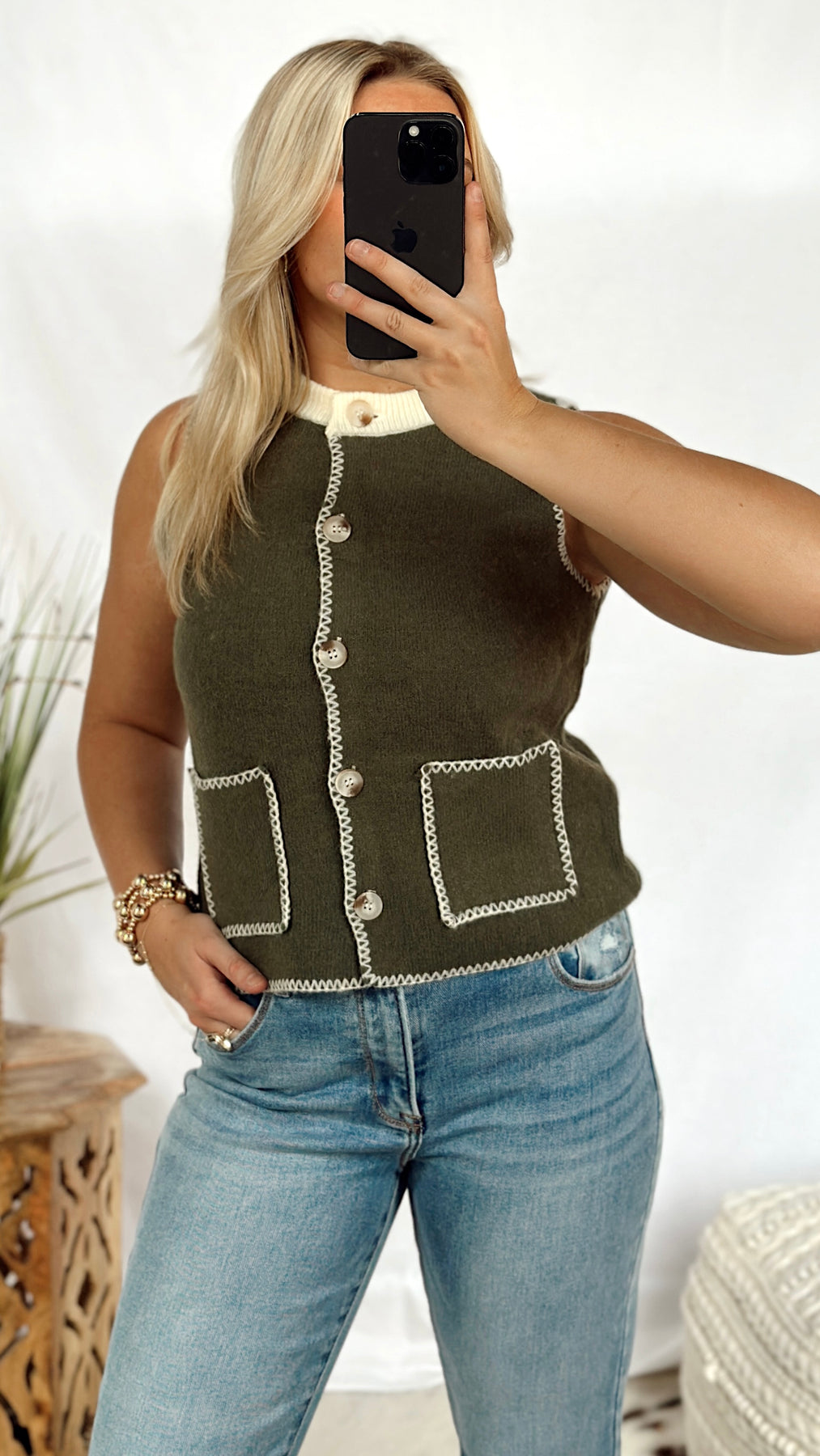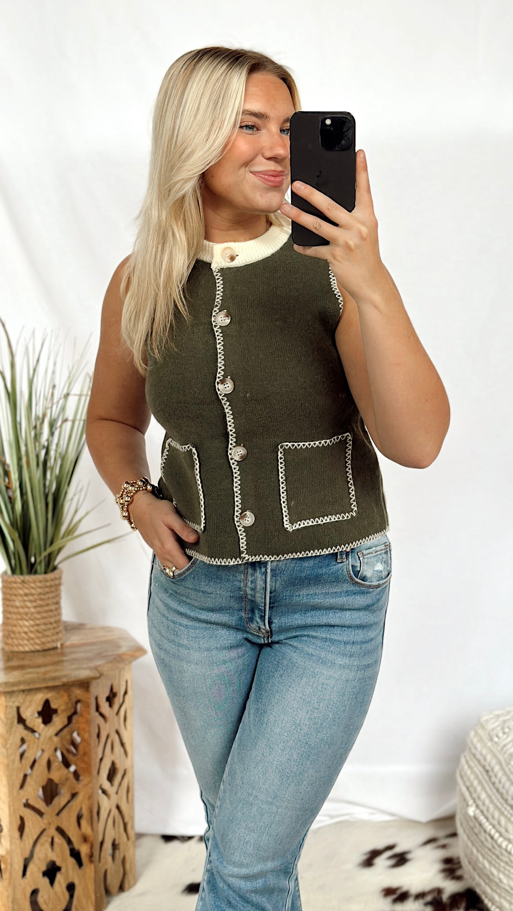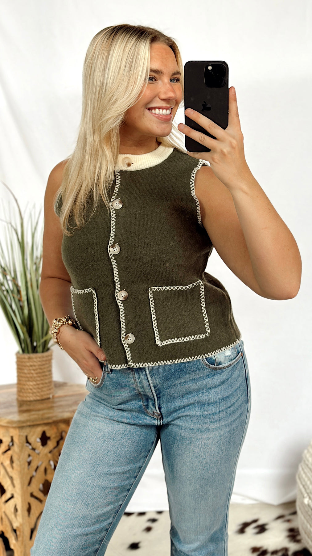 Add a pop of color with The Sadie Vest, featuring a vibrant green body complemented by a soft cream collar and matching cream stitching. This fun, easy-to-style vest adds cozy warmth and a playful touch to any outfit. Perfect for layering on cooler days with a fresh, simple look.
