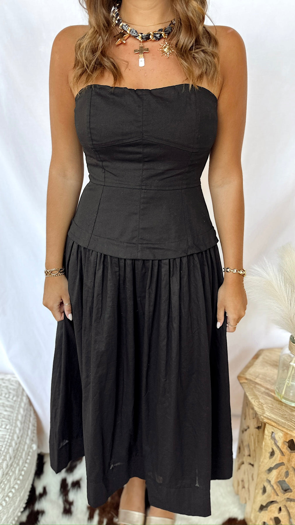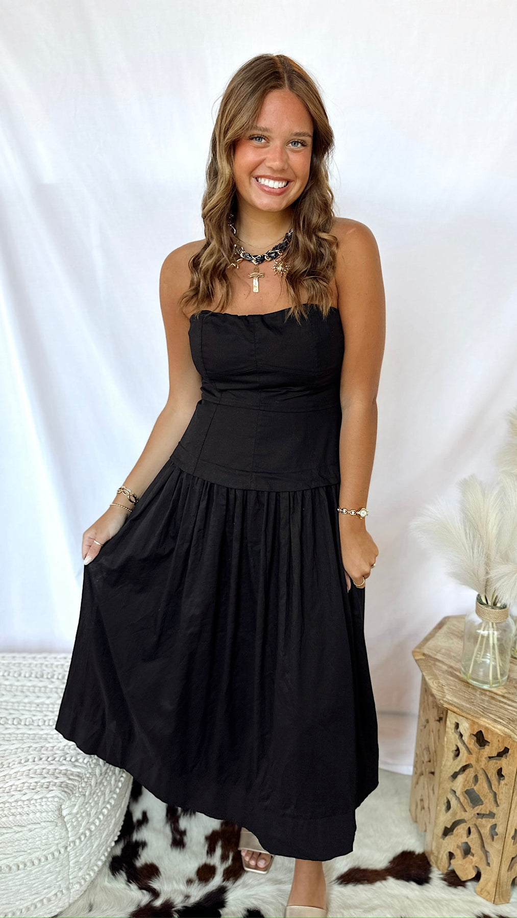 Turn heads effortlessly in The Saturday Night Dress, a sleek black strapless maxi that blends elegance with a playful vibe. Its flowing silhouette moves gracefully with you, perfect for dancing the night away or making any evening unforgettable. Simple, stylish, and ready for your next adventure!