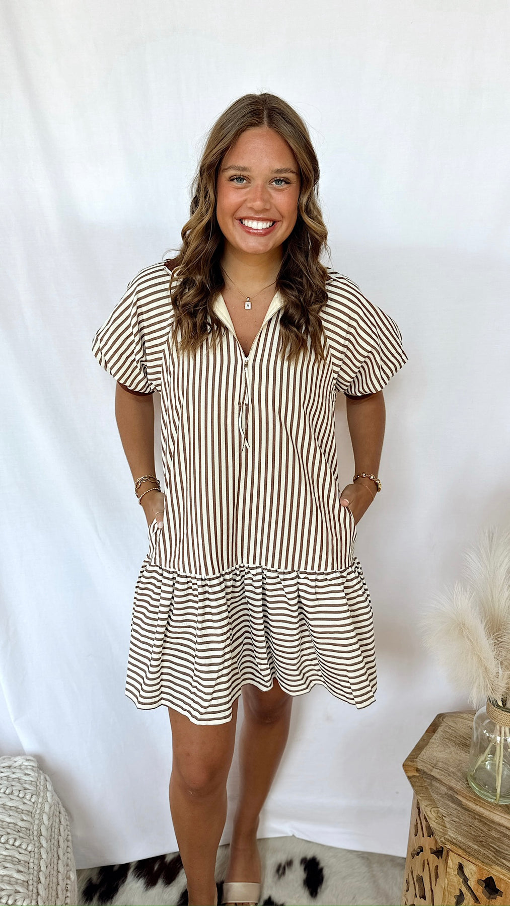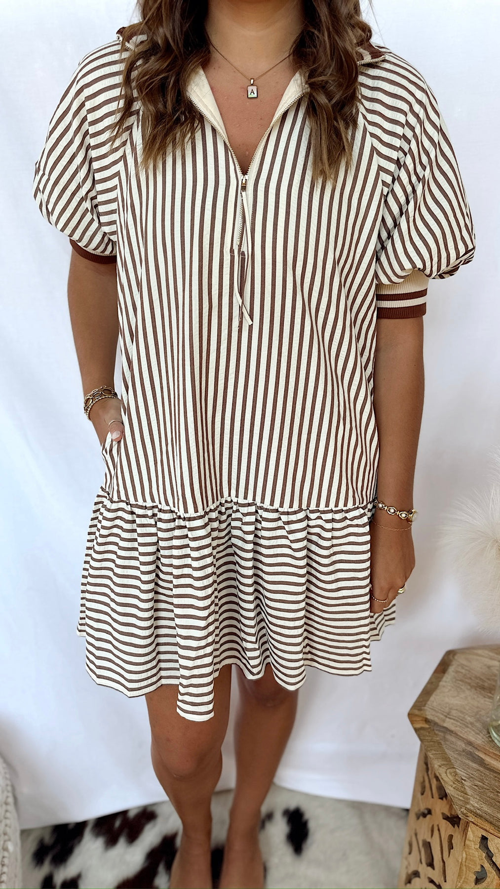 The Shull Dress combines playful charm with effortless style. Its cream and brown stripes create a fresh, eye-catching look, while puff sleeves add a touch of fun. Featuring a convenient collar zip-up and delicate ruffle detail at the hem, this dress is perfect for sunny days or casual outings. Easy to wear and full of personality, it’s a delightful addition to your wardrobe.