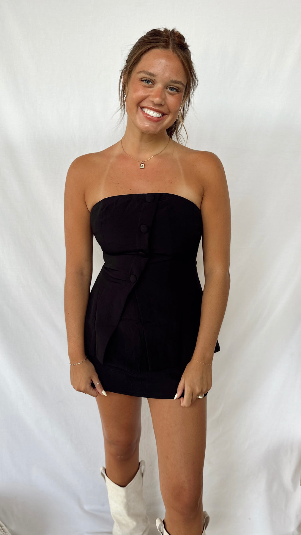 The Stella Romper features a playful front button detail and a sleek tube silhouette, combining style and ease. With a built-in shorts lining, it offers comfortable coverage for all your moves.