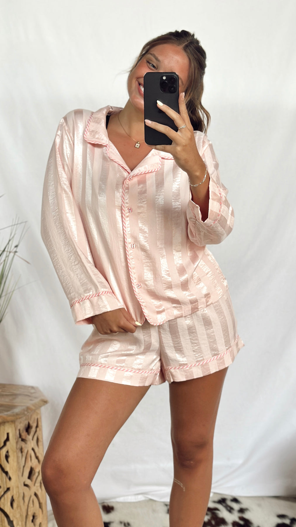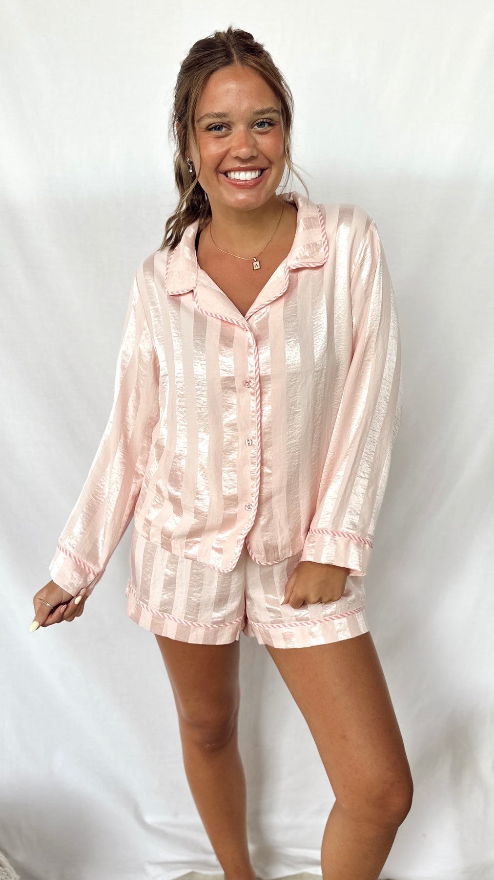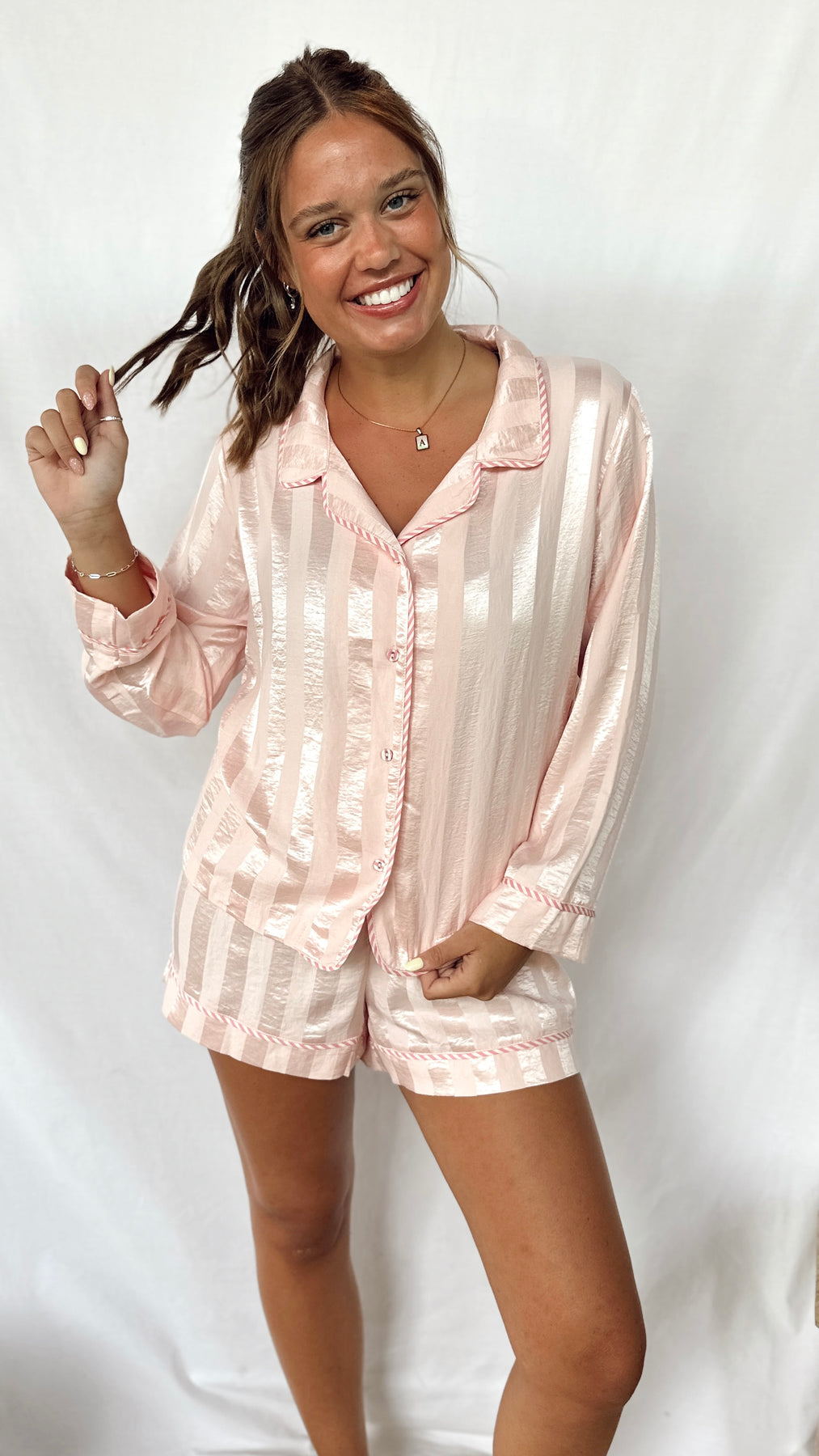 Enjoy cozy nights in The Sweet Sugar PJ Set, featuring a playful pink top paired with shorts adorned with pink and white striped details. The shorts are finished with a charming striped bow, adding a touch of fun to your loungewear. Perfect for comfort with a sweet style.